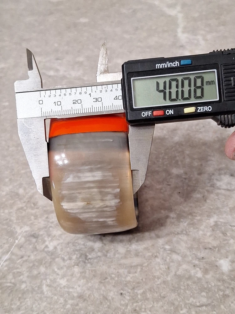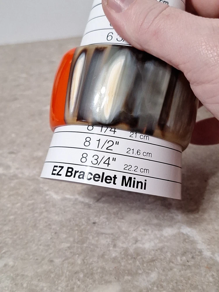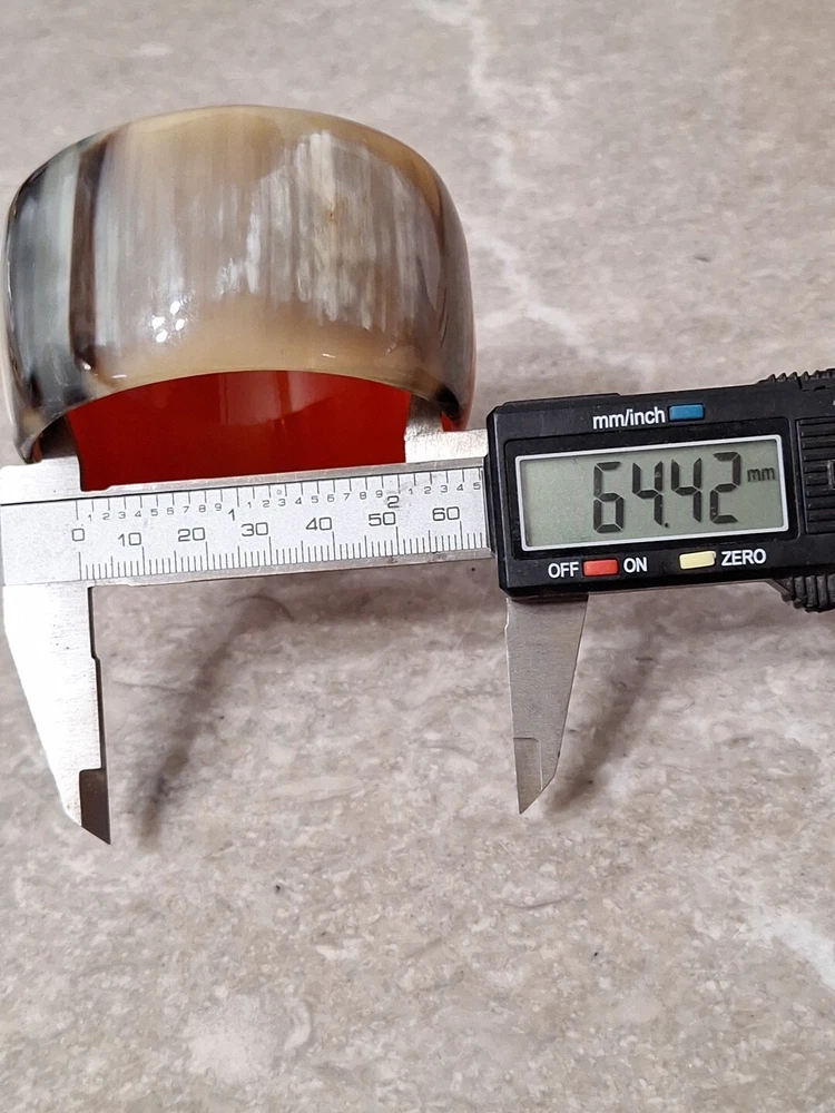 Bracelet is in very good condition. There are 2 small chips in the orange paint. It is 40mm wide. The opening is 64mm wide, just over 2.5 inches. It is a really nice example of an old horn bracelet.
