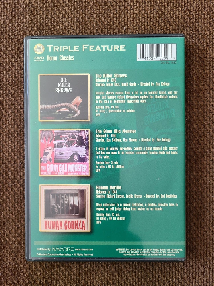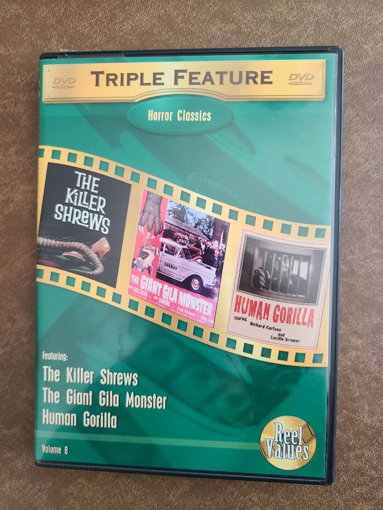 Three movies on a single dvd. Includes "The Killer Shrews," "The Giant Gila Monster," & "Human Gorilla." I don't think this was ever viewed - looks new. From my smoke-free home. No stock photos. Ships with USPS Media Mail.