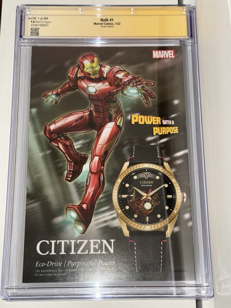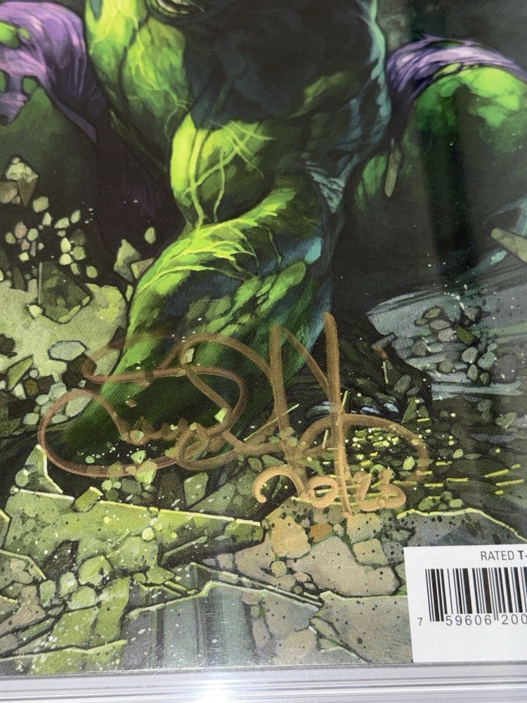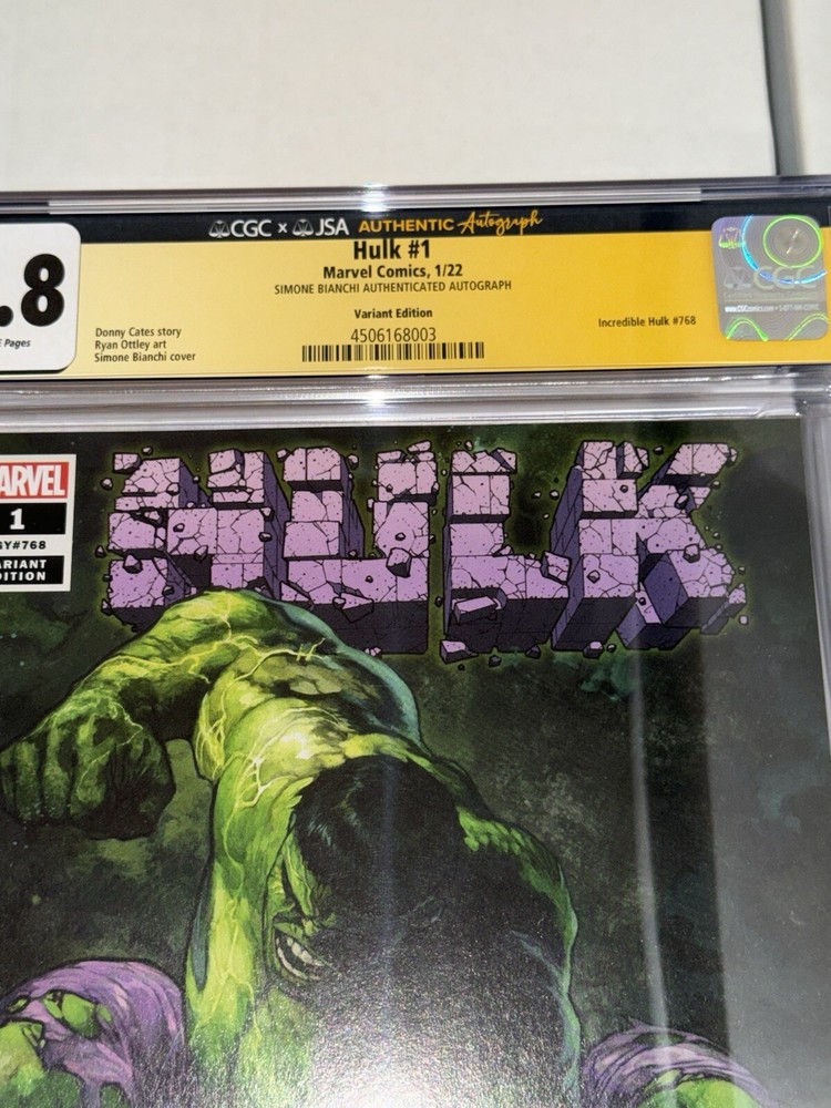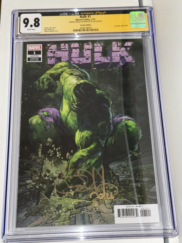 Hulk #1 CGC JSA 9.8 Simone Bianchi Autographed 1:25 Condition is new. Check pics for any imperfections. Please understand that CGC cases may have scuffs, scratches, or other imperfections that come from CGC directly. Each are housed in a sleeve and packaged carefully. 1 FREE comic book will be included in your order from publishers such as DC, Marvel, Scout, Boom, etc. The FREE book could be a trade or virgin in various condition. This rare and highly sought-after comic book features an incredible creative team, including Donny Cates, Ryan Ottley, and Simone Bianchi. The first printing of Hulk #1 with a variant cover is a must-have for any collector or fan of the Marvel Cinematic Universe. The comic book is in 9.8 Near Mint/Mint grade, certified by the Certified Guaranty Company (CGC). It includes an impressive list of superheroes, including the Defenders, Avengers, and Fantastic Four, as well as fan-favorite characters like Spider-Man, Iron Man, and Captain America. The comic book is a single issue with white pages and features an autograph authentication for the signed copy. This United States comic book is perfect for a general audience and is sure to be a valuable addition to any collection.