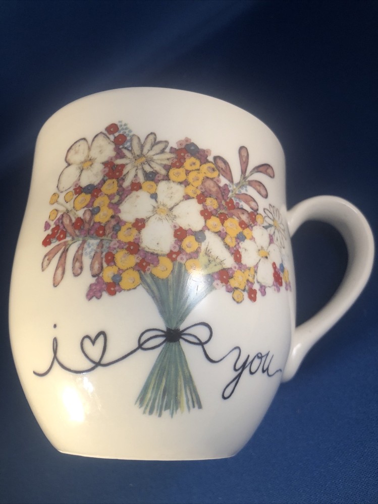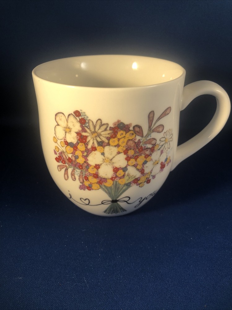 Here is a Creative Co-Op White Coffee Mug NEW. It has I Love (Heart) You With a Flower Bouquet on a white mug. It is about 4" tall and 3 3/4" across top. Original store sticker on bottom.
