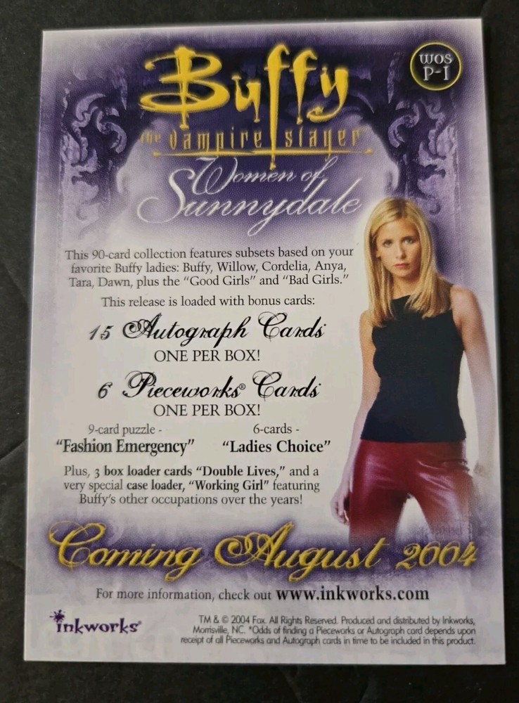 This rare INKWORKS Buffy Vampire Slayer Season 5 Promo card features a hard-signed autograph from the beloved TV show's creator, Joss Whedon. The card is made of high-quality card stock and is an original, licensed reprint from 2004. It is a 1st Edition and has not been graded. The card is perfect for collectors of non-sport trading cards, especially those who are fans of the Buffy the Vampire Slayer franchise. It features the iconic character Buffy and the card number WOS-PI. This item is a must-have for any fan of the show and is sure to be a valuable addition to any collection.