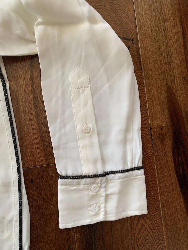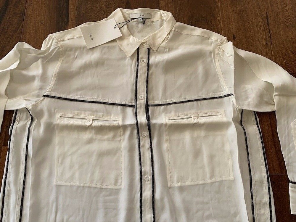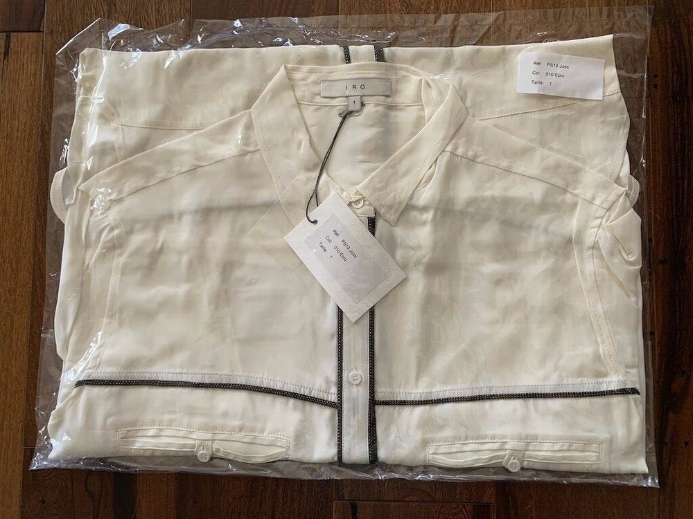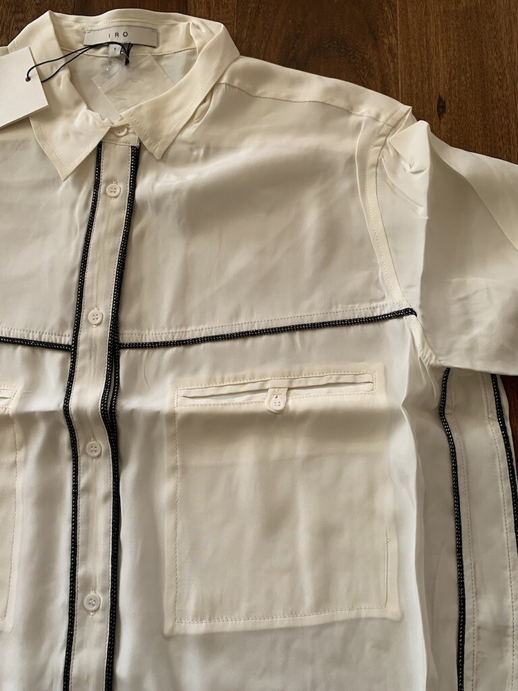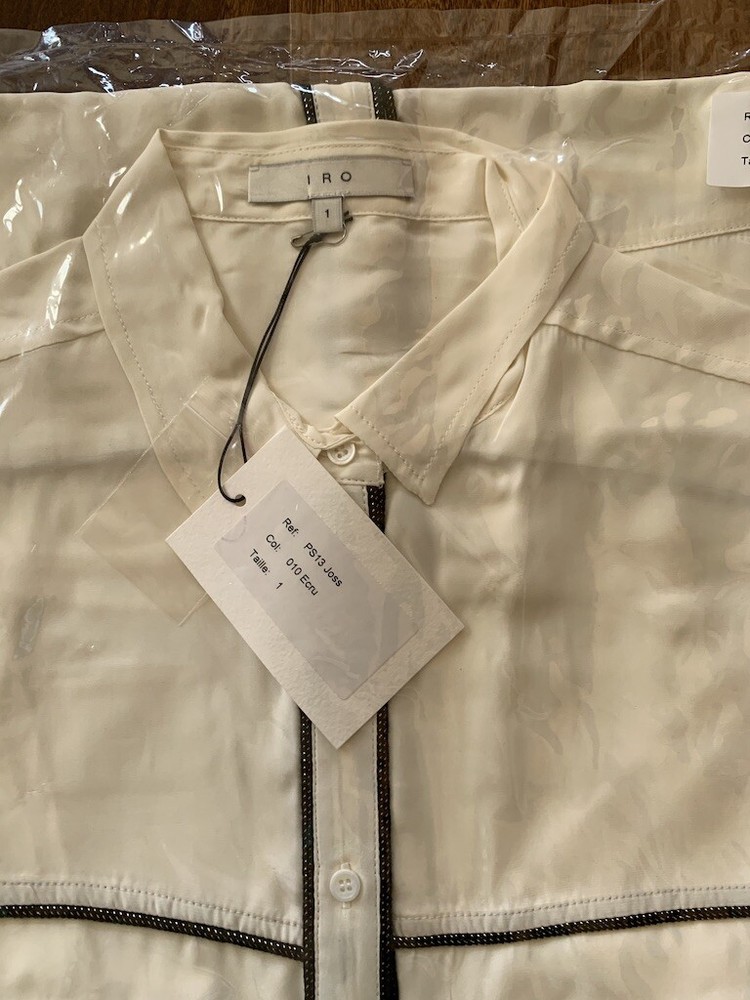 IRO Joss Blouse New with Tags Size 0 100% Silk IRO Joss Blouse Button down front shirt with long sleeves. Beautiful black and gold trim, the pictures of this shirt does not do it justice because it is so soft and elegant. I took pictures of size 1 in this shirt but this listing is for size 0 only. About the Brand: Launched in 2002 by French brothers Laurent and Arik Britton, IRO combines vintage-inspired prints with city style. Their collection features an ever-changing color palette and styles that range from wardrobe staples to on trend pieces.