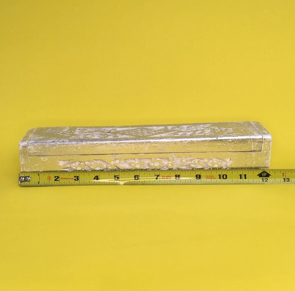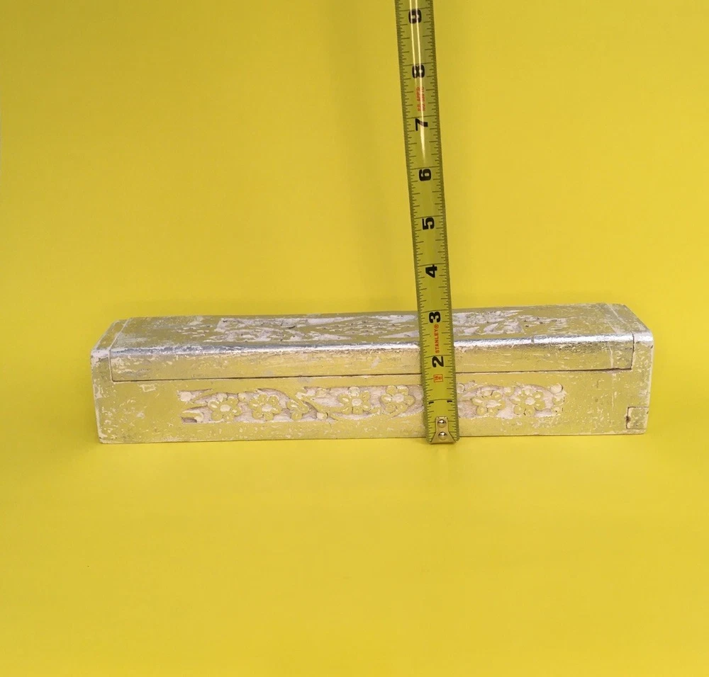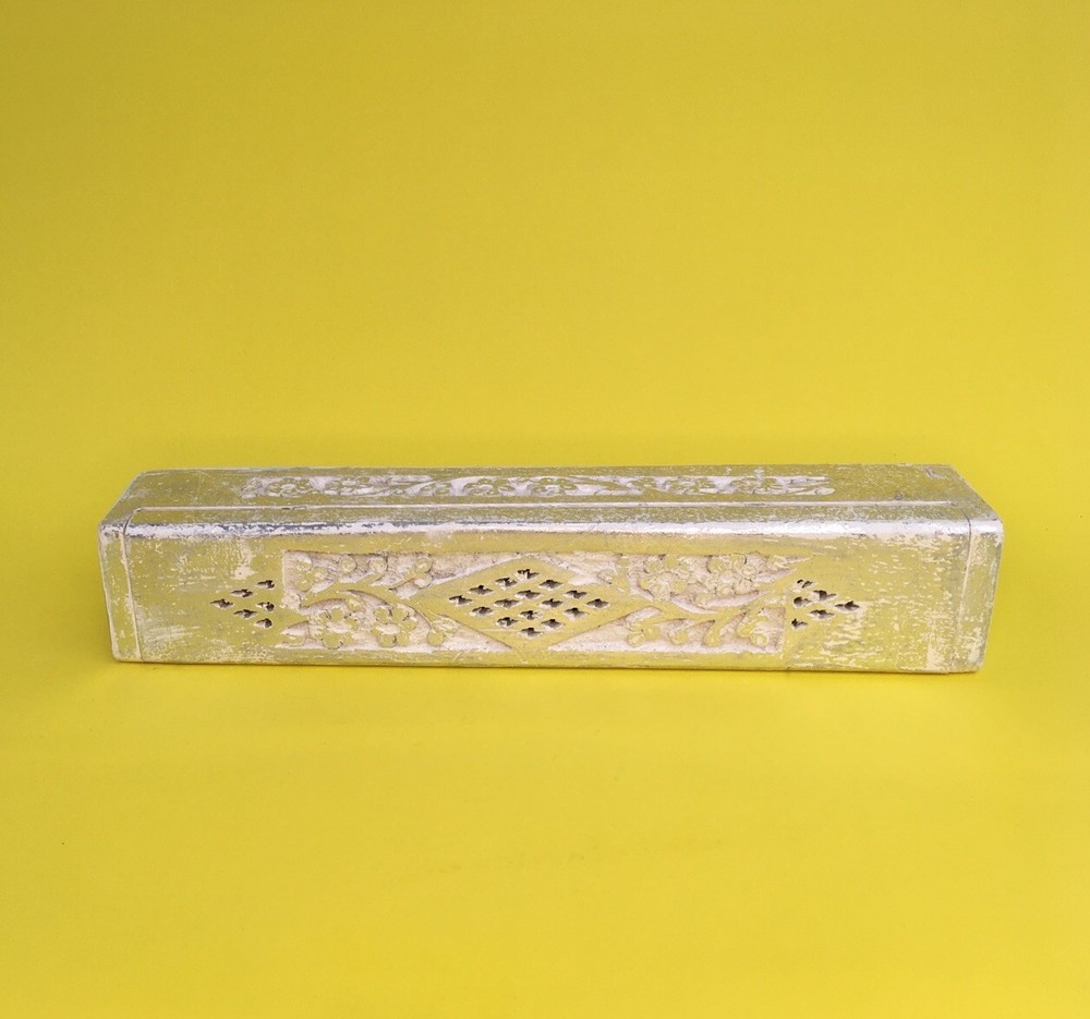 Painted and carved wood incense holder for stick or cone incense Bright silver, with a separate compartment for matches or extra joss sticks Also useful for potpourri...