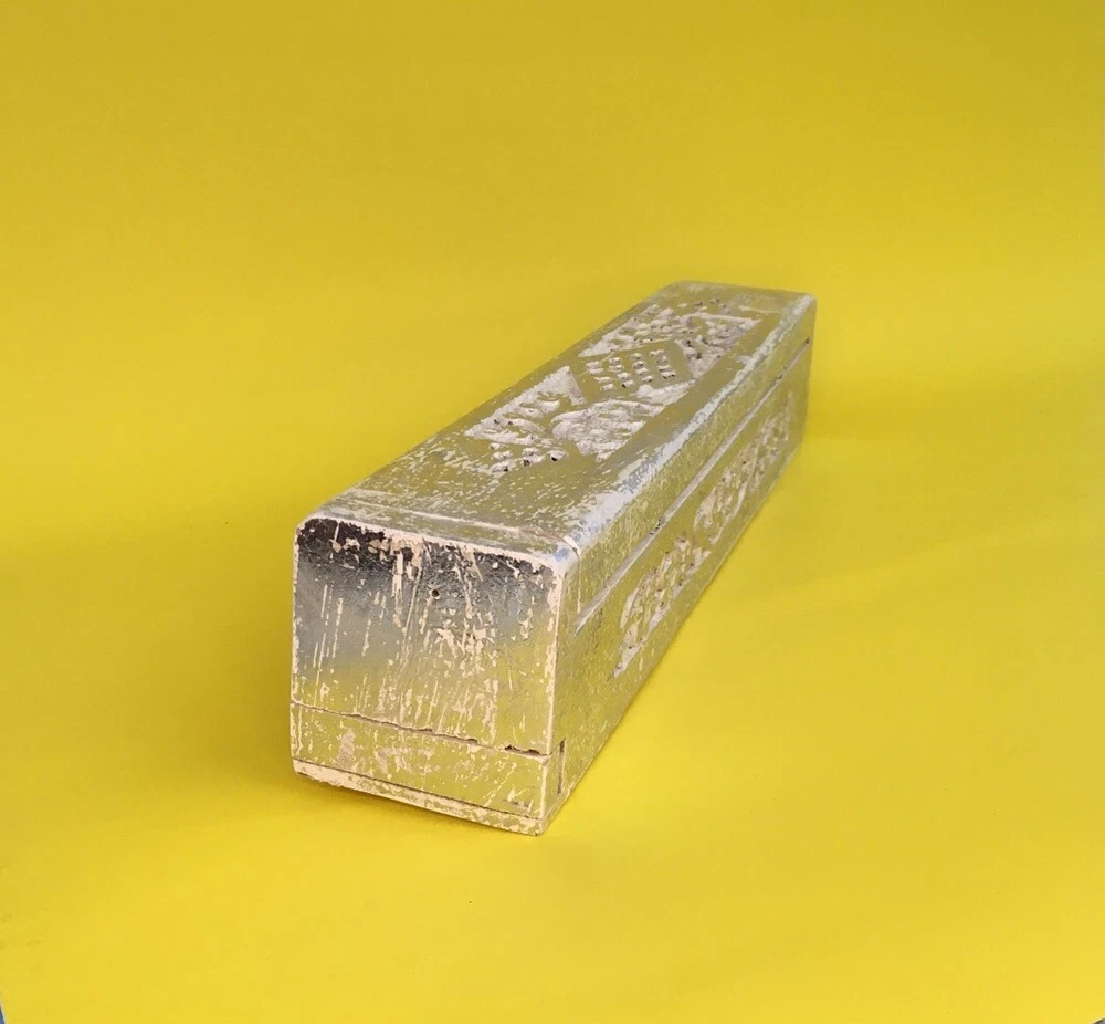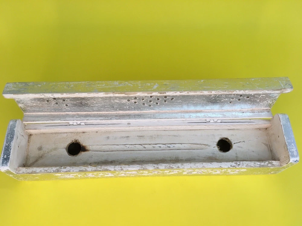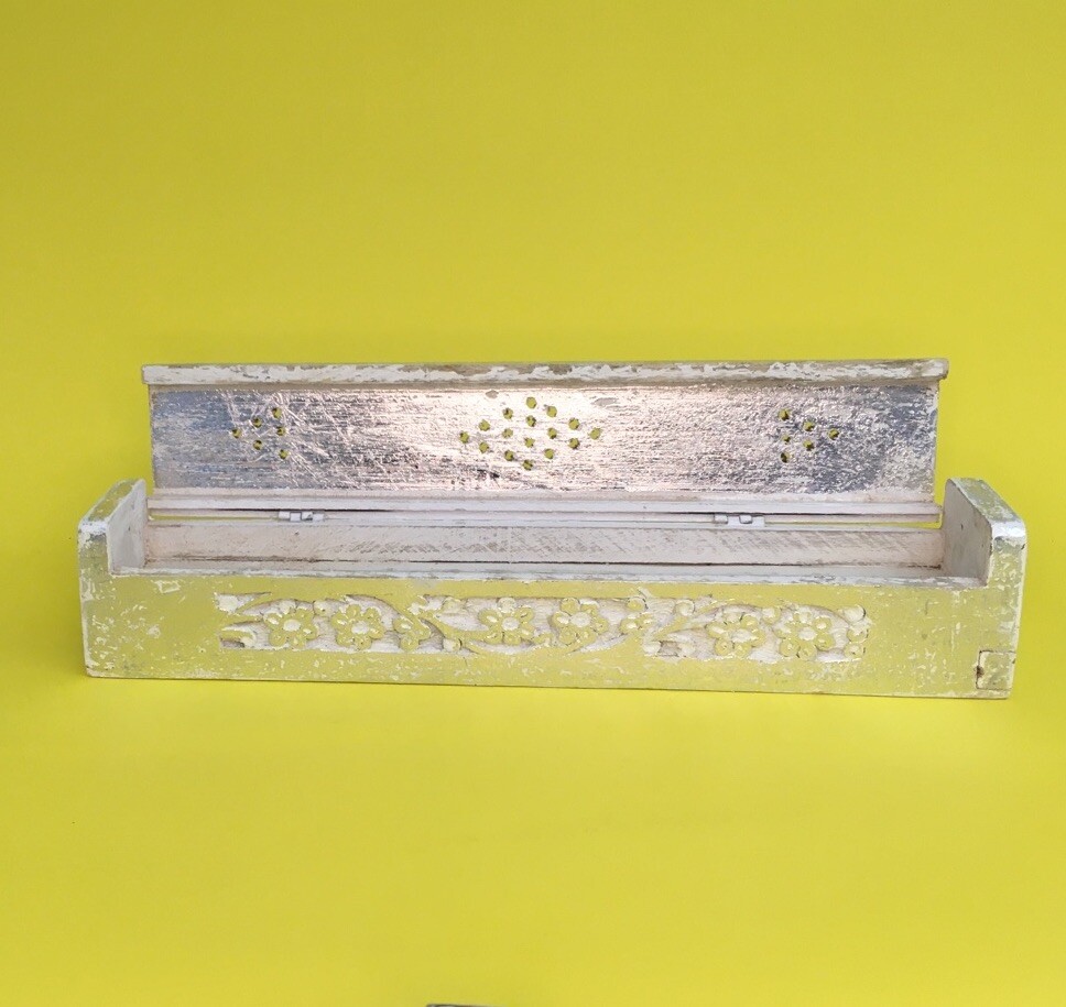 Painted and carved wood incense holder for stick or cone incense Bright silver, with a separate compartment for matches or extra joss sticks Also useful for potpourri