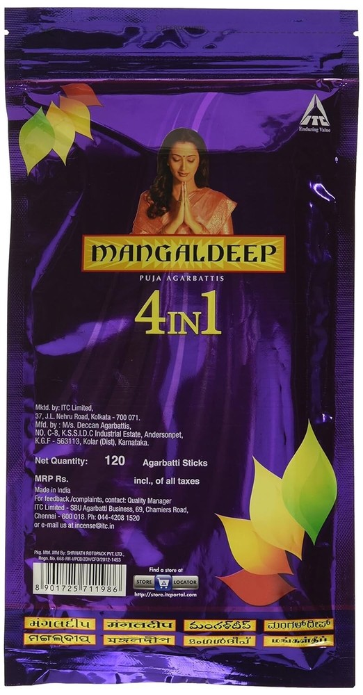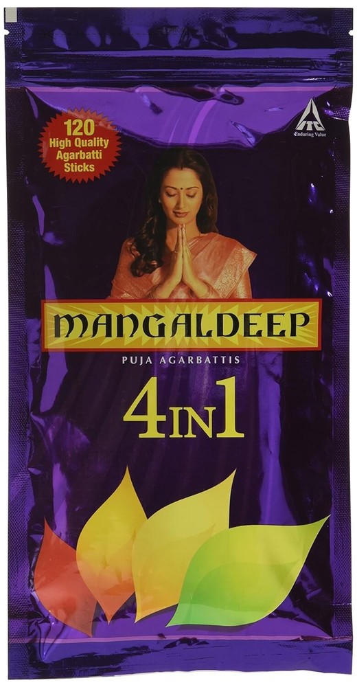 Mangaldeep 4 in 1 Agarbatti Ziplock - 120 Sticks Mangaldeep 4 in 1 Agarbatti Ziplock - 120 Sticks Four unique fragrances in a single pack from Mangaldeep brand for your daily puja. Its delightful fragrance makes every prayer a special experience. The fragrance spreads throughout the room and creates an auspicious environment. Start your day with Mangaldeep Puja Agarbattis. Premium Quality Agarbattis How to Use Hold the Agarbatti at the uncovered end of the stick and light the other end using a matchstick Hold the flame for sometime until the stick ignites If you see a glowing amber, then the incense stick is burning properly. If you do not see anything, and the tip looks ashy, then you will need to relight the stick. If the agarbatti is still burning even after seeing the amber then gently blow out the flame Keep the burning stick away from flammable materials