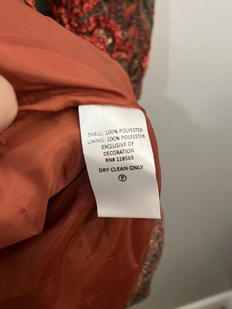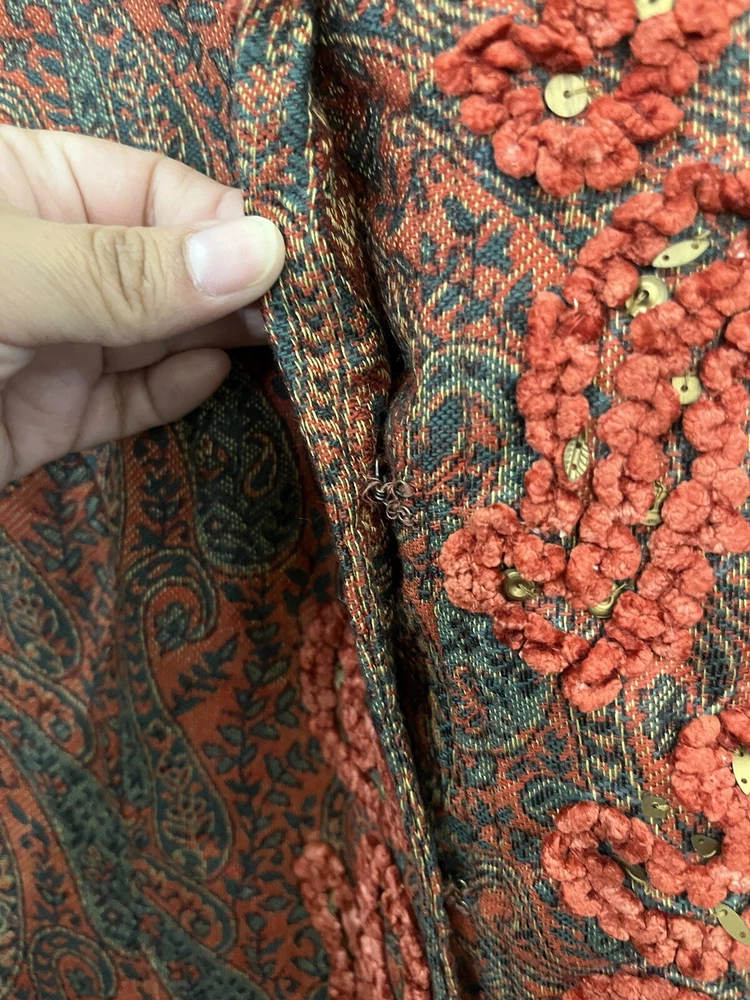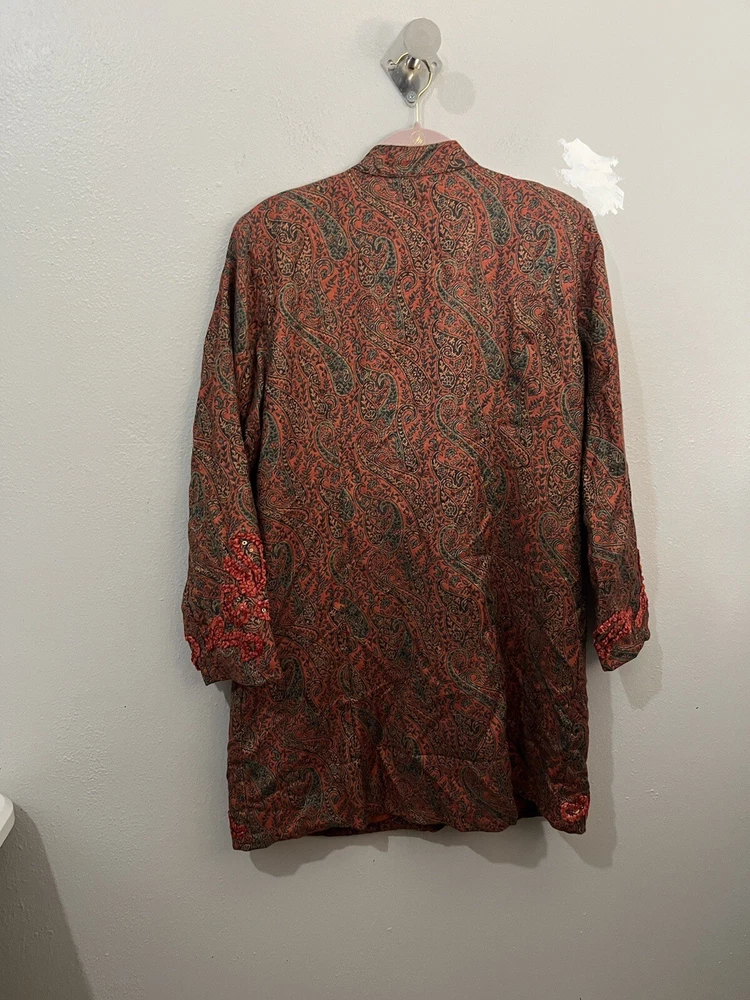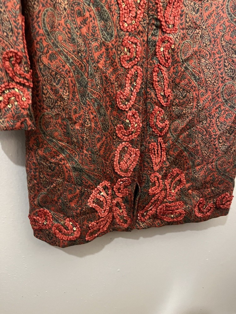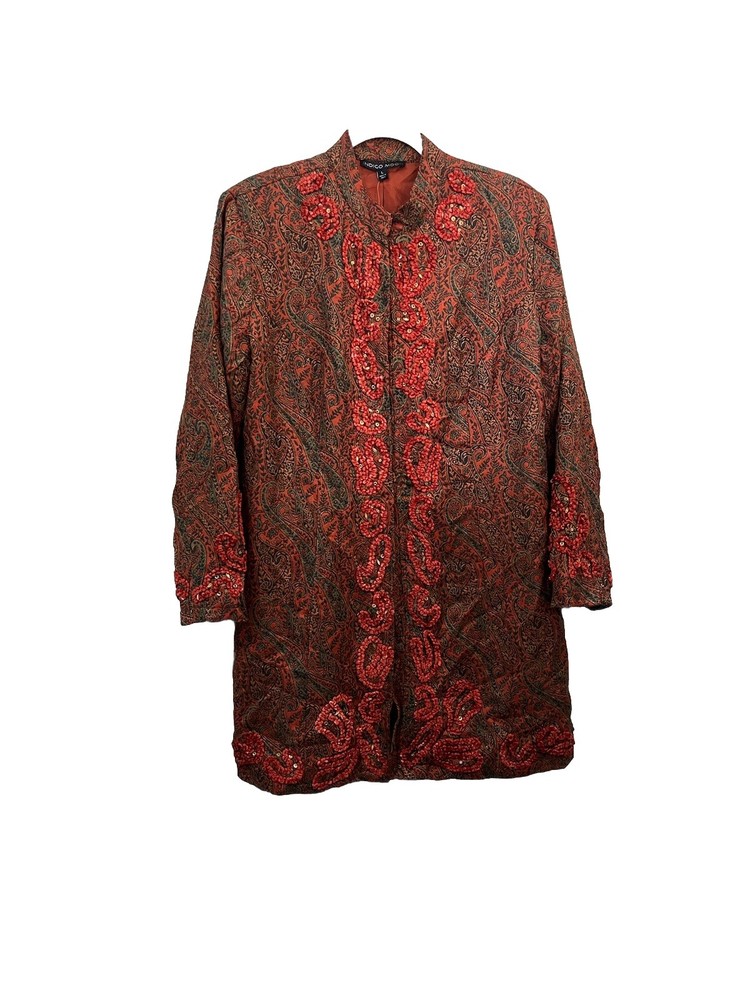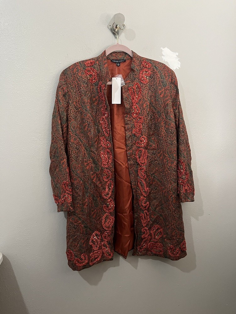 Indigo Moon Embroidered And Beaded Mid Length Jacket Mock Neck Rust Orange Large New with tags no flaws Chest flat on table 22 inches Shoulder to hem length 34 inches