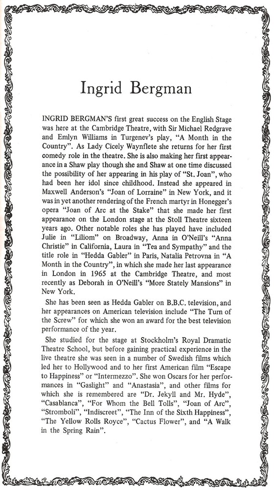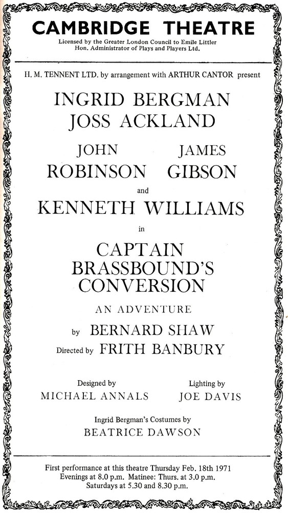 This is a rare programme (playbill) from the West End revival of the BERNARD SHAW play "CAPTAIN BRASSBOUND'S CONVERSION" at the Cambridge Theatre in London. (The revival opened February 18th, 1971.) ..... The play starred INGRID BERGMAN and JOSS ACKLAND and featured JOHN ROBINSON, JAMES GIBSON, KENNETH WILLIAMS, DINO SHAFEK, LOUIS MANSI, HILARY MINSTER, MICHAEL LEE PARKER, JOHN KENNEDY, CONRAD ASQUITH, RAYMOND PLATT, WALTER BROWN, SAEED JAFFREY, NIK ZARAN, RENU SETNA, TARIQ YUNUS, SONNY CALDINEZ, BURNELL TUCKER, MARTIN WYLDECK, ANTONY VICCARS, FREDERICK WEBB, JAMES GILL and CHRISTOPHER MORLEY ..... CREDITS: Book by BERNARD SHAW; Sets designed by MICHAEL ANNALS; Costumes designed by BEATRICE DAWSON; Directed by FRITH BANBURY; Produced by H. M. TENNENT LTD. by arrangement with ARTHUR CANTOR ..... DETAILS: The 28 page playbill measures 5 1/4" X 9" inches and includes full production credits, cast list, synopsis of scenes and bios of each of the leading actors and members of the creative team as well as individual photos of the leading actors ..... CONDITION: This playbill is in excellent condition and will make a wonderful addition to the collection of any theatre aficionado or historian. This item will be carefully packaged in a protective, carded sleeve and backed by stiff cardboard ..... SHIPPING DISCOUNTS: Check my "Other Items" for additional rare Broadway playbills and other theatre related memorabilia. Multiple purchases qualify for shipping discounts when all items are combined into a single payment. Please wait for a revised invoice before sending payment ..... THANKS !!! Pay me securely with any major credit card through PayPal!