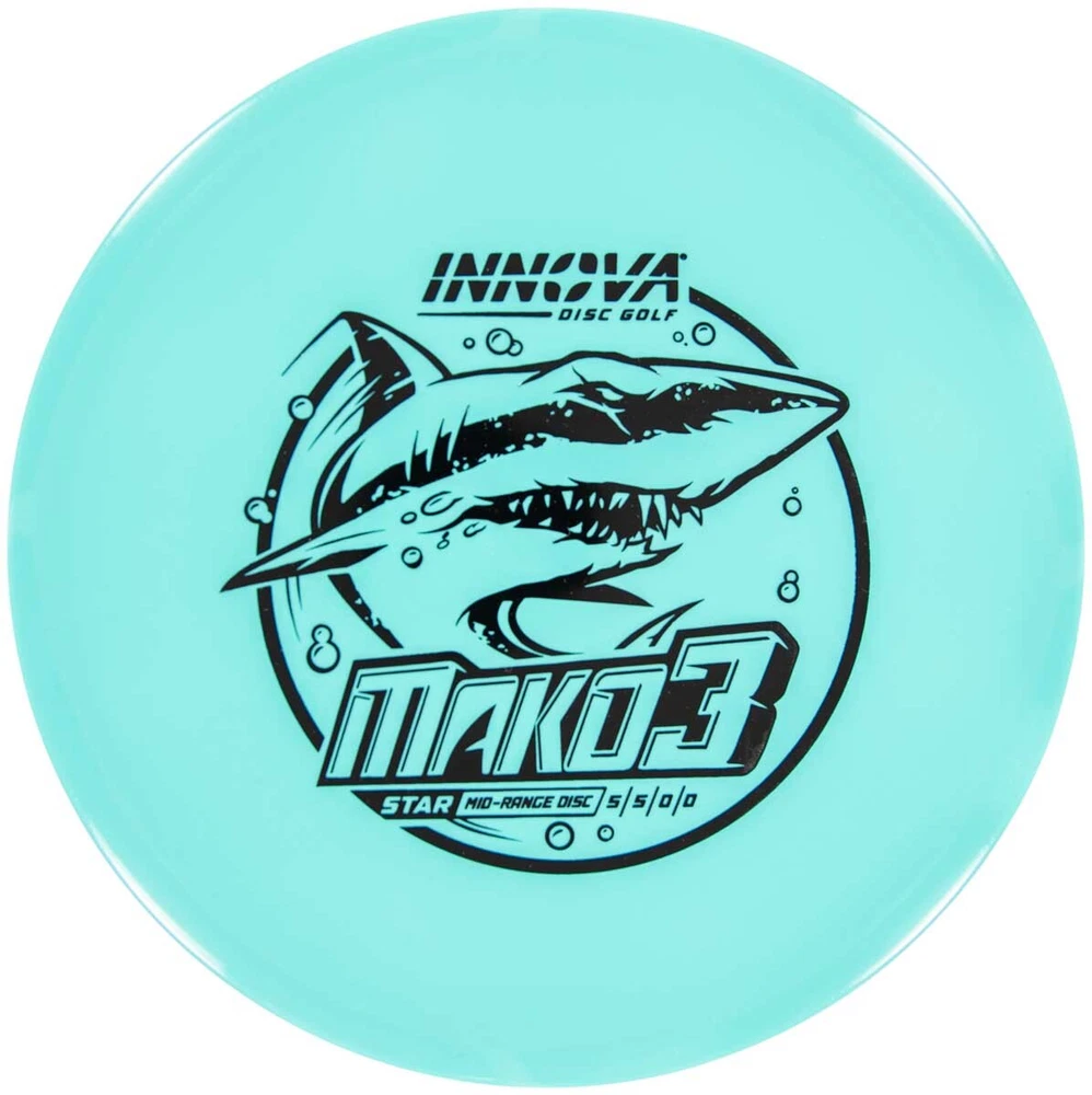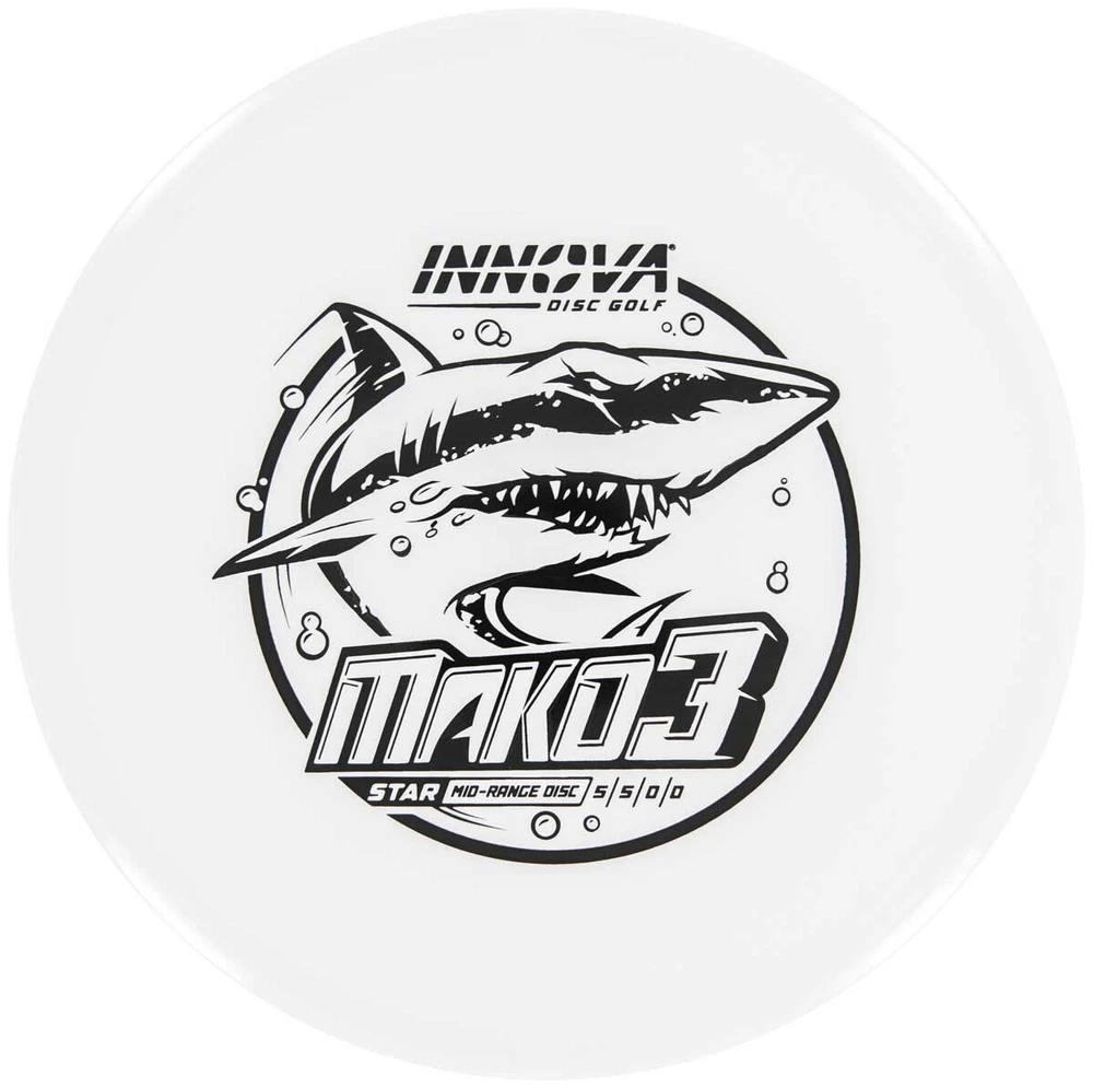 Please Note: Stamps colors and the exact hue of the disc color will vary from sample images. The shortest distance between Point A and Point B is the straight line provided by the Innova Star Mako3 mid range disc. How the Mako3 disc feels: The Mako3’s thin rim makes grip and release natural for any sized hands. And, after only a few throws your body will instinctively reach for it. Dome can range from pretty flat to noticeable. Star Mako3 Flight Numbers: 5 / 5 / 0 / 0 How the Star Mako3 flies: The Mako3 is a neutral flying large diameter mid range disc, and it is perhaps the easiest disc to fly straight from the get-go. It’s got excellent glide and minimal fade at flight’s end. For moderate conditions, especially in the woods, the Mako3 can easily be your most used disc for medium length drives and approaches. Very versatile, especially for any must-hit-gap shot. Star plastic: Star plastic gives the best of both worlds: incredible durability while maintaining a grippy feel in the hand. In terms of stability it sits in between DX and Champion. Great for: Laser-beam-straight medium length drives and approaches Reliable anhyzer throws right out of the box. One-disc rounds. How will I throw it?: Beginner to intermediate players will see straight flights with a moderate fade at flight’s end. As they become more accustomed to the disc, they will experience an even straighter finish. Advanced players will see very straight flights from the start and as it ages it will become more and more of a turnover disc.