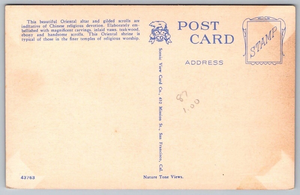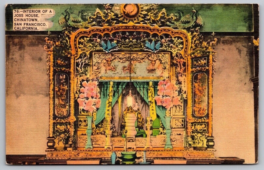 Interior Joss House Chinatown San Francisco California Linen Postcard You will receive the exact postcard in the picture. We use a high quality scanner to capture pictures of the front and back for every postcard we have listed. Postcards will be in the condition as shown in the pictures. We ship Mon-Fri. We also offer combined shipping discounts or free shipping. If we have shipping on your listing you can buy as many additional postcards as you want and they will ship for free after the fist postage is paid. If you select first class shipping and pay the extra your postcard will be shipping as a package with extra protection. If you choose free shipping or $1.50 shipping your postcard will be shipped in a standard envelope with soft plastic sleeve and do not bend written on the envelope. Orders of 15 or more cards or with single cards over $20 in them will automatically be upgraded to first class and at least a photo mailer. If you have any questions feel free to ask. We are willing to consider reasonable offers and we offer discounts on orders of more than one card. Thank You _gsrx_vers_1436 (GS 9.0.5 (1436)) _gsrx_vers_1608 (GS 9.5 (1608)) _gsrx_vers_1706 (GS 9.9 (1706))