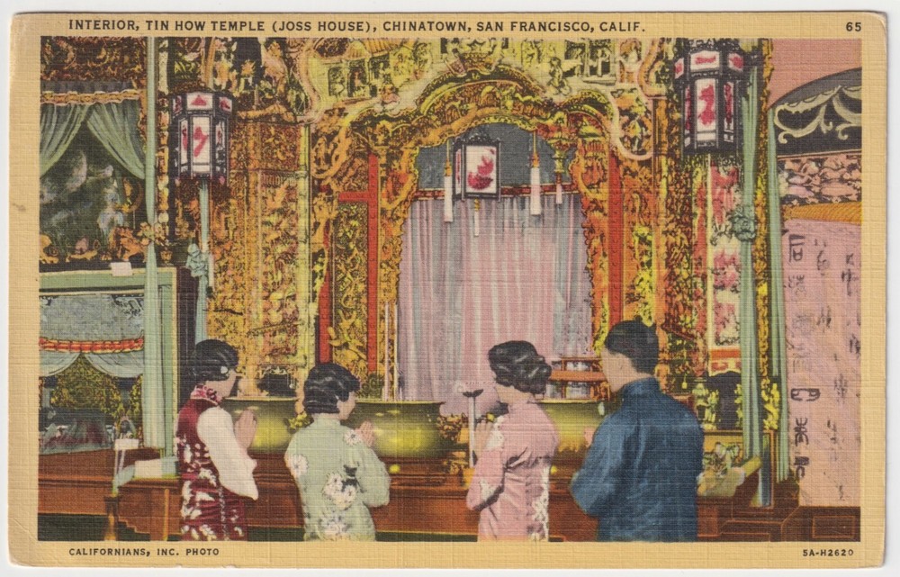 VINTAGE LINEN POSTCARD INTERIOR TIN HOW TEMPLE (JOSS HOUSE) CHINATOWN SAN FRANCISCO, CALIFORNIA Pictorial Wonderland Art Tone Series Stanley A. Pilitz Company San Francisco BUY MULTIPLE ITEMS COMBINE ...
