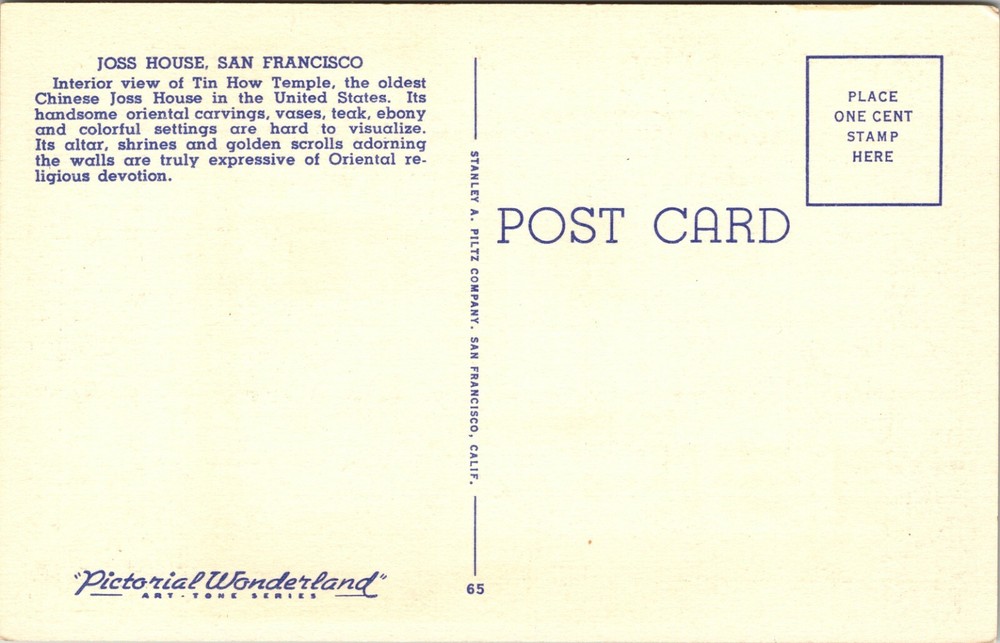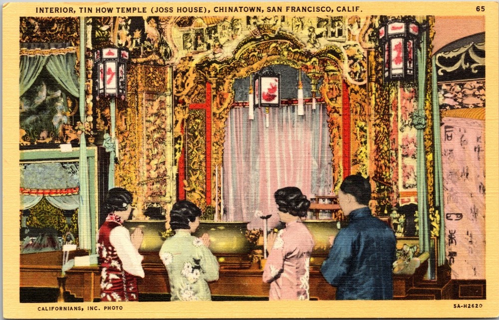 Interior Tin How Temple Joss House San Francisco CA Vintage Postcard 4288 This item was scanned front and back and image was not color corrected. Actual postcard coloration may differ from image. This item will be shipped via USPS first class mail. All dates for postcards are our best guess based on postcard type, imagery, postmark, research, etc., but are not guaranteed.