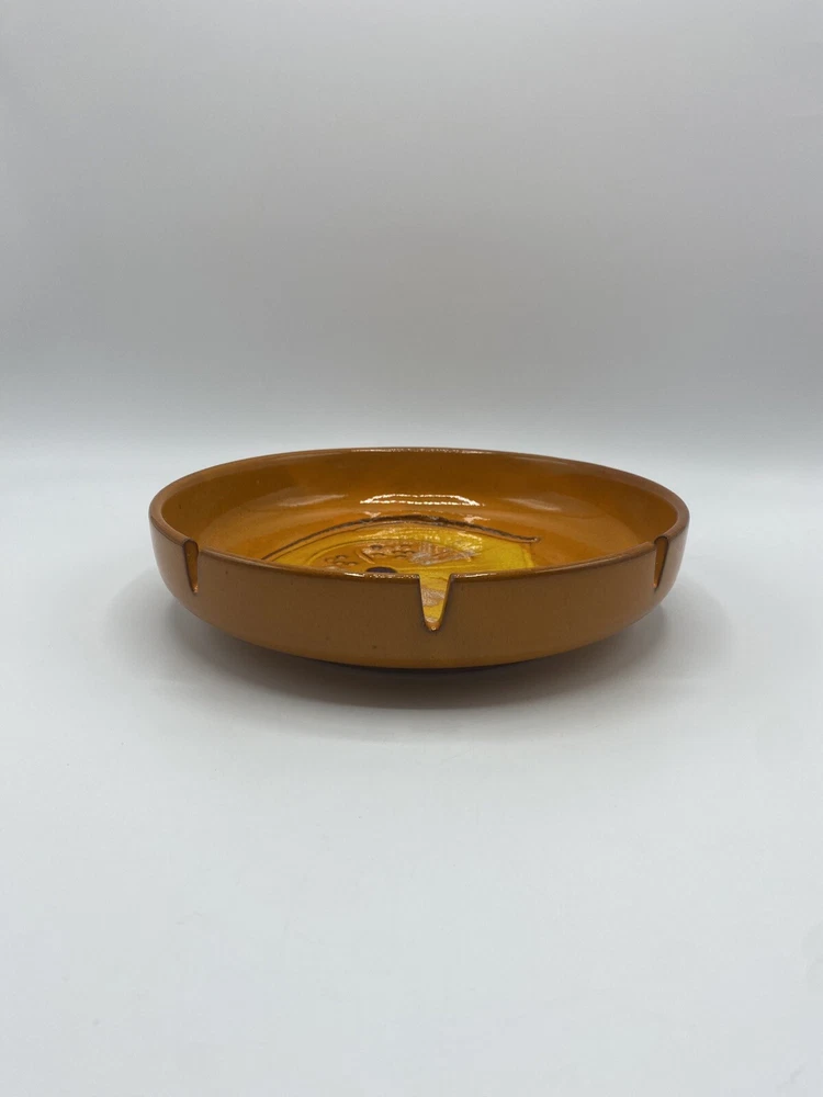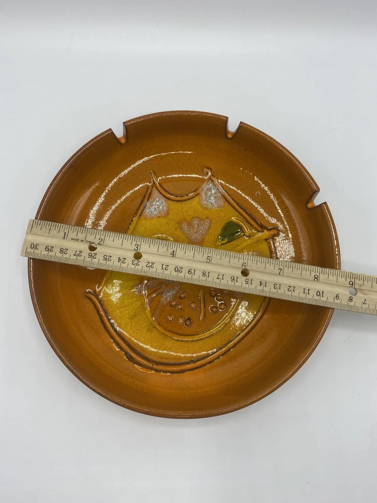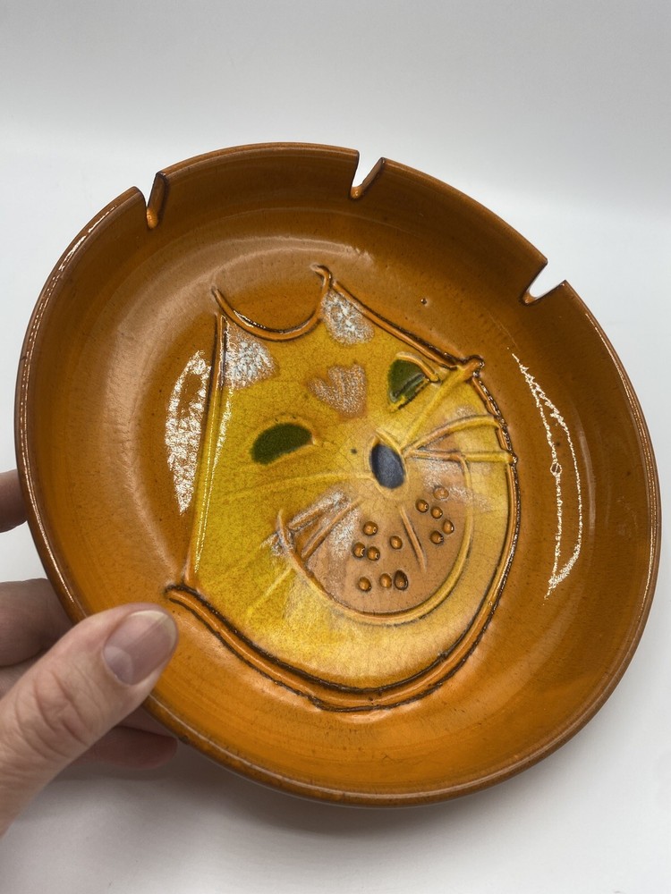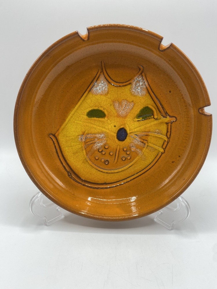Add a touch of mid-century modern charm to your decor with this Italian ceramic ashtray featuring a groovy abstract cat head in mustard yellow on a burnt orange background. Handmade with intricate details, this decorative piece is perfect for any tobacco enthusiast or collector. Measuring 8.75 inches in diameter, 2” deep, with a weight of almost 2 lbs., it is the perfect size for displaying on a shelf or tabletop. This ashtray is a unique addition to any collection of tobacciana and is sure to catch the eye of anyone who enters the room. Glossy crackle glaze, there are a few little chips of the glaze on rim of ashtray. No cracks or ceramic chips. No makers mark on bottom, research shows similar pieces are made in Italy. Conditions is pre-owned. Ships with USPS Parcel Select Mail. Please note regarding returns: Fees may be deducted and returns may be subject to a restocking fee.