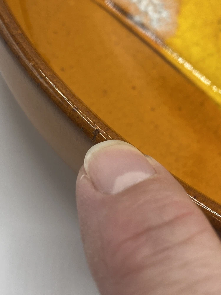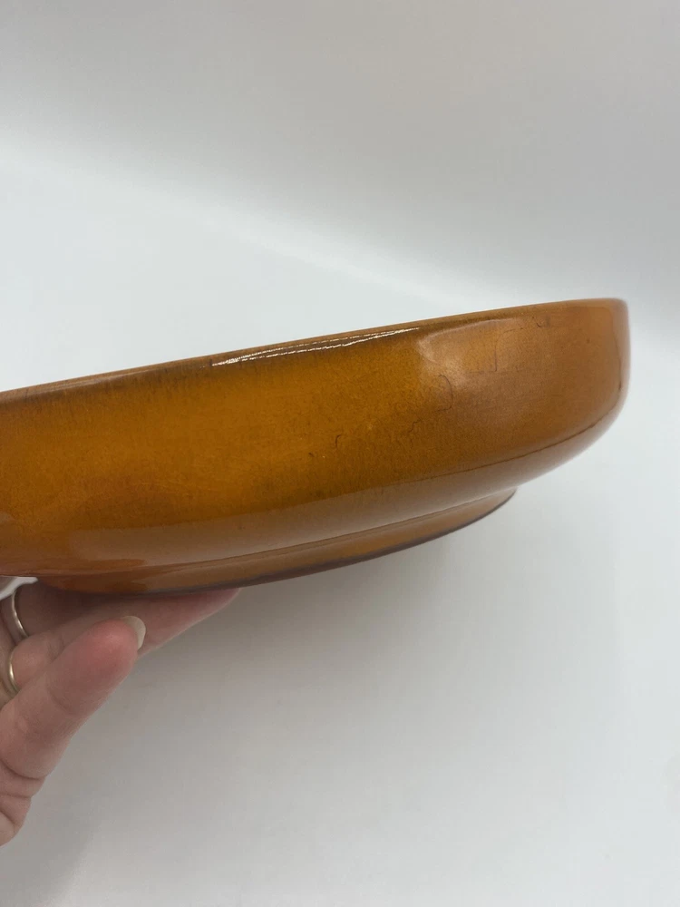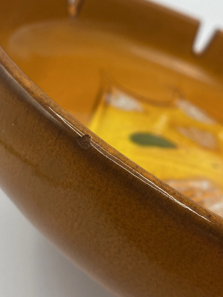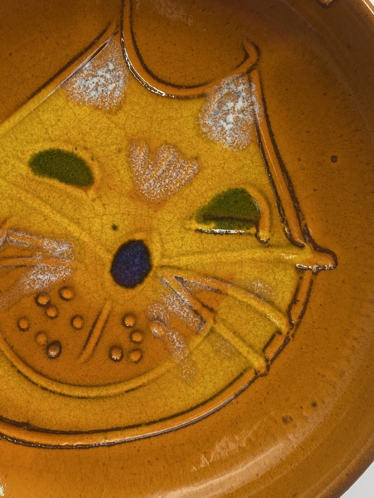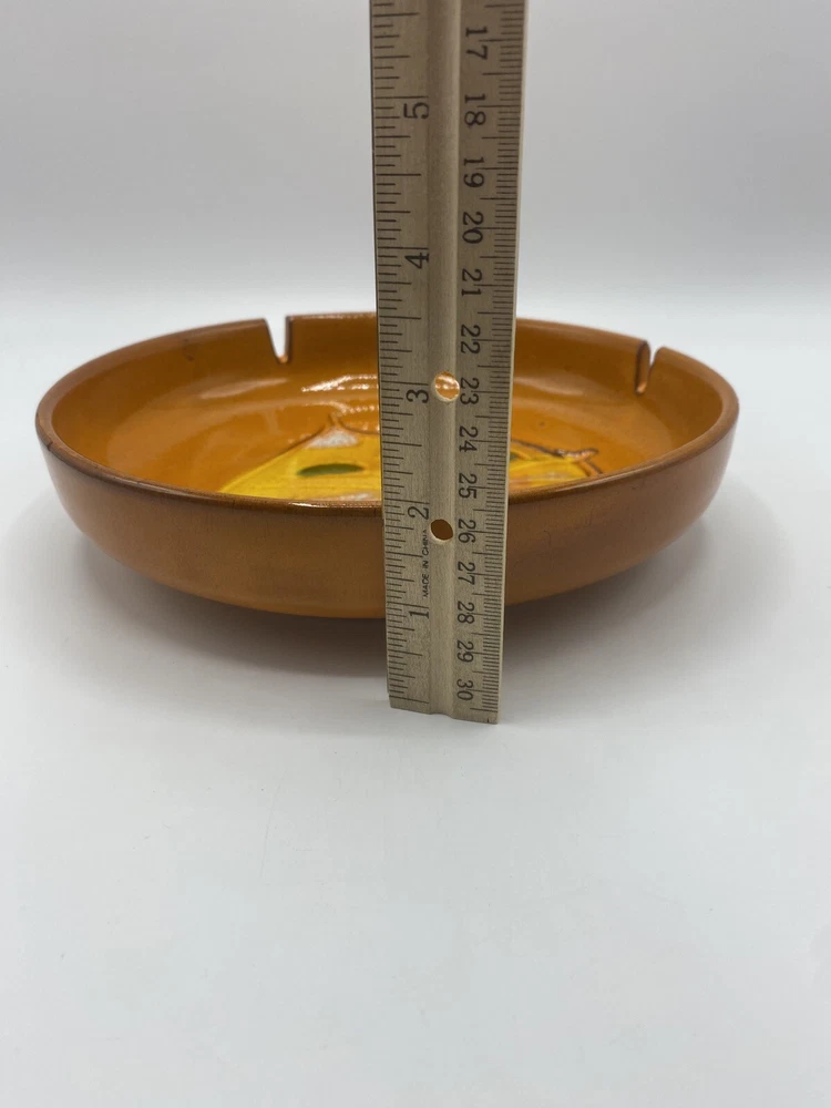 Add a touch of mid-century modern charm to your decor with this Italian ceramic ashtray featuring a groovy abstract cat head in mustard yellow on a burnt orange background. Handmade with intricate details, this decorative piece is perfect for any tobacco enthusiast or collector. Measuring 8.75 inches in diameter, 2” deep, with a weight of almost 2 lbs., it is the perfect size for displaying on a shelf or tabletop. This ashtray is a unique addition to any collection of tobacciana and is sure to catch the eye of anyone who enters the room. Glossy crackle glaze, there are a few little chips of the glaze on rim of ashtray. No cracks or ceramic chips. No makers mark on bottom, research shows similar pieces are made in Italy. Conditions is pre-owned. Ships with USPS Parcel Select Mail. Please note regarding returns: Fees may be deducted and returns may be subject to a restocking fee.