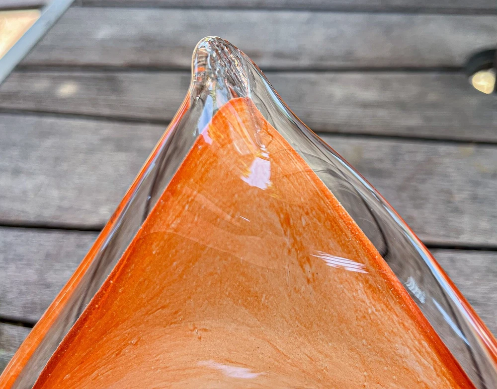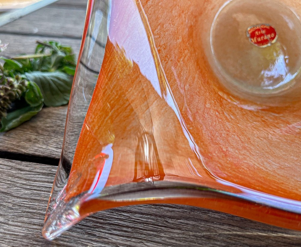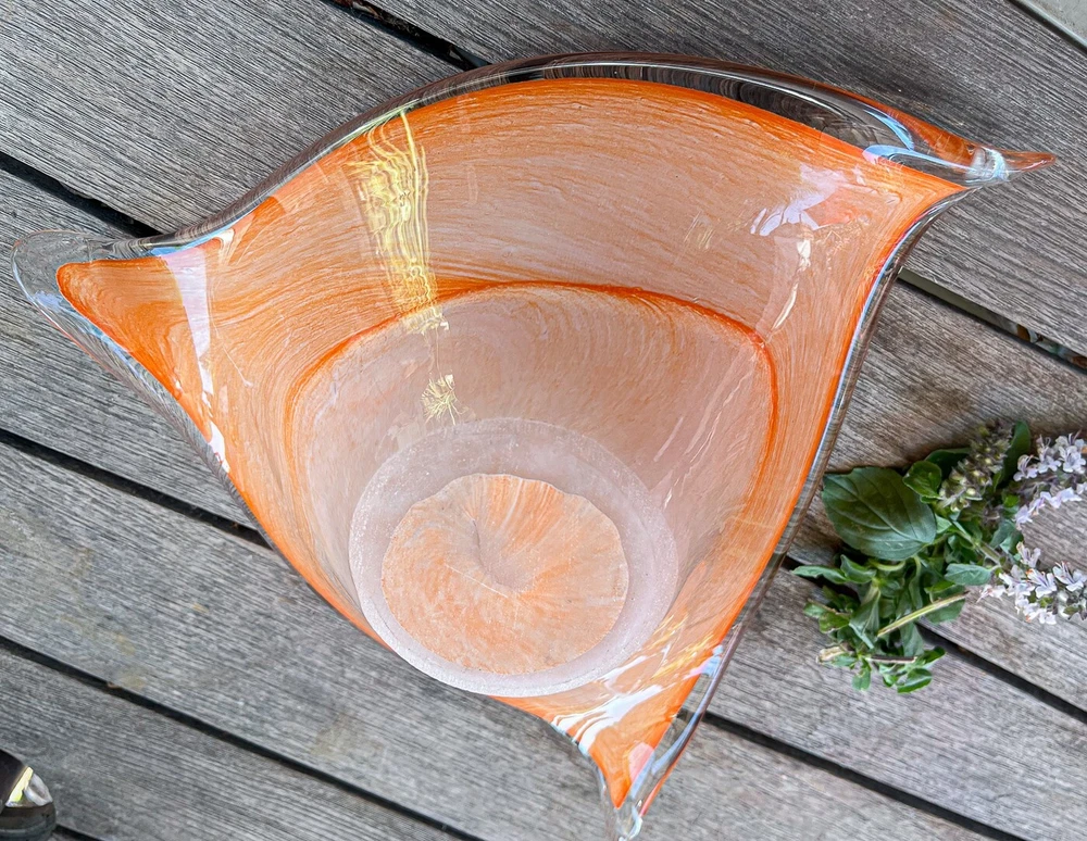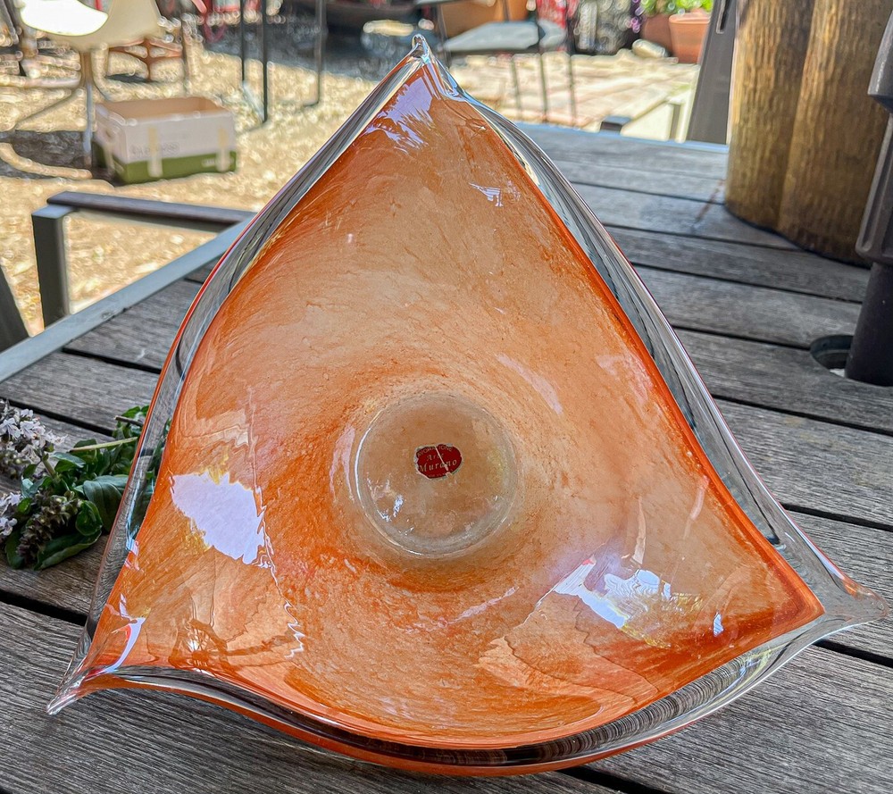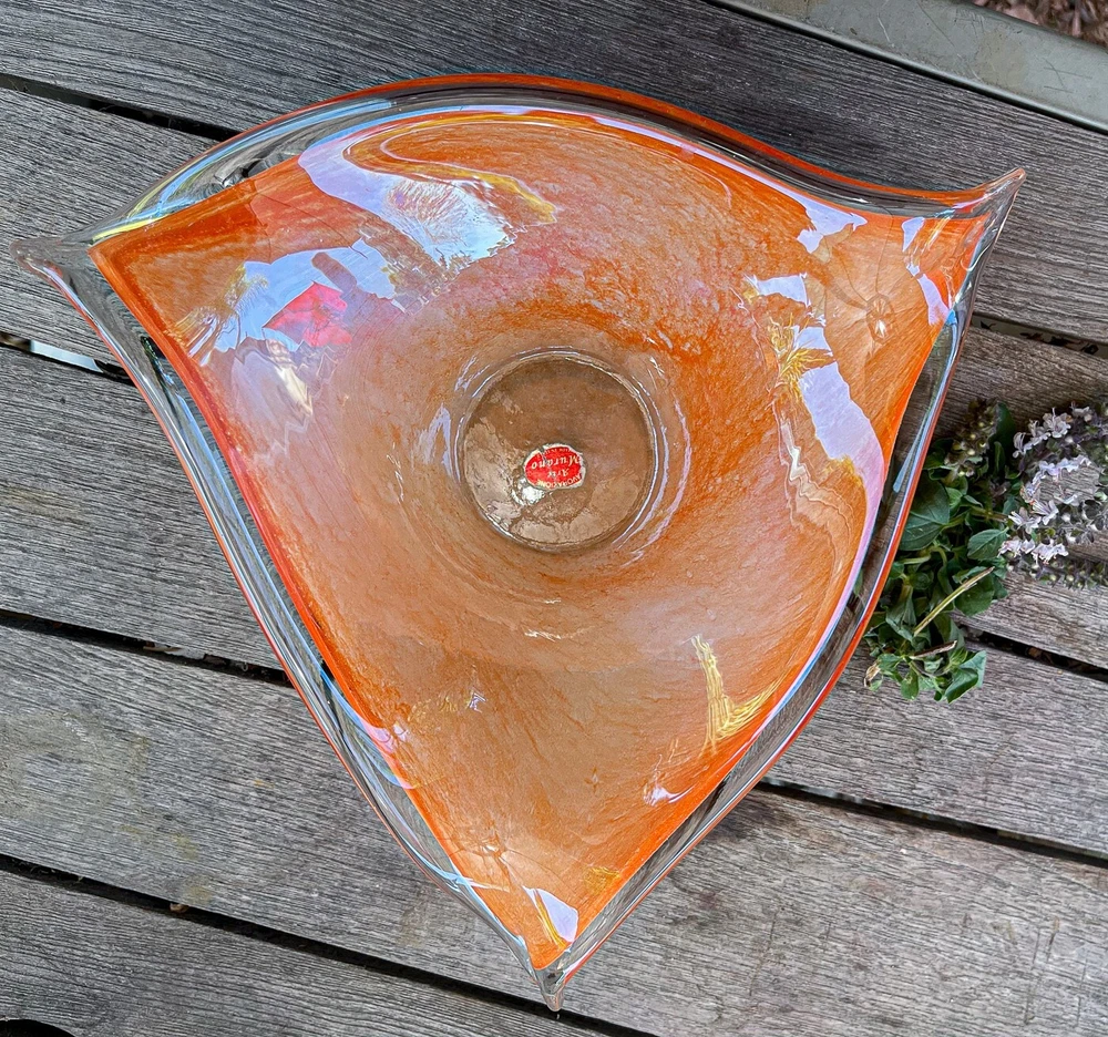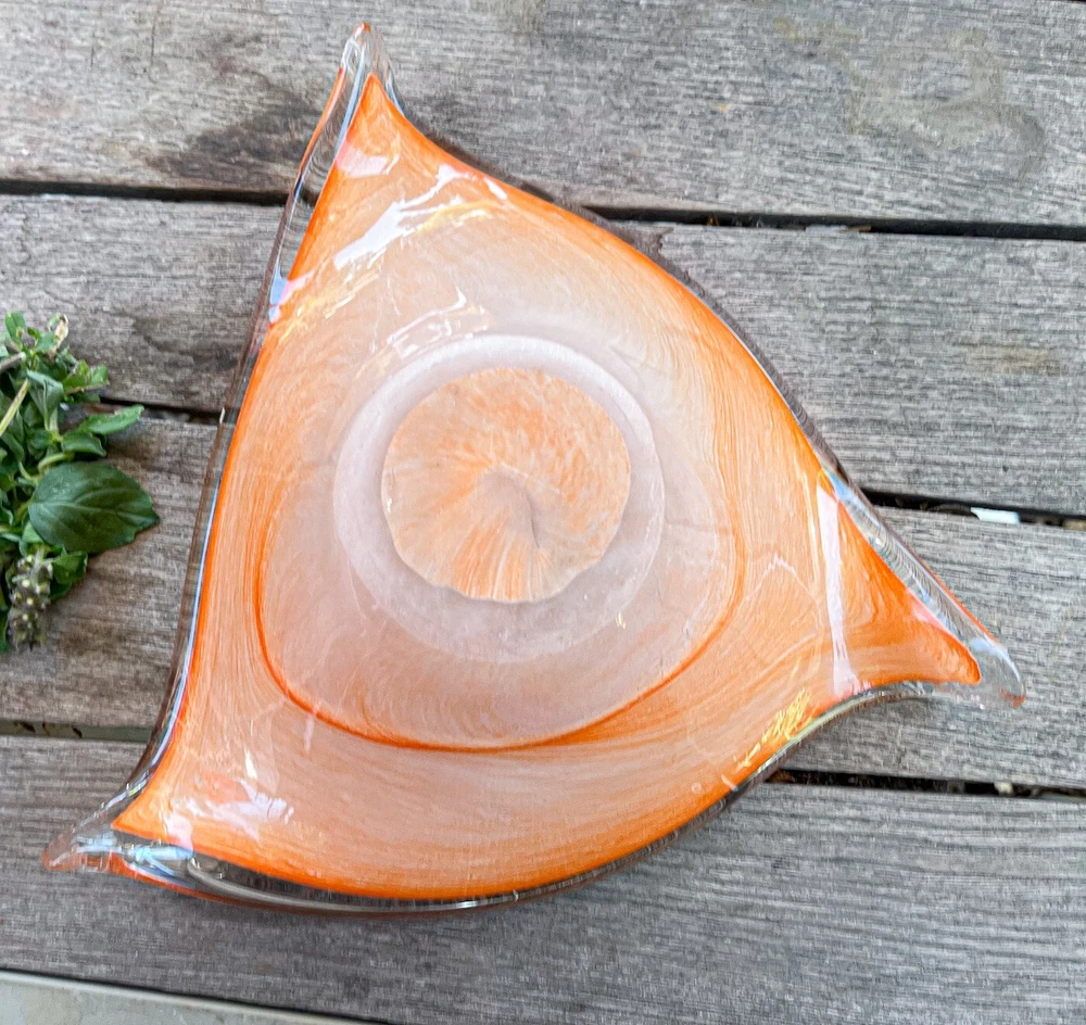 For sale is a stunning triangular freeform mid-century glass bowl from Murano, Italy. This beautiful piece measures approximately 10 to 11 inches along each edge by 3¾” tall on a 3-inch diameter base. The bowl is in lovely vintage condition and is handcrafted in orange and white glass with a clear glass edge and will be professionally packed and shipped. Please examine all photographs prior to purchase.