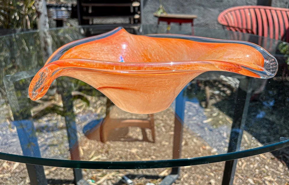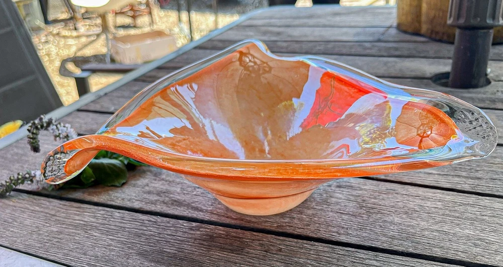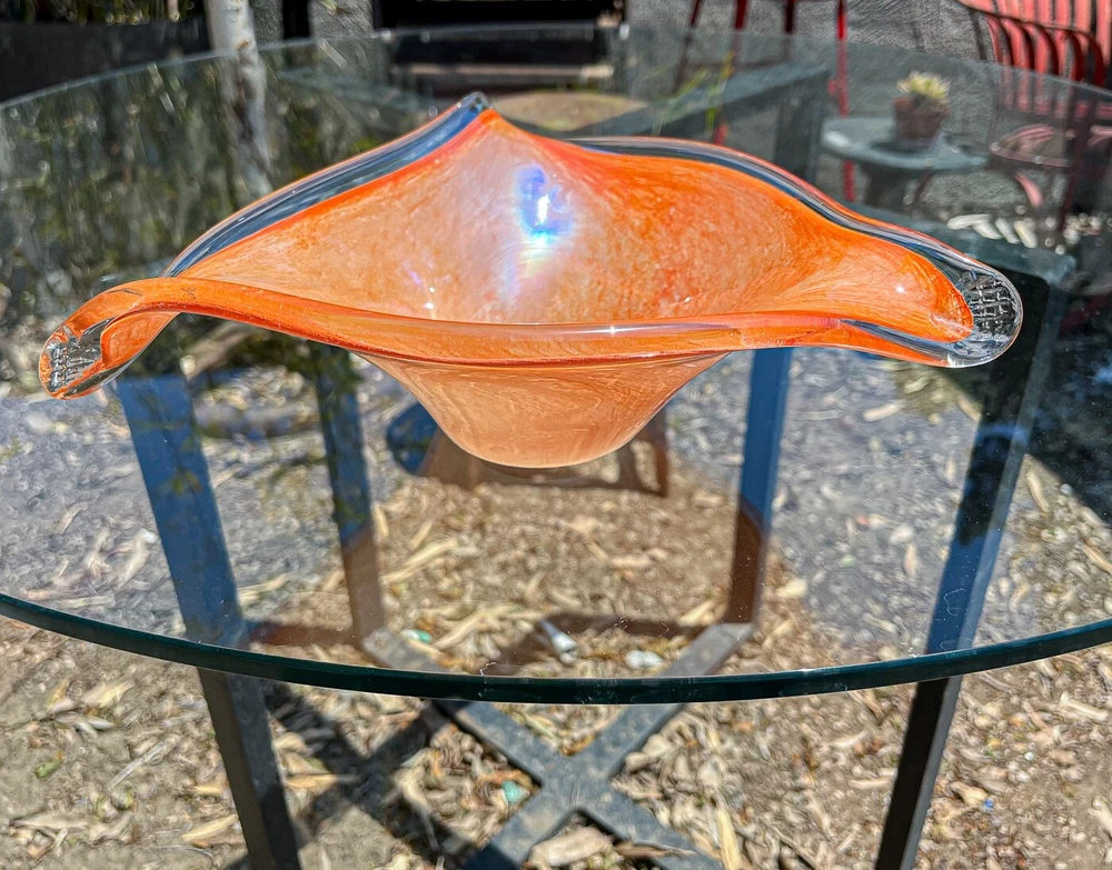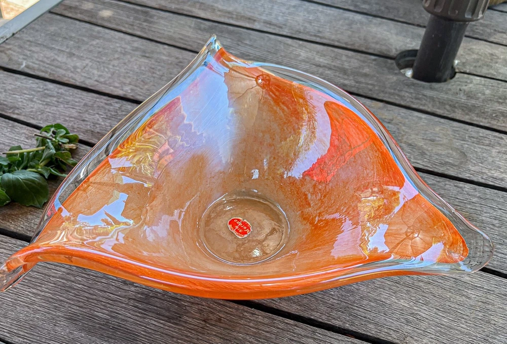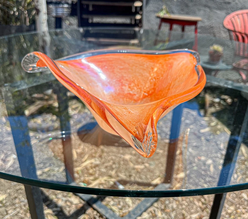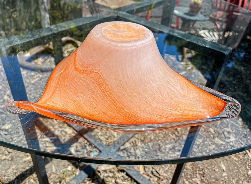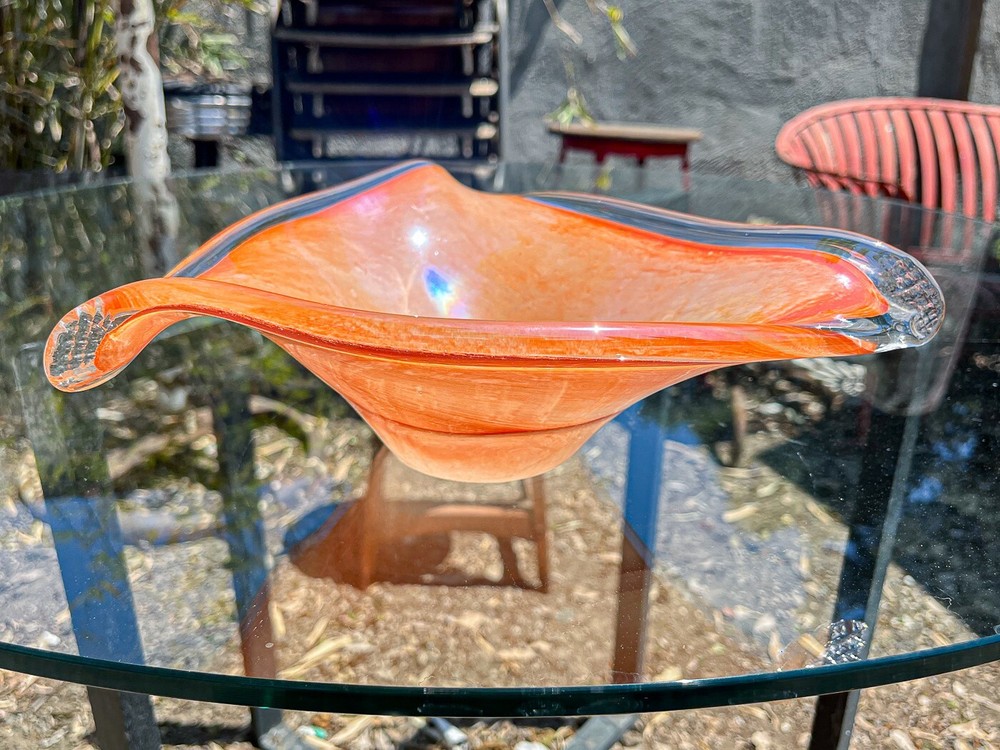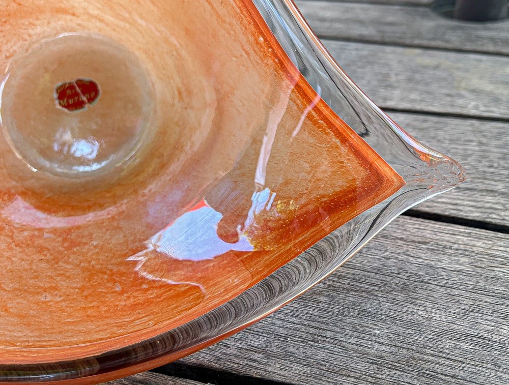 For sale is a stunning triangular freeform mid-century glass bowl from Murano, Italy. This beautiful piece measures approximately 10 to 11 inches along each edge by 3¾” tall on a 3-inch diameter base. The bowl is in lovely vintage condition and is handcrafted in orange and white glass with a clear glass edge and will be professionally packed and shipped. Please examine all photographs prior to purchase.