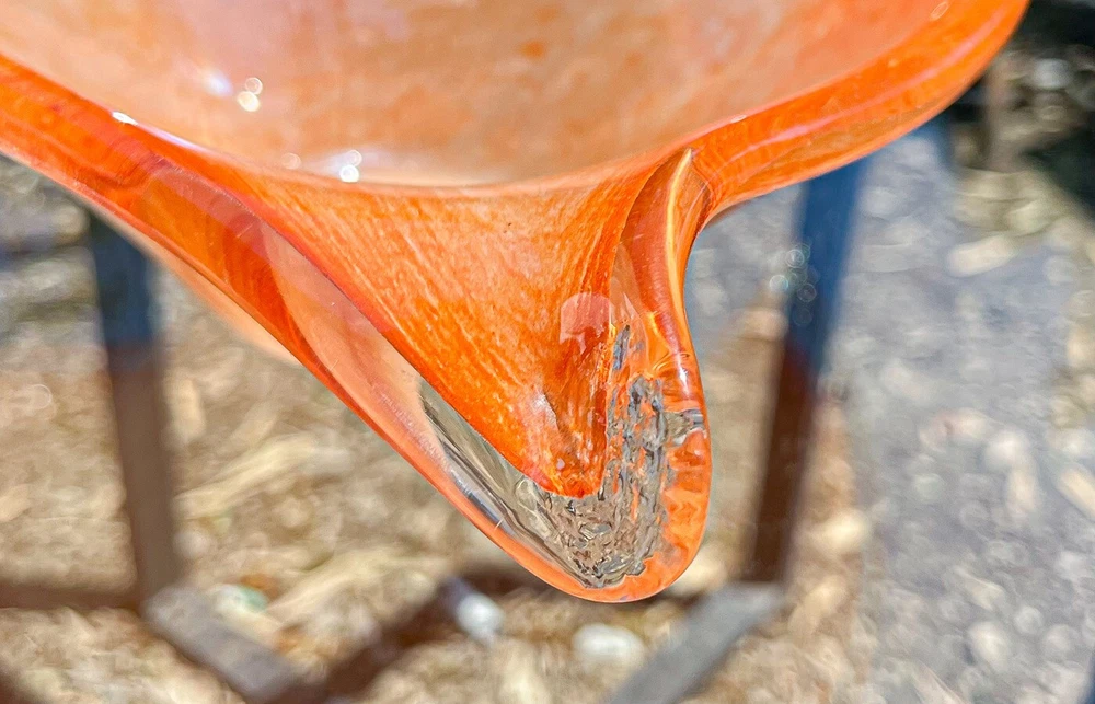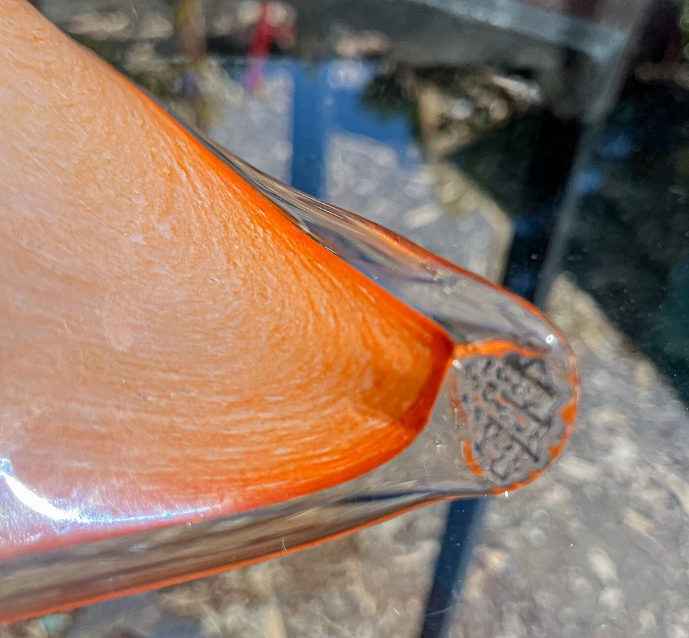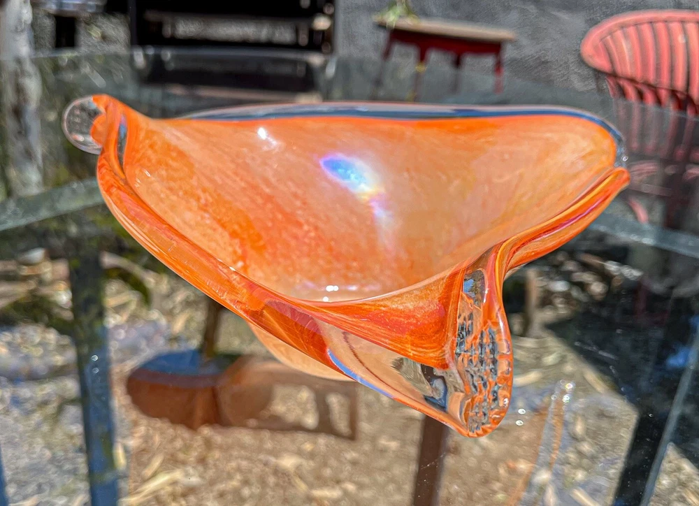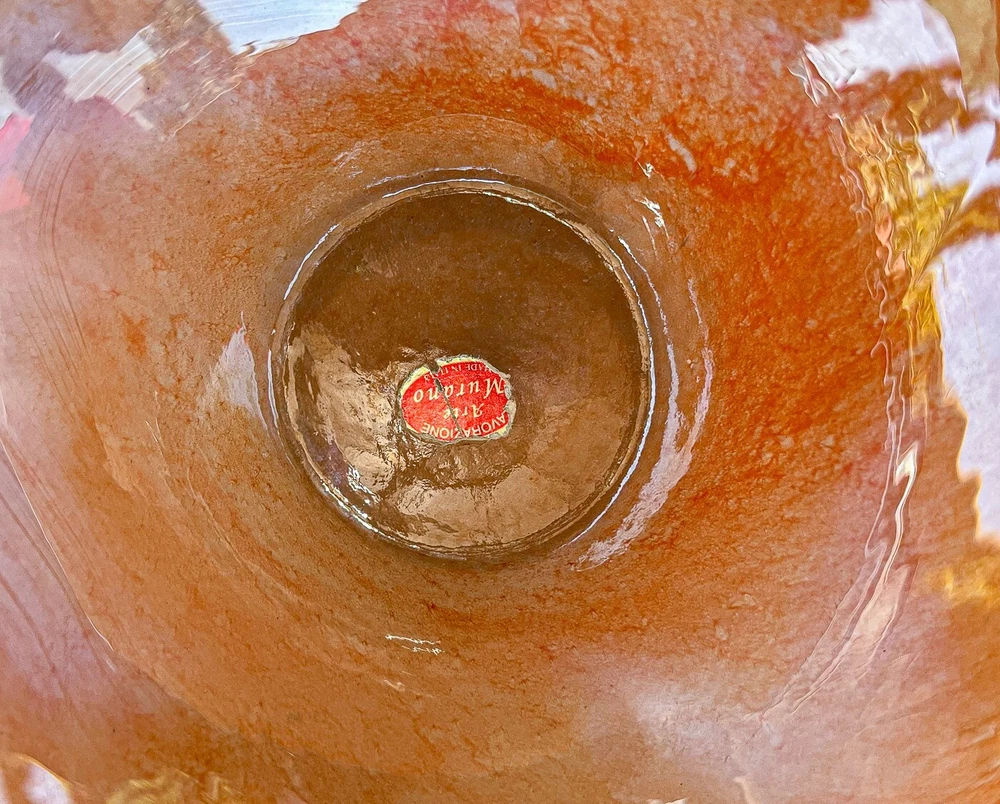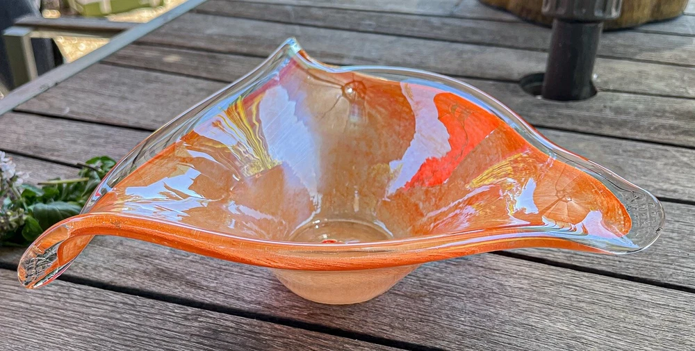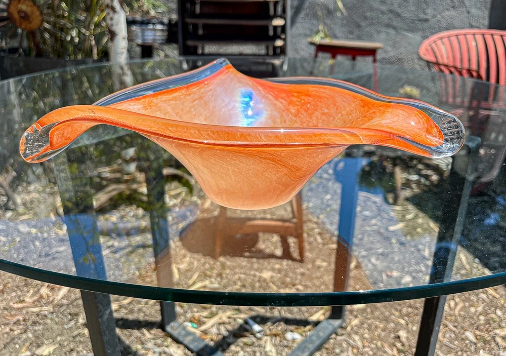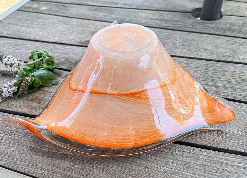 For sale is a stunning triangular freeform mid-century glass bowl from Murano, Italy. This beautiful piece measures approximately 10 to 11 inches along each edge by 3¾” tall on a 3-inch diameter base. The bowl is in lovely vintage condition and is handcrafted in orange and white glass with a clear glass edge and will be professionally packed and shipped. Please examine all photographs prior to purchase.