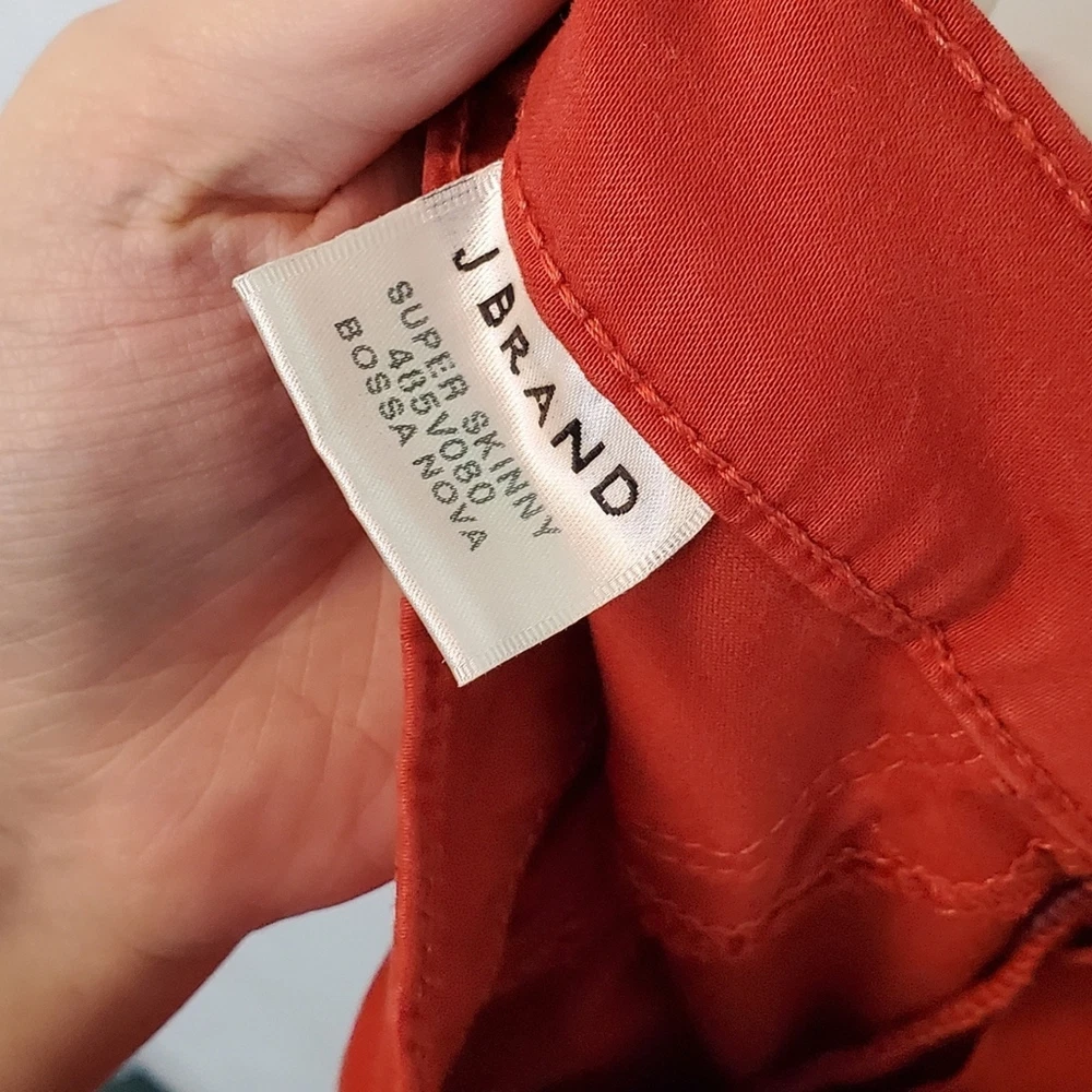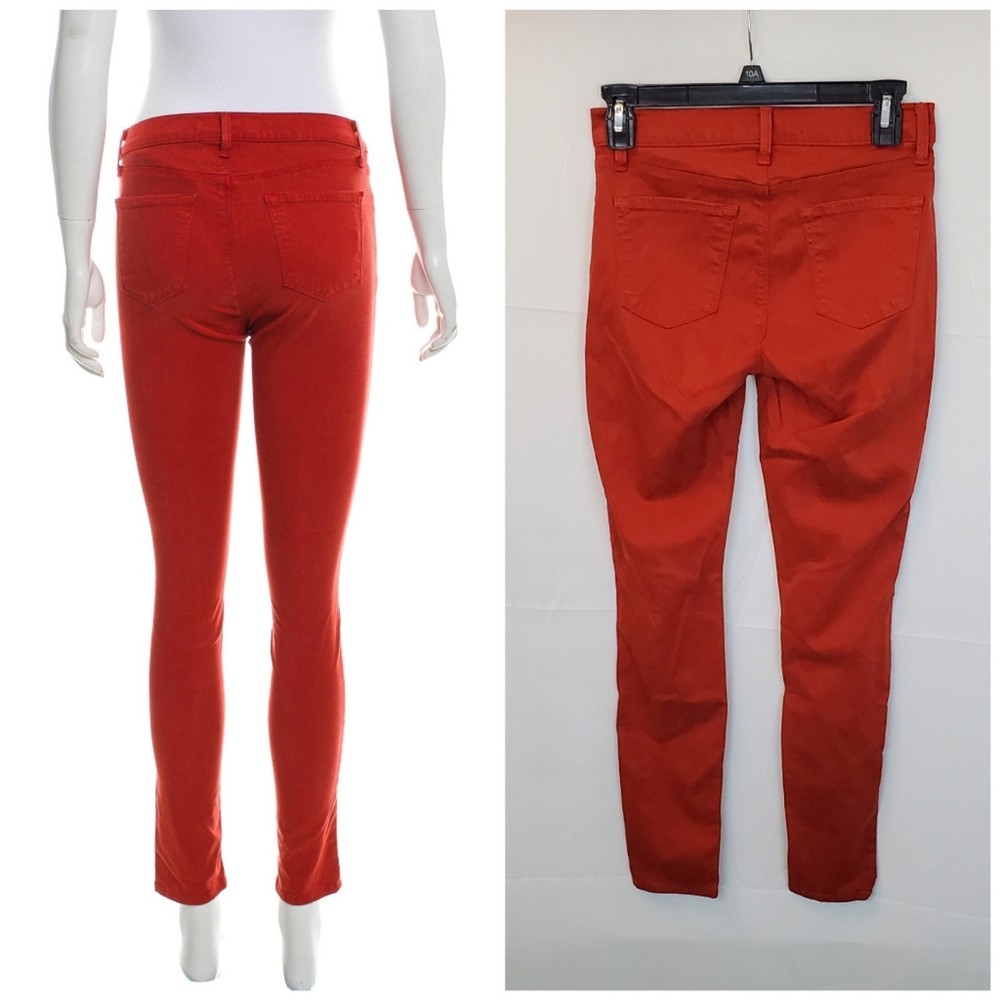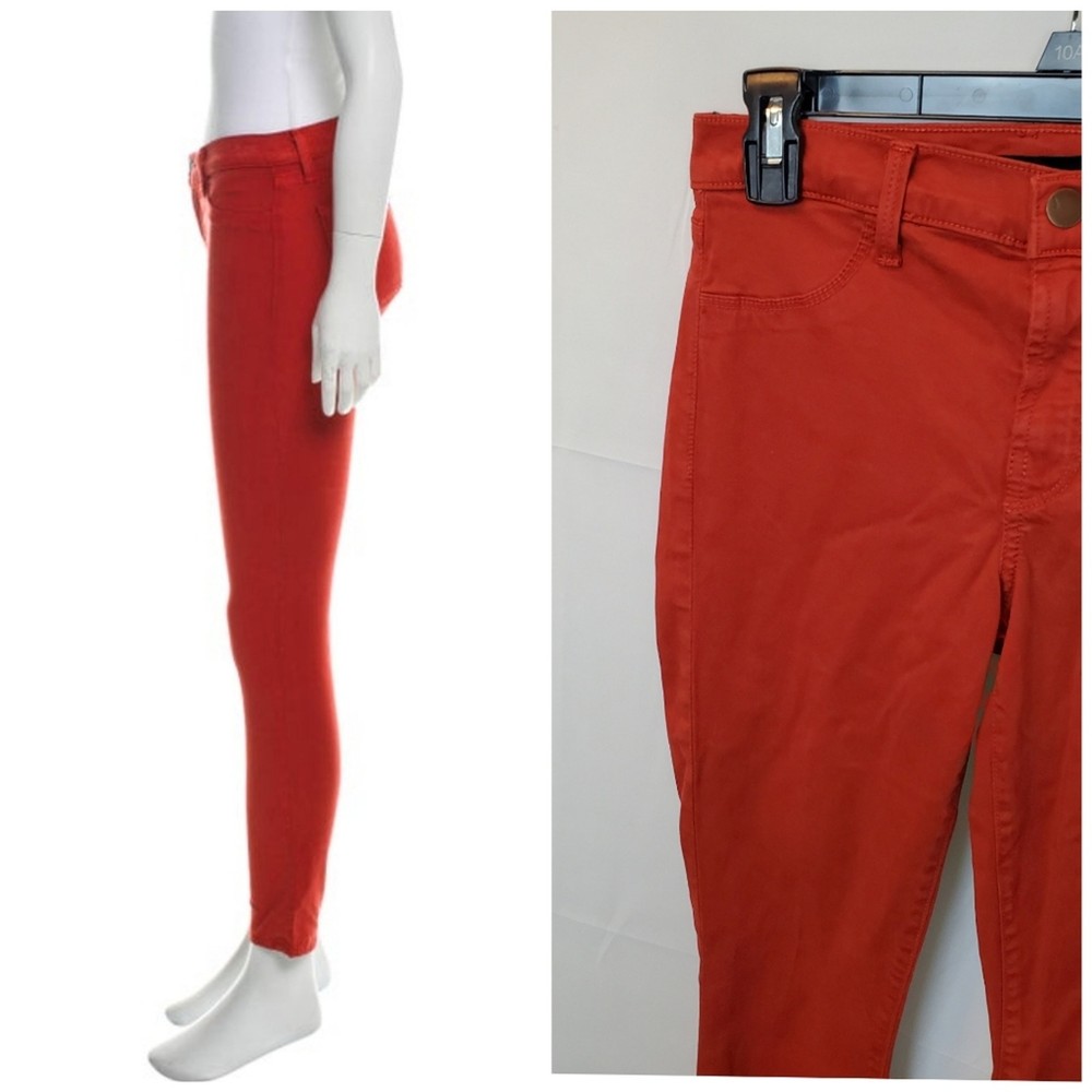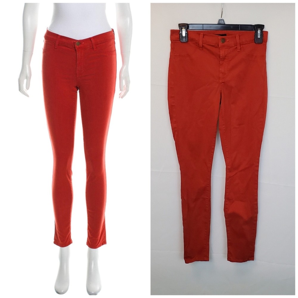 <![CDATA[<div>J BRAND Tangerine Bossa Nova Super Skinny Pants. Size 27. In very good used condition; minor fading throughout. Description: Tangerine J Brand mid-rise skinny leg pants with dual mock pockets at front, dual pockets at back, and button and zipper closure at center front. - Mid-rise red skinny jeans perfect for casual outings or adding a pop of color to your going-out wardrobe. - Stretchy material ensuring a comfortable fit. Measurements: 13" waist across (stretches up to 15" across), 30" hip, 8.5" rise, 28.75" inseam, 9" leg opening. Fabric: 61% Lyocell, 36% Cotton, 3% Elastane. Keywords: red, mid-rise, skinny jeans, stretchy, casual #RedJeans #MidRiseDenim #SkinnyJeans #FashionStaple #CasualChic
