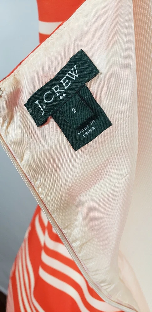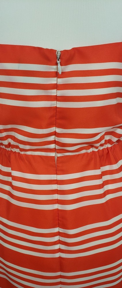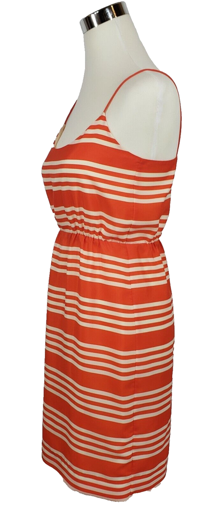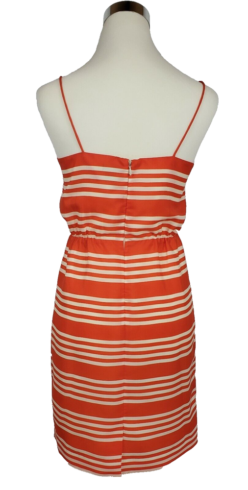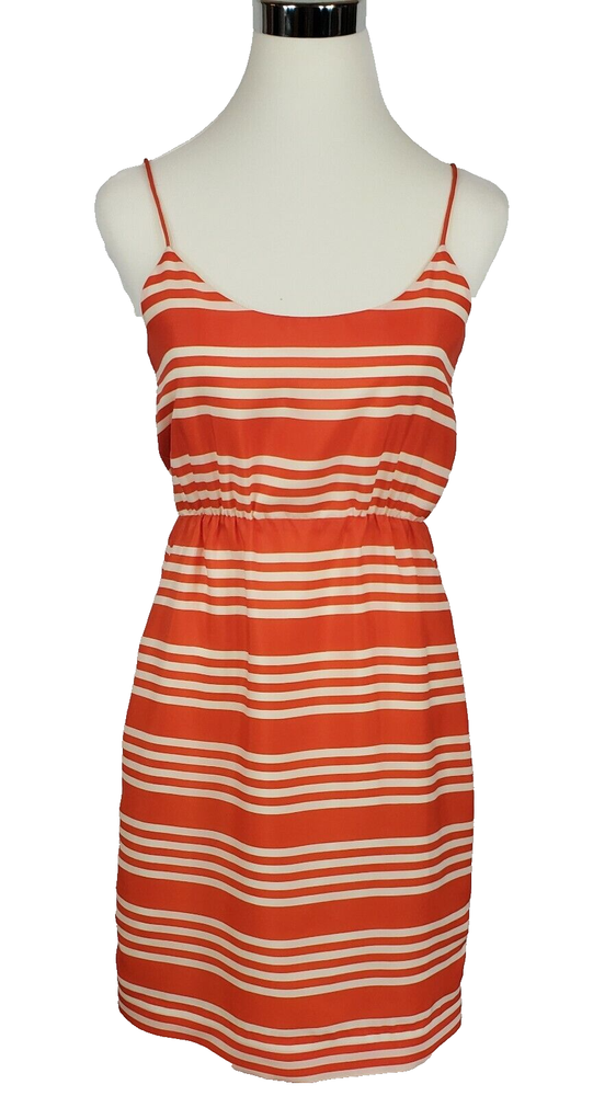 J Crew Orange Stripe Sundress Size 2 Fully lined, polyester sundress with spaghetti straps Elastic waist Slight sheen to fabric Bright orange! Condition Like new Measurements Underarm to underarm - 17" Waist (unstretched) - 12.4" Length from underarm - 28"