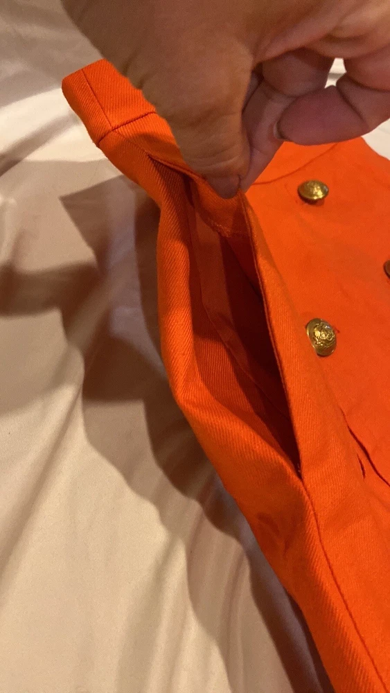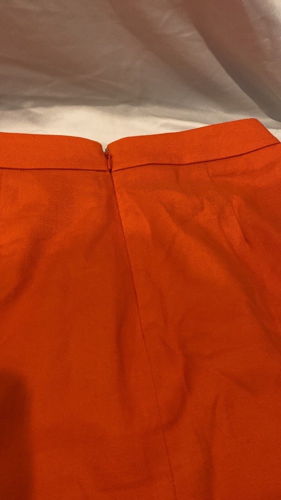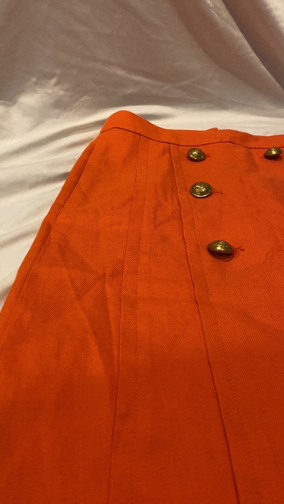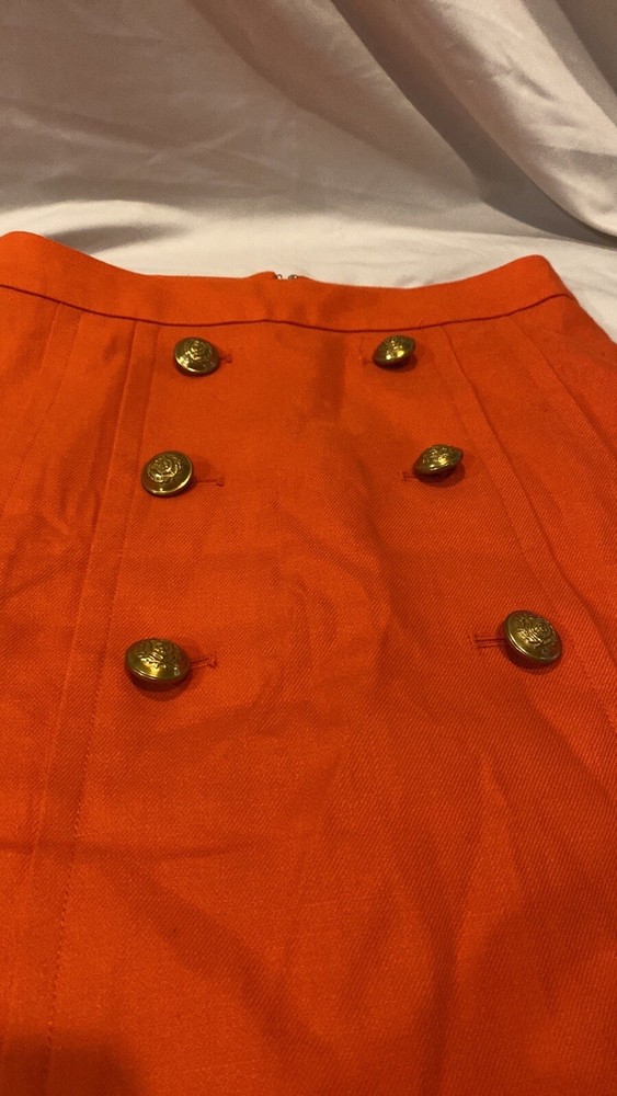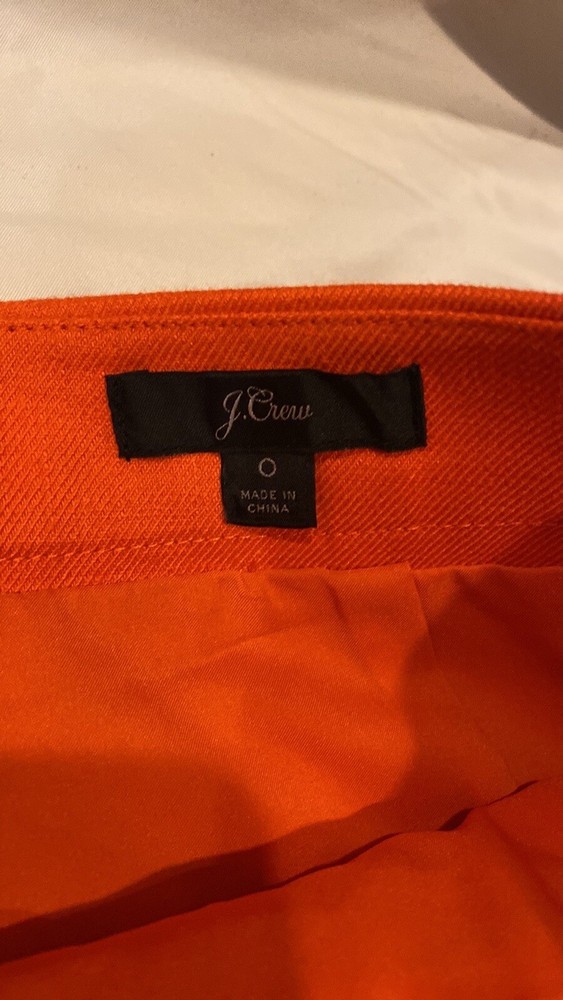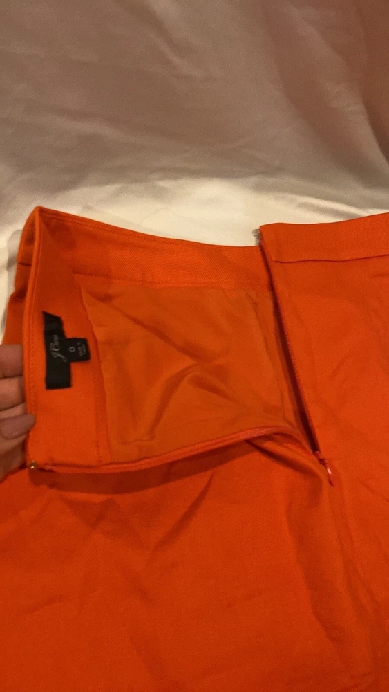 Gorgeous. Classy and high quality item! J.Crew skirt in orange with gold accent buttons. Condition is like new! Size 0, back zipper, front pockets, front gold buttons. Fully lined! Length is 21.75” long 20.5” wide at bottom