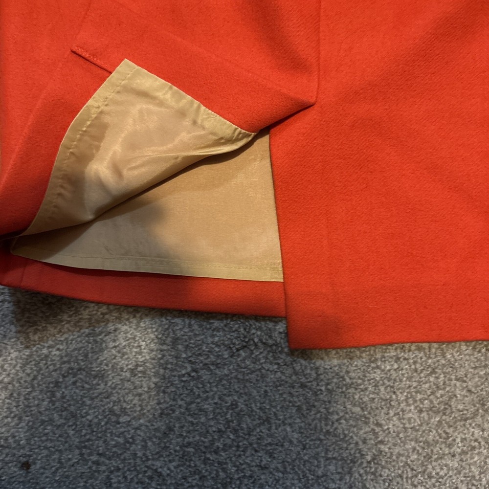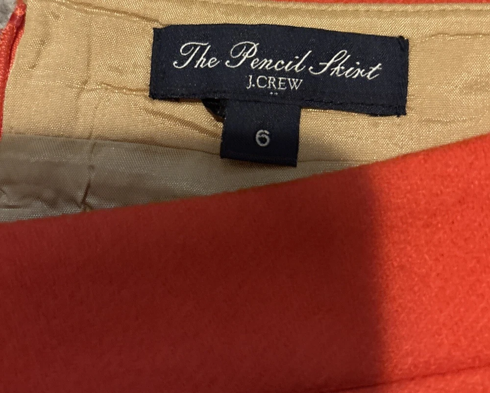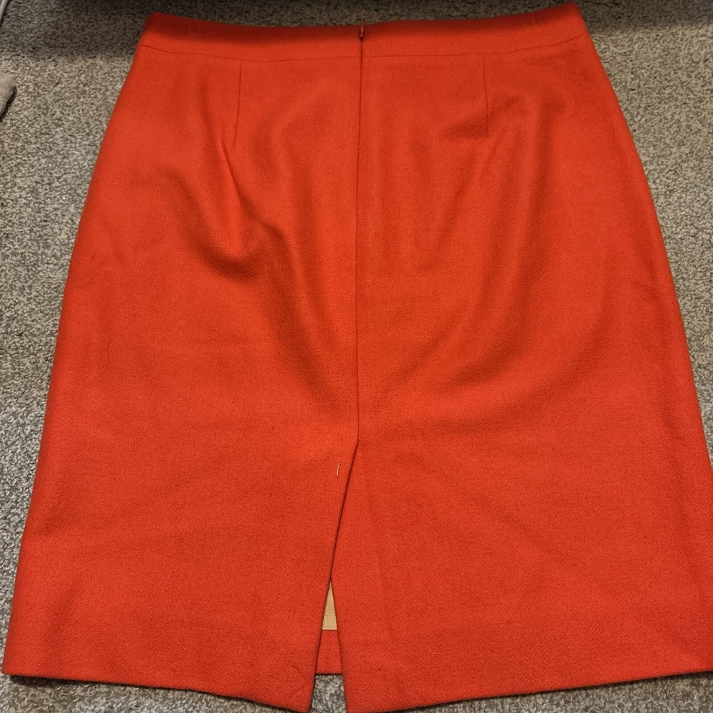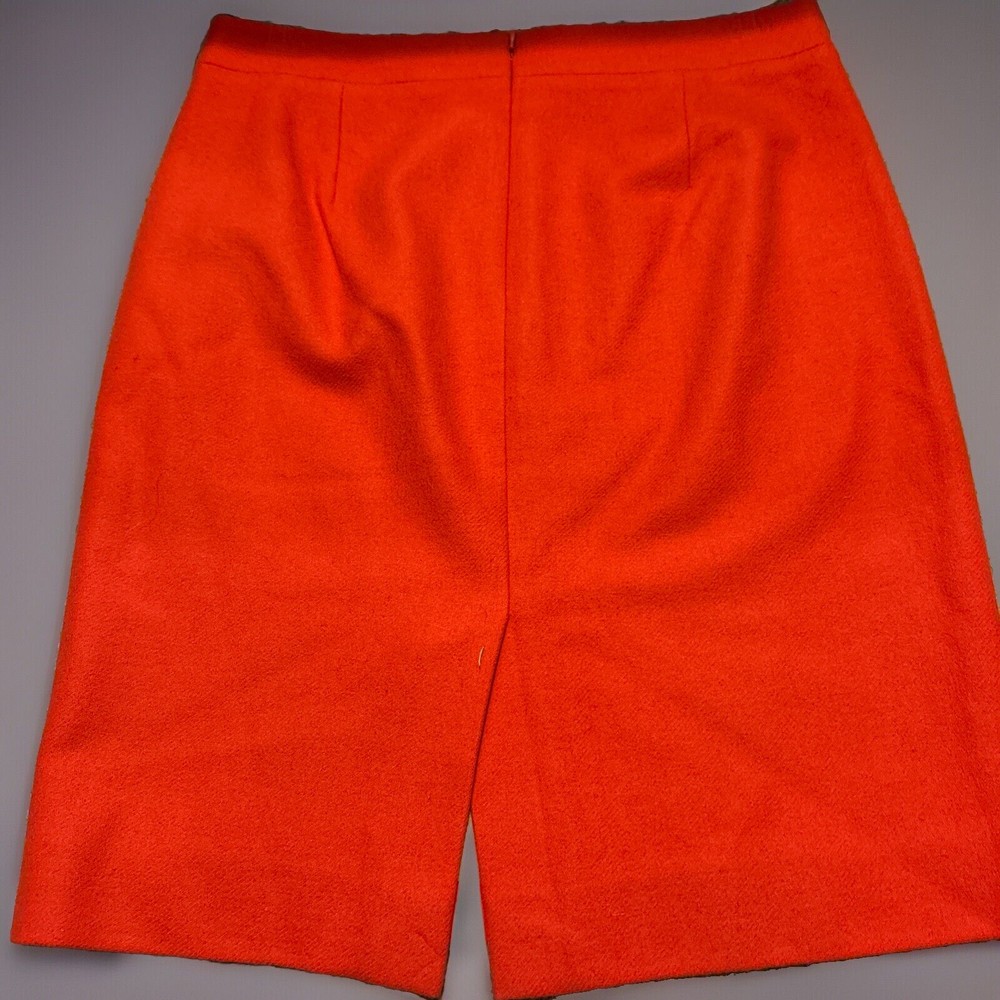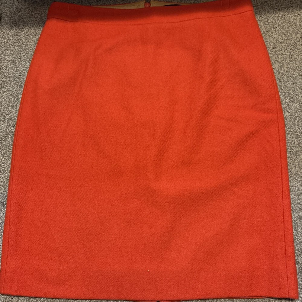 This is a J.Crew pencil skirt in a vibrant orange color, made from a wool blend material. It is a size 6 and features a straight and pencil style with a knee-length cut. The skirt is solid in pattern, has a zip closure, and is lined for added quality. Ideal for parties, cocktail events, or business settings, this skirt combines a classic design with a pop of color to make a stylish statement.