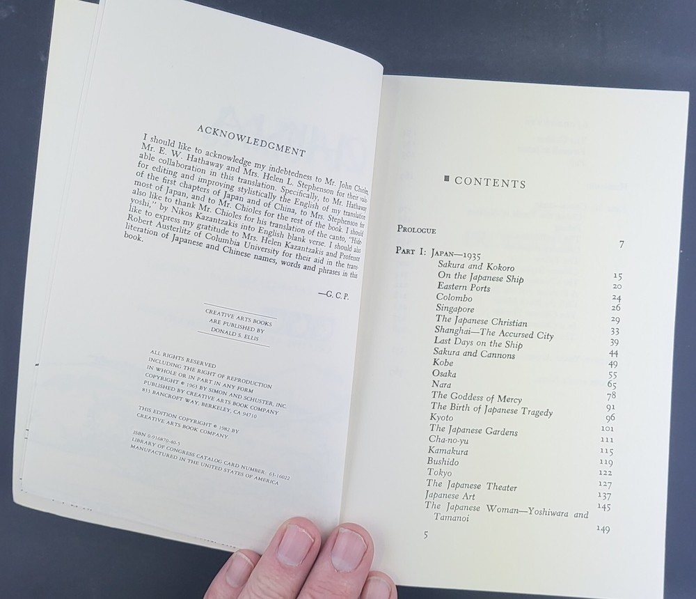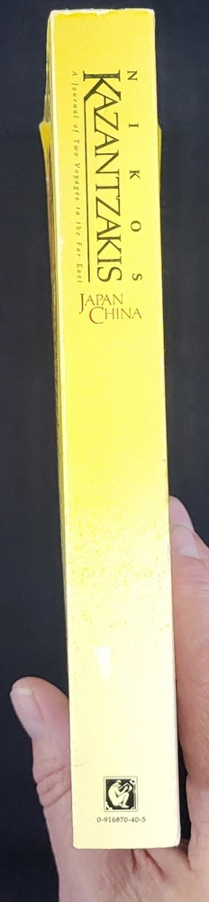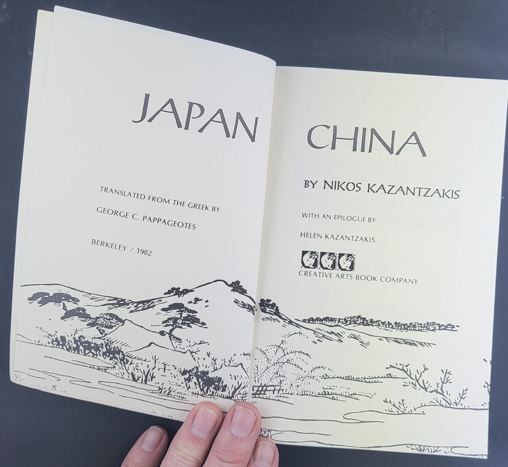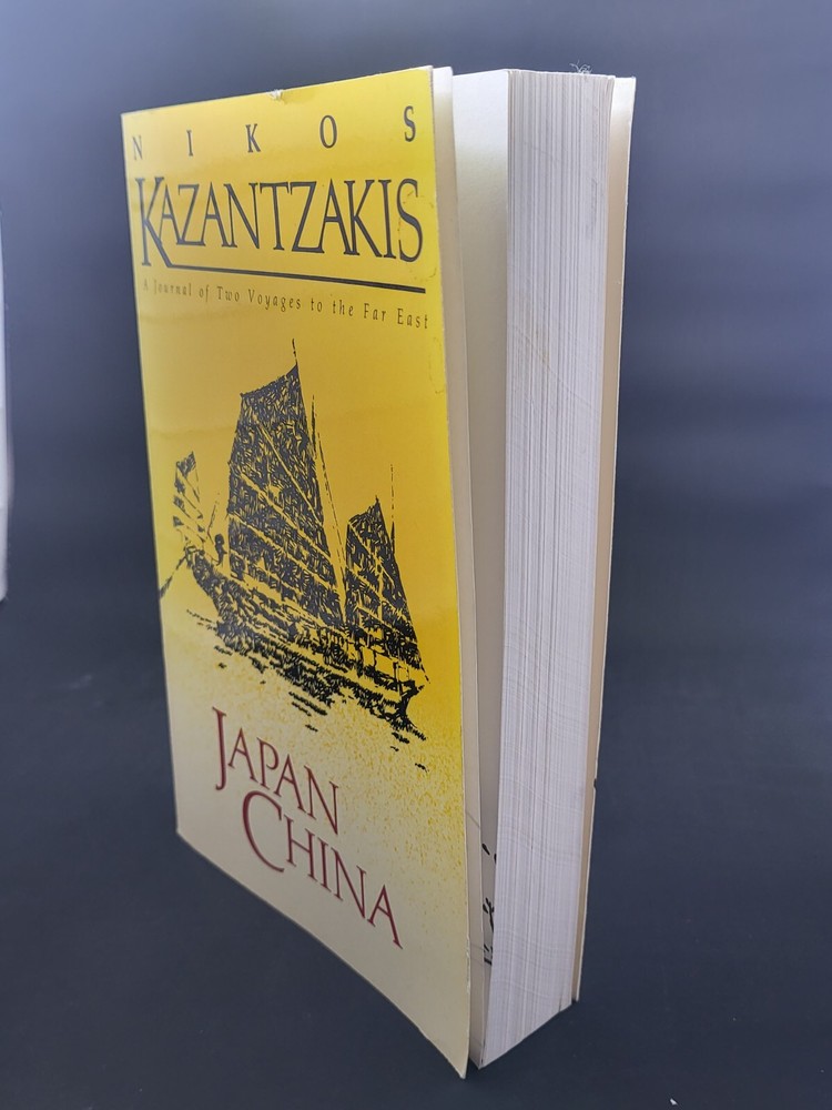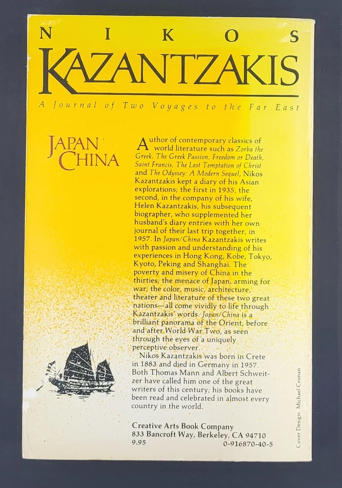 Discover the adventures of Japan-China in "JAPAN/CHINA: A JOURNAL OF TWO VOYAGES" by Nikos Kazantzakis. This travelogue features 384 pages of essays and travelogues that will take you on an unforgettable journey to the Far East. The book was originally written in Greek and published by Creative Arts Book Co. The respected Greek novelist recounts his travels to the Orient in 1935, and provides vivid impressions of two cultures in a period of transition. Please review photos for the condition and thank you for looking.
