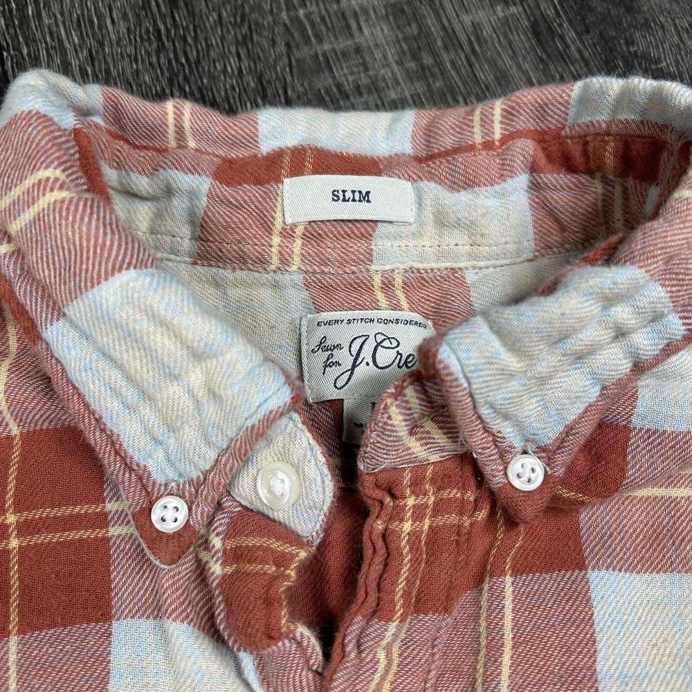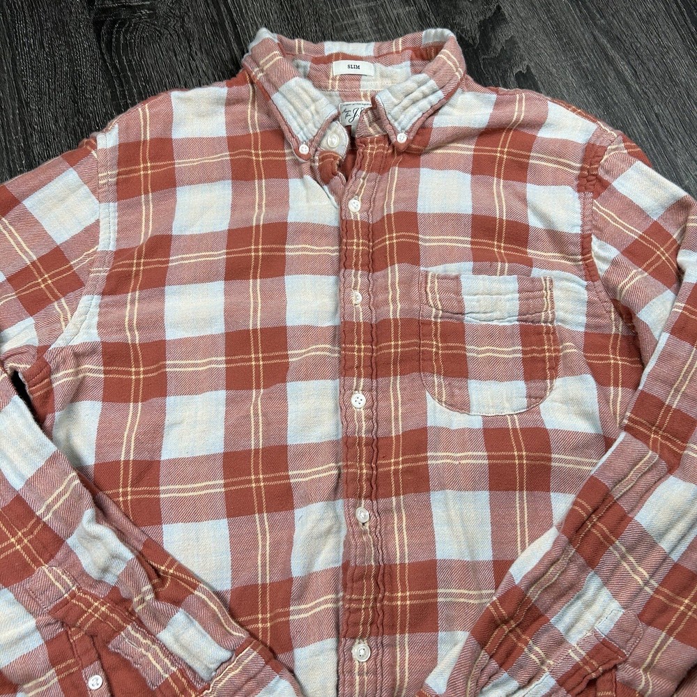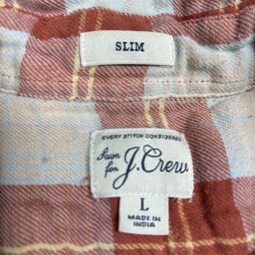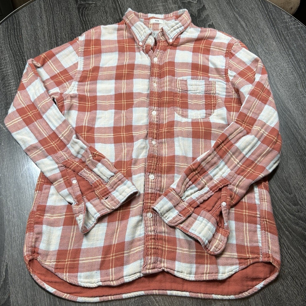 J.Crew Flannel Button SLIM Shirt Men's L Orange Plaid Mid Weight Outdoor *see photos of multiple small pulls on front of shirt and sleeve *see photos for measurements Pre-owned good condition Thanks for shopping with us!