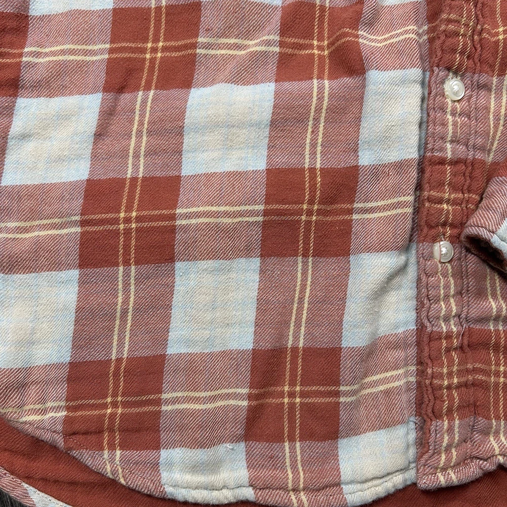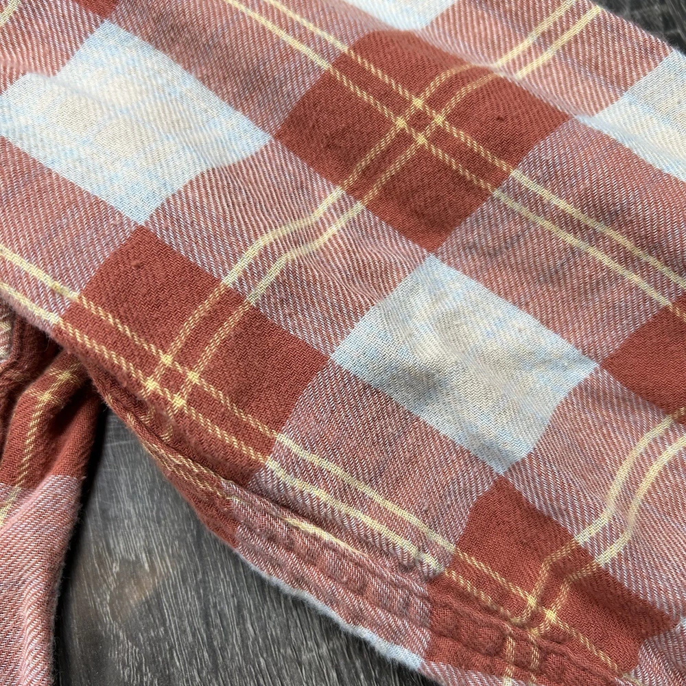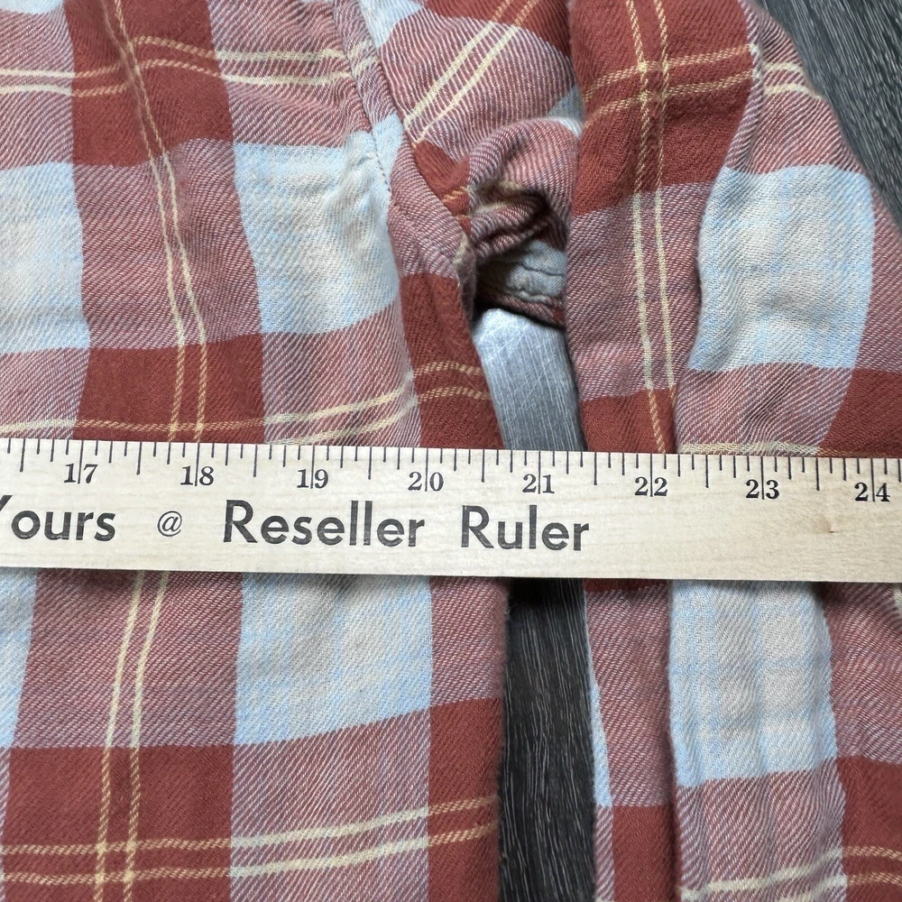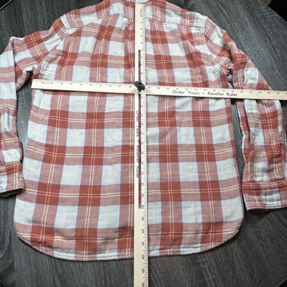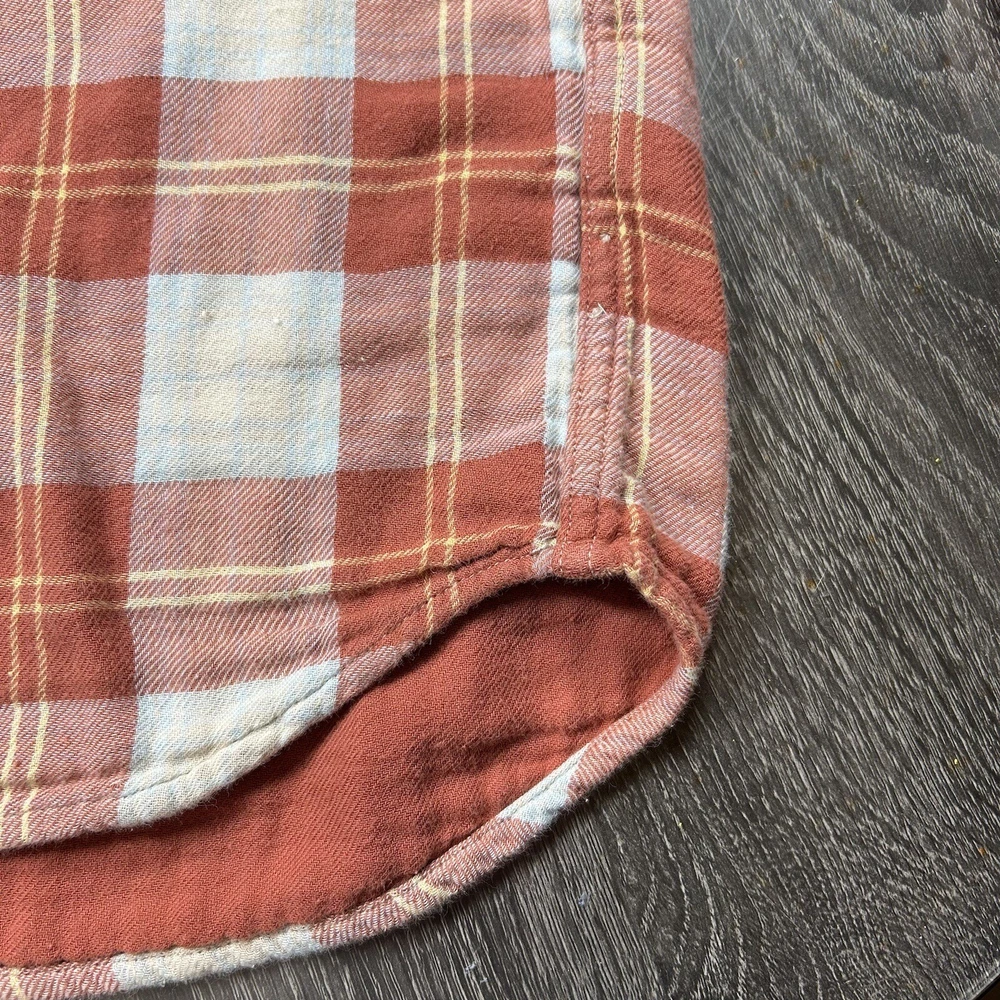 J.Crew Flannel Button SLIM Shirt Men's L Orange Plaid Mid Weight Outdoor *see photos of multiple small pulls on front of shirt and sleeve *see photos for measurements Pre-owned good condition Thanks f...