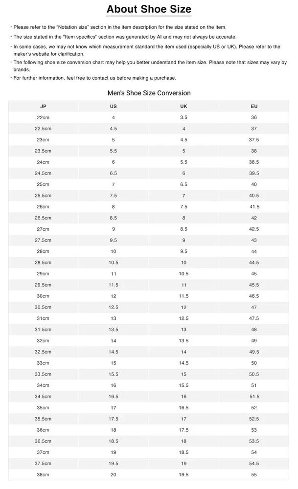 • Before purchasing, please read this page in conjunction with the notes at the bottom of the page, and by placing an order and making payment, you agree to be bound by the product conditions and notes. • International shipping will be facilitated through our central shipping center in Japan. Please allow approximately 10 business days for us to handle the item, from dispatching it from our local store to preparing it for international shipping in our central shipping center. • Tracking number will be provided only after the item reaches our central shipping center in Japan. • Item details and descriptions have been translated by AI, so occasional mistakes may occur. If you encounter any issues, please don't hesitate to reach out to us. PRODUCT INFORMATION Brand JOHN LAWRENCE SULLIVAN Style Others Department Men Type Dress Color White Pattern Others Features Others Vintage No Customized No Theme Others Model Others Outsole Material See images Upper Material See images US Shoe Size 3 UK Shoe Size 2 AU Shoe Size 2 EU Shoe Size 38 Shoe Width A ABOUT CONDITION N Like New ~ Unused S unused item A Used goods in relatively good condition with little feeling of use B second-hand goods with a feeling of use where damage or dirt can be seen C second-hand goods with lots of dirt and damage (difficult items) About Us We are a second-hand chain store in Japan. We offer a wide selection of premium branded items, including designer bags, wallets, jewelry, watches, fashion items, and more. All items have been inspected and authenticated by professional authenticators in Japan. About Payment • Only eBay managed payments are accepted. • We do not do transactions outside of eBay. Shipping & Taxes • Free Shipping Worldwide. • All items will be shipped via Japan Post with tracking service (EMS or ePacket). • All orders will be shipped from Japan to the registered address on the buyer's eBay account. • Shipments may be delayed due to bad weather, public holidays, customs office delays, and other conditions beyond our control. • All customs duties, import taxes or related fees occurred during shipping are the responsibilities of the buyer. If you have any concerns, please inquire directly with your local customs office before making a purchase. Return & Cancellation Policy • All listed items are also available at our retail store and multiple online platforms in Japan. In the event that an item is out of stock or sold, we will issue a cancellation along with a full refund. • If you wish to return an item for a refund, please contact us directly before initiating a return or opening a case. • For damaged items or discrepancies with the item description, please reach out to us directly within 10 days of receiving the item, providing pictures of the damaged area or issues. • Unless the item is damaged or does not match its description, buyers will be responsible for the return shipping fee. > All returns must be shipped to our address in Japan with a tracking number. > Refunds will be processed once the returned item has arrived safely. • Buyers who violate eBay policies or misuse eBay's Money Back Guarantee will be reported and blocked from future purchases. click here to see our store