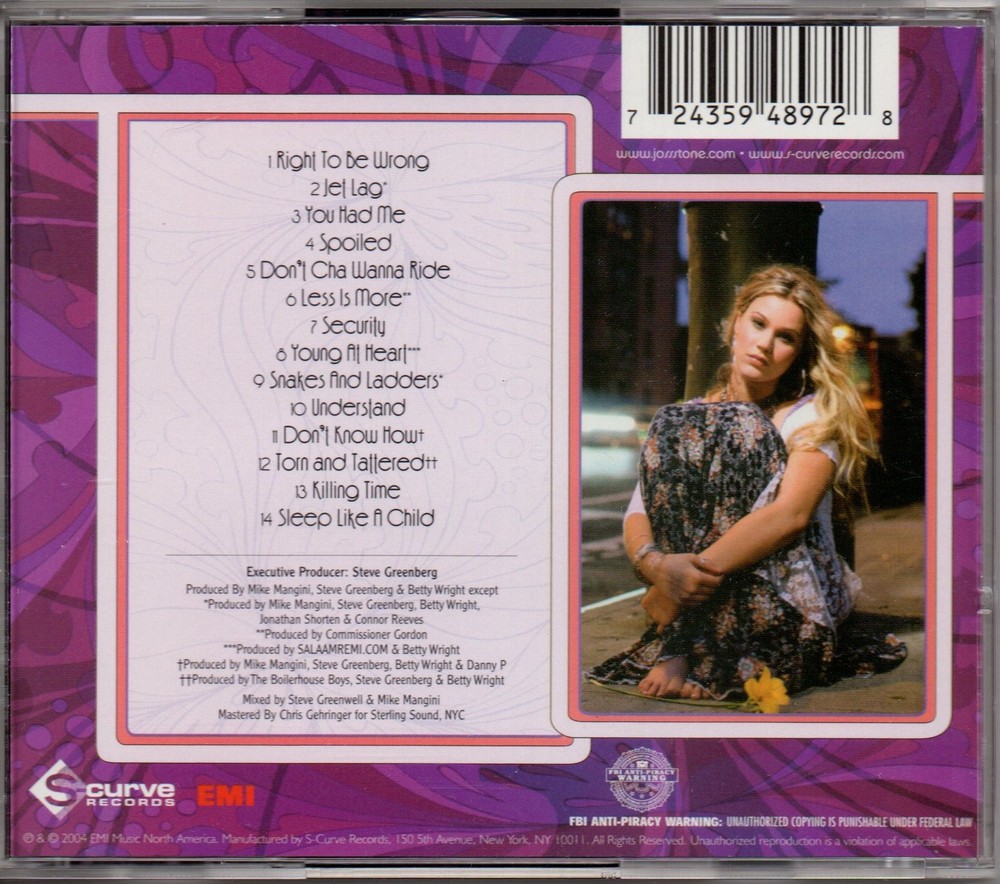 JOSS STONE "MIND, BODY & SOUL" CD Curve Records/ EMI USA 94897-2 (2004). Stereo. Includes "Right To Be Wrong", "Jet Lag" and 12 more! CD, booklet with lyrics, inlay in jewel case - all in excellent condition. See photo detail for contents. Email with questions. Shipping/ handling is $2.50 First Class Mail. Well-packed and quick ship. International higher rate. Thank you!