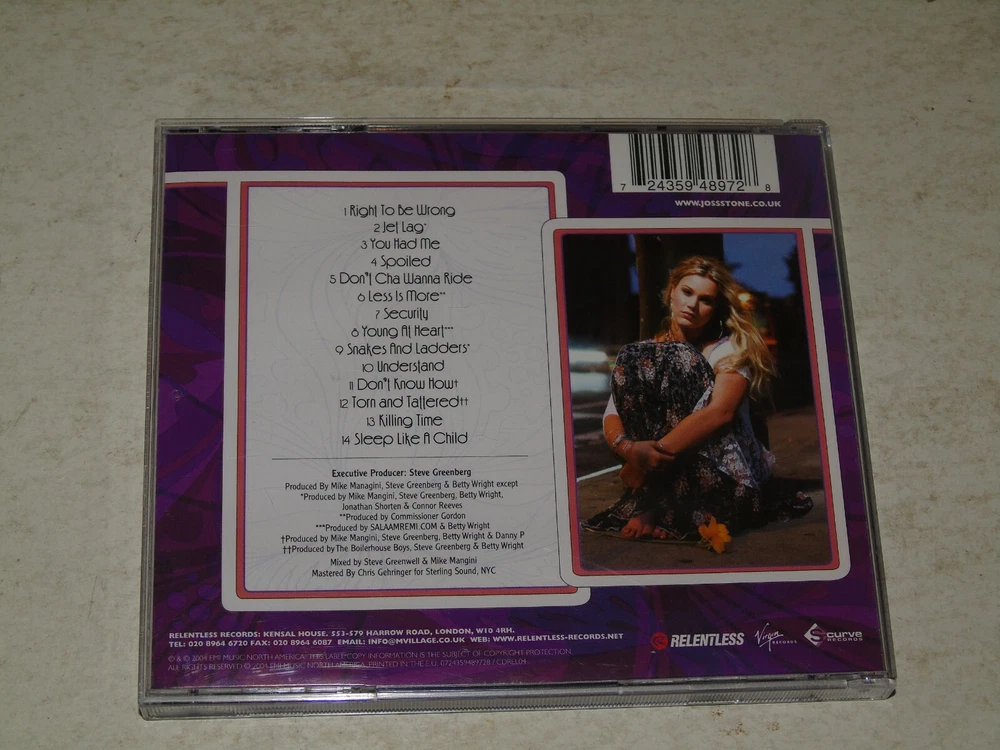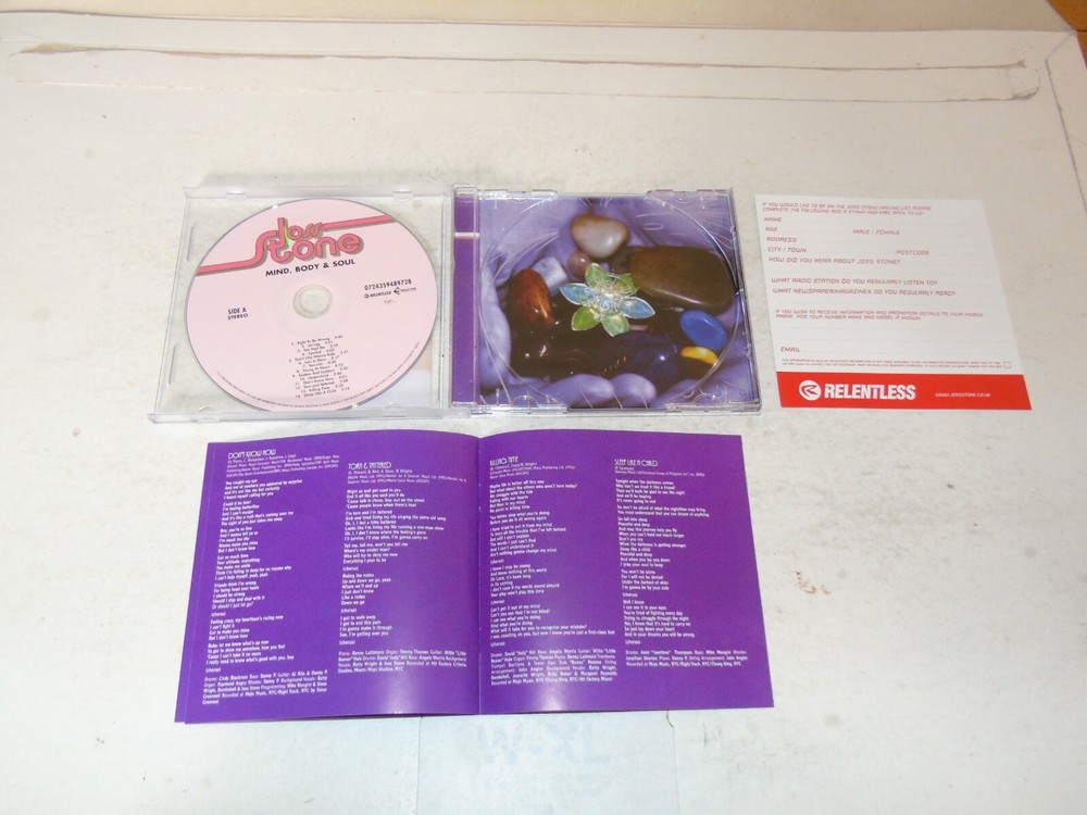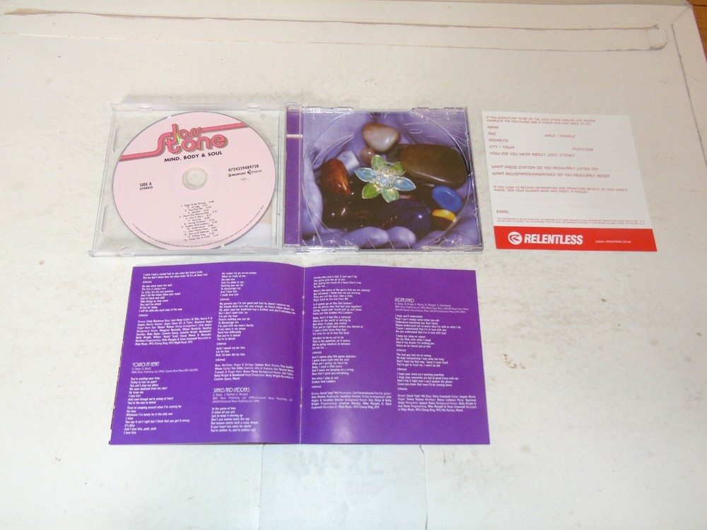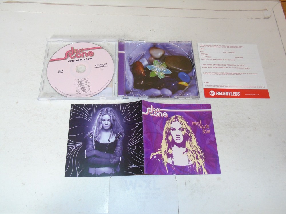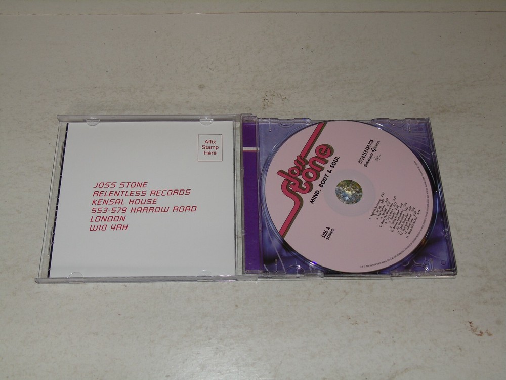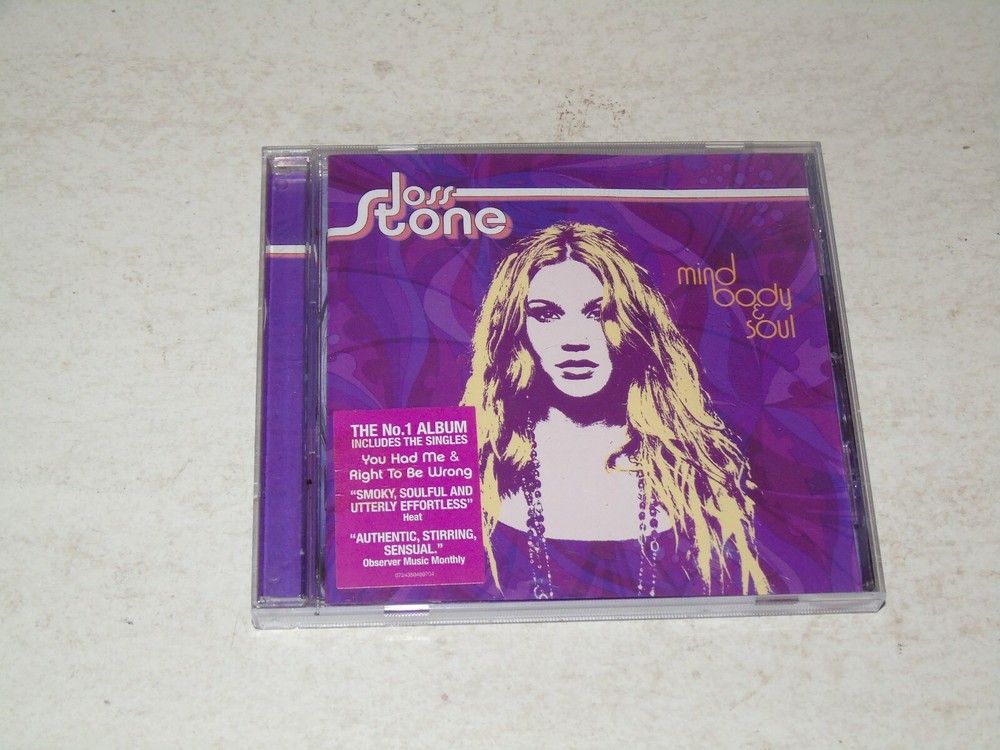 JOSS STONE - Mind Body & Soul 2004 UK 14-track CD album Her second studio album Including the singles You Had Me, Right To Be Wrong, Spoiled and Don't Cha Wanna Ride Complete with the picture / lyric inlay Housed in a original Jewel case Tracks : 1. Right To Be Wrong 4:40 2. Jet Lag 4:01 3. You Had Me 3:59 4. Spoiled 4:03 5. Don't Cha Wanna Ride 3:31 6. Less Is More 4:17 7. Security 4:30 8. Young At Heart 4:20 9. Snakes Find Ladders 3:35 10. Understand 3:46 11. Don't Know How 4:01 12. Torn And Tattered 3:58 13. Killing Time 5:20 14. Sleep Like A Child 5:19 Catalogue number - 072439489728 Record Label - EMI Records Country of manufacture - UK Shipping includes the cost of delivery as well as the item being packaged and despatched in a cardboard Backed envelope. If you purchase more than one item the cost of Shipping is an additional 50p per item won. If you purchase over 5 items and you live are outside the UK please note there may be an additional costs dependent on the weight of the item and as such we may ask for an higher amount than an extra 50p per extra item depending which part of the world you live in and how many items you have purchased. Payment Details Please pay within 3 days of purchase and payment may be made by PayPal, personal cheque or British Postal Order Please note that cheques will have to clear before the item is dispatched