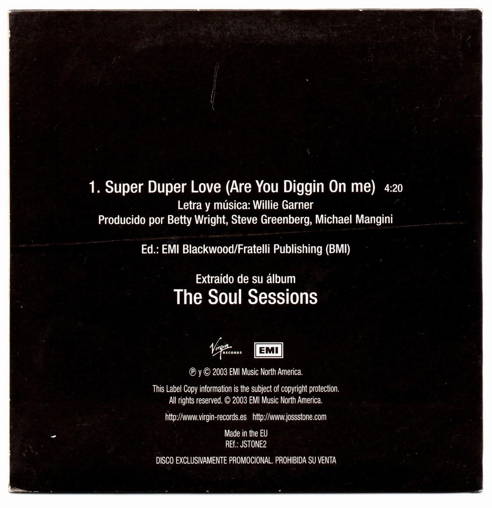 JOSS STONE Ultra Rare SPANISH ("MADE IN SPAIN") DJ PROMO CD SINGLE with 1 track : SUPER DUPER LOVE (ARE YOU DIGGIN ON ME?) (4'20) Wonderful and UNIQUE PICTURE SLEEVE in CARD SLEEVE. This RARE DJ PROMO CD SINGLE is ONLY issued in SPAIN and ONLY for RADIO STATIONS AIRPALY and very few copies pressing (minus than 200 copies). Cat. number: JSTONE2 This RARE DJ PROMO CD SINGLE is from 2.003 and NOW is VERY, VERY HARD TO FIND because the CD is OUT OF PRINT for many years ago!! Special item for all the JOSS STONE fans and collectors. I SHIP ALL MY ITEMS BY REGISTERED AIRMAIL (with INSURANCE). IN THIS WAY EBAY AND PAYPAL CAN KNOW WHAT I SENT YOU THE PACKET AND EBAY AND PAYPAL CAN KNOW WHAT YOU RECEIVED THE PACKET BECAUSE THESE PACKETS ARE TRACKED AND YOU NEED PUT YOUR SIGNATURE FOR PICK-UP THE PACKET!! Payment must be received within 4 days of the auction ending date.