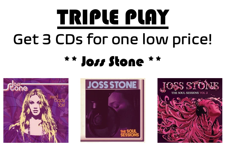 ** TRIPLE PLAY SALE ** ARTIST: Joss Stone FORMAT: CD NOTES: 3 Great Albums at 1 Low Price! Mind Body & Soul (promo copy with small cut across spine) The Soul Sessions (promo copy with white line across UPC and record company label on disc) The Soul Sessions, Vol. 2 (brand new and shrink-wrapped) SELLER DISCLOSURE: CDs are from my private collection and were only played a couple of times (except for Soul Sessions, Vol. 2 which is still sealed). Many thanks for taking the time to check it out and good luck in your search!