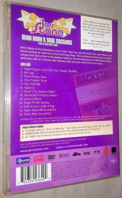 JOSS STONE-MIND BODY & SOUL SESSIONS:LIVE IN NEW YORK CITY-DVD English singer-songwriter Joss Stone's great talent is featured in her first concert release, MIND, BODY & SOUL SESSIONS: LIVE IN NEW YORK CITY. The concert footage is from Stone's sold-out show at New York City's Irving Plaza, a venue known for its intimacy and for hosting the best alternative and cutting -edge acts on the contemporary music scene. The youthful Stone is known for her unique renditions of soul and R&B classics, but has also emerged as a skillful songwriter. She has collaborated on songs with other artists as diverse as Betty Wright, Portishead's Beth Gibbons, and the Roots. The MIND, BODY & SOUL SESSIONS contains performances by Stone of hits from both of her multi-platinum albums, THE SOUL SESSIONS and MIND, BODY & SOUL--including her singles "You Had Me," "Super Duper Love," and "Fell in Love With a Boy," a re-working of a song by fellow hipsters the White Stripes. The MIND, BODY & SOUL SESSIONS allows fans to get close to Stone at her best, in a soulful live performance in a special setting. Label: S-Curve Records – 7243 5 44364 9 9 Format: DVD, DVD-Video Country: CANADA Released: 2004 Genre: Funk / Soul Style: Soul TRACKLIST: 1 Super Duper Love (Are You Diggin' On Me) 2 Jet Lag 3 Don't Know How 4 The Choking Kind 5 You Had Me 6 Spoiled 7 Don't Cha Wanna Ride? 8 Victim Of A Foolish Heart 9 Less Is More 10 Right To Be Wrong 11 Fell In Love With A Boy 12 Some Kind Of Wonderful 13 Dirty Man (Acoustic) Mini Documentary 14 Joss Performs Her Way Across The U.S. And Europe For The First Time In 2004 Out-Takes 15 From The Filming Of Mind, Body & Soul Sessions Videos 16 Fell In Love With A Boy 17 Super Duper Love 18 You Had Me