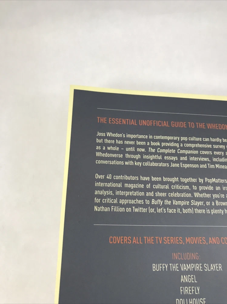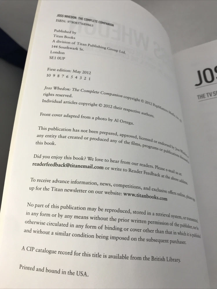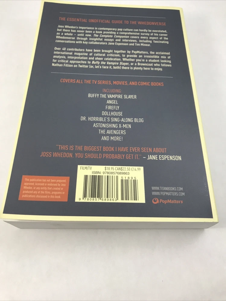 JOSS WHEDON The Complete Companion PopMatters Titan Books 2012 Paperback Lightly or never read. In great shape. See pictures for more details. ________________________________________________________ We take pride in our packing and shipping. All our items are packed and shipped with care. We also like to recycle, so some of our items will arrive in re-used boxes with non-ebay labeling. We can combine shipping, just contact us and we will work it out how you want it. Thanks for taking a look. If you have any questions, we would be happy to answer them.