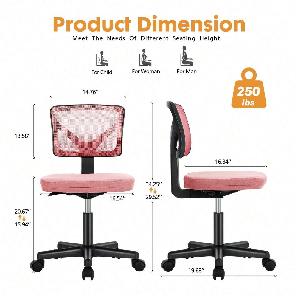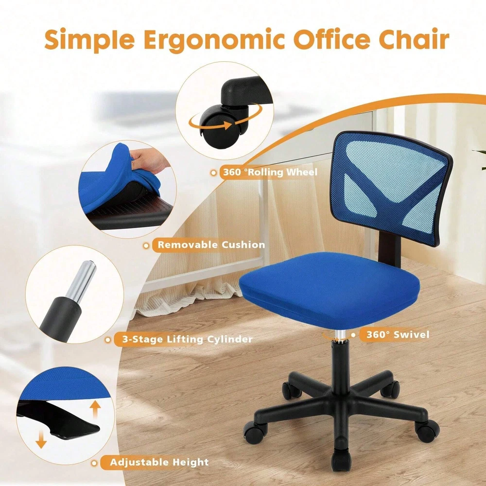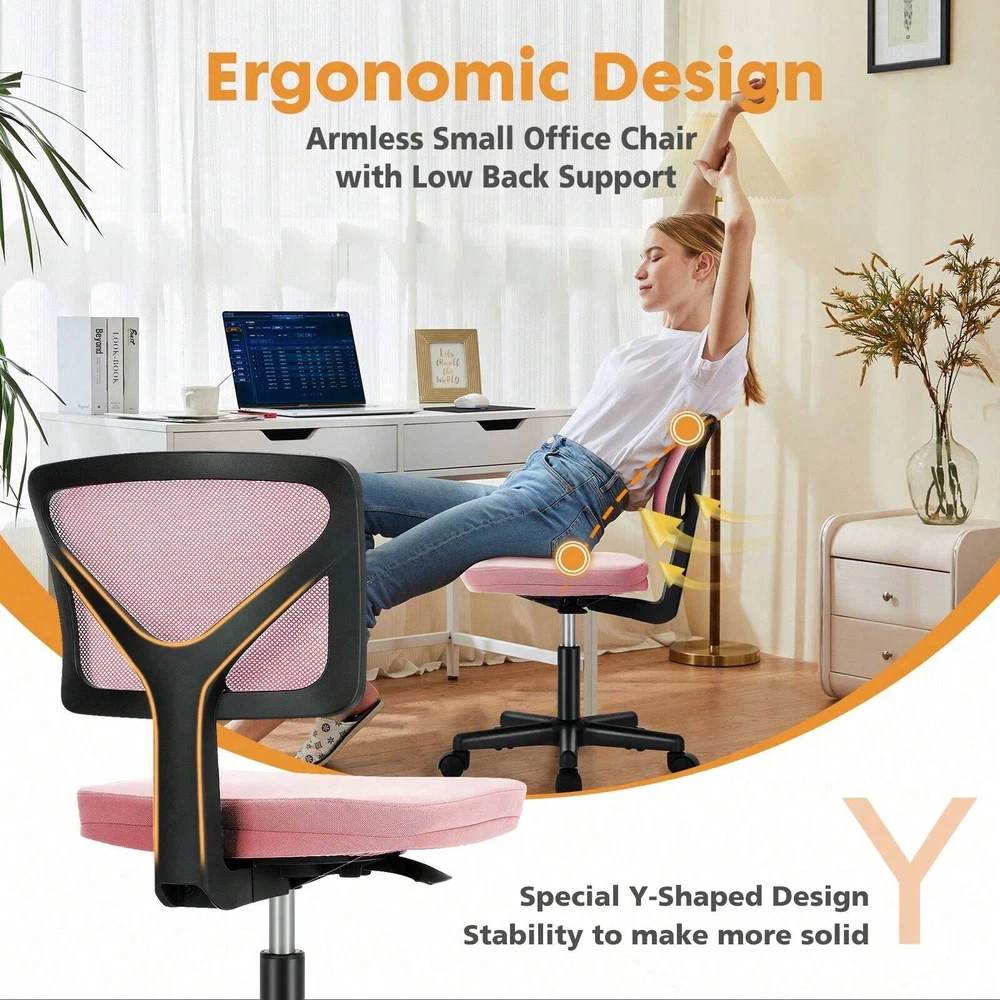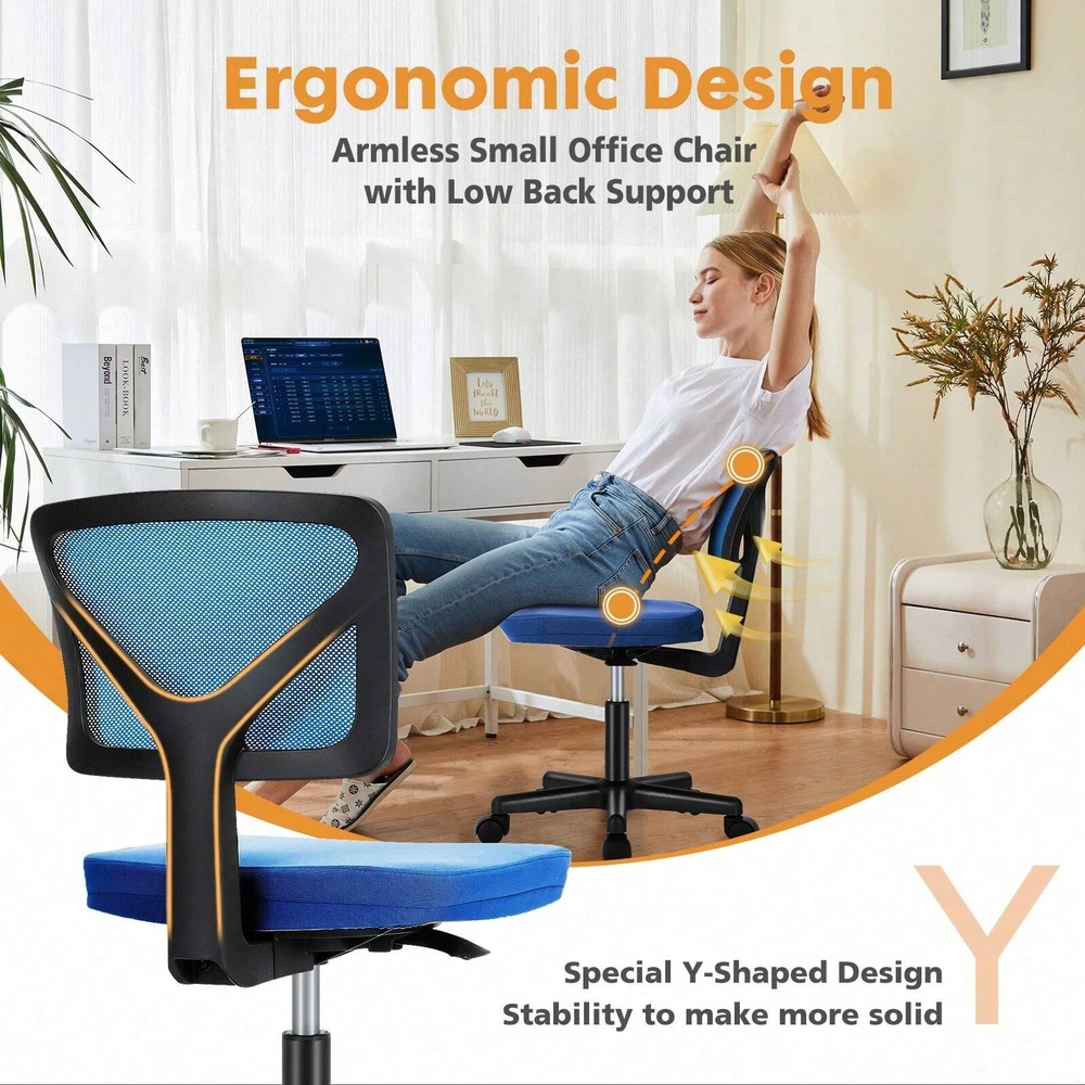 This chair is surprisingly comfortable for long work sessions! The ergonomic mesh design keeps my back supported without feeling stiff, and the mid-back height is just right. The lack of armrests actually gives me more freedom to move, and the seat cushion stays firm but soft. Perfect for small home offices—no regrets! Shipping was smooth, too. Highly recommend!