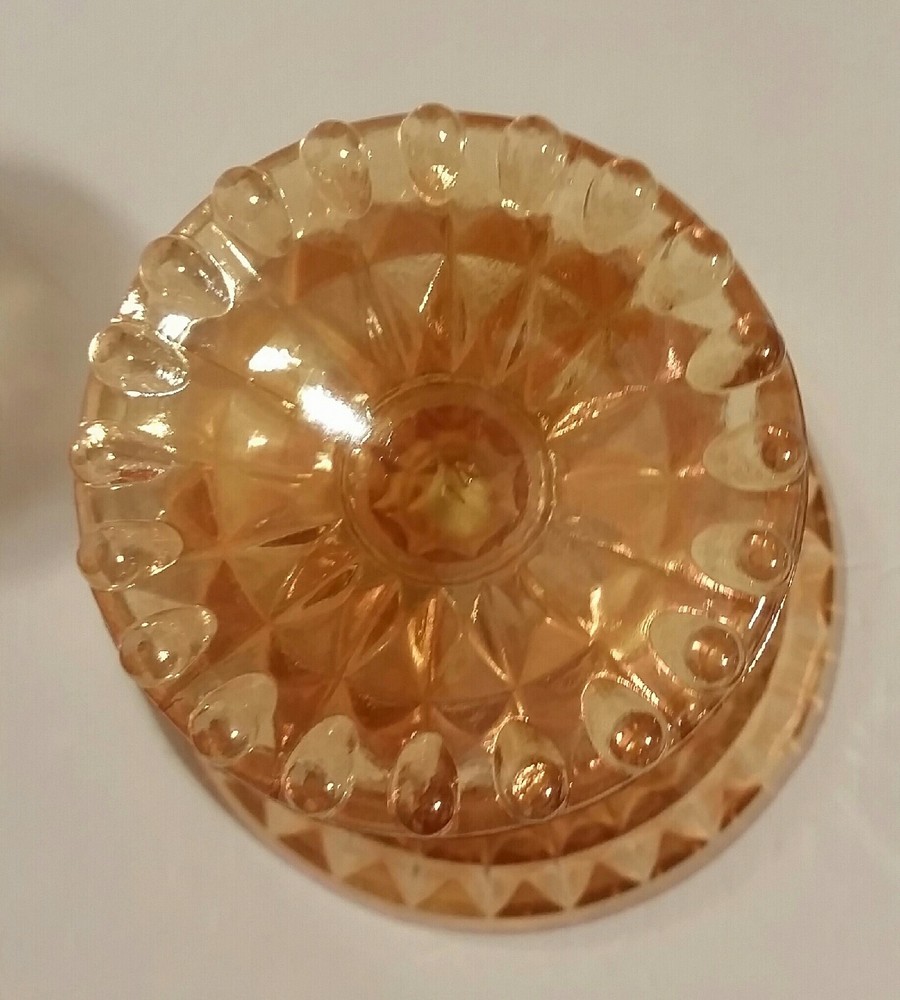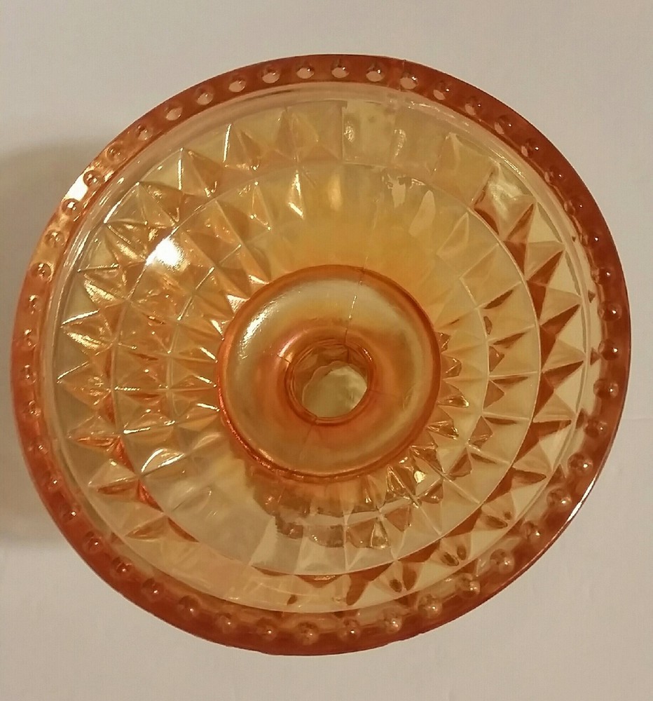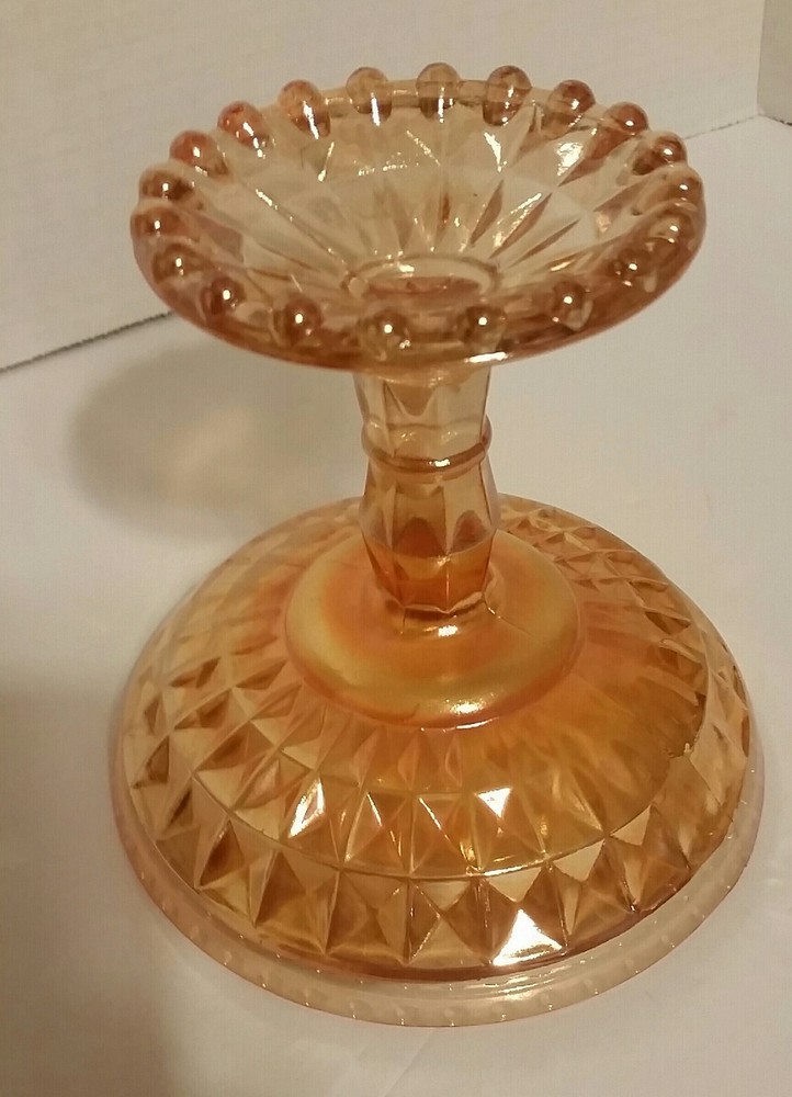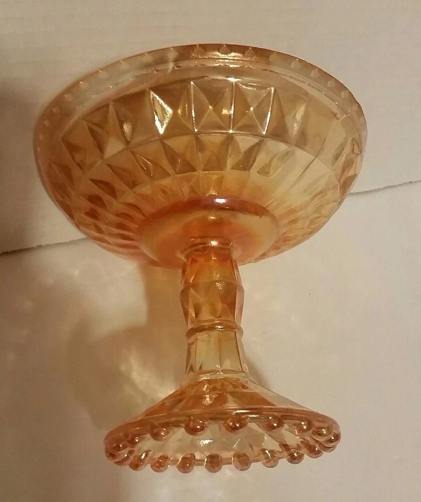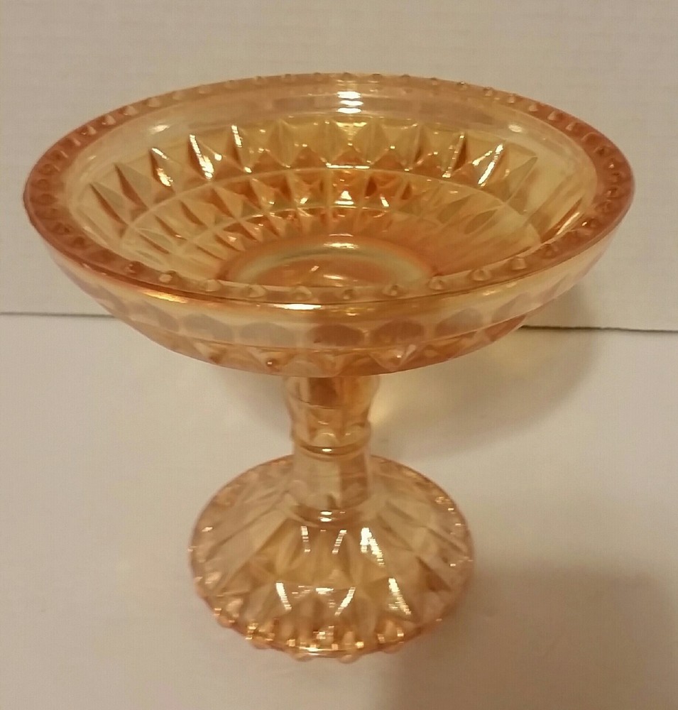 Jeanette Windsor Marigold Lustre Pedestal Compote Dish. This is a Beautiful Jeannette Windsor Marigold (Peach Colored) Pedestal Compote Dish. This well preserved piece measures 6"wide and 5-1/2" tall. It has beautiful Lustre of Peach & Gold coloring. It has gorgeous diamond cuts with small beads on the top and bottom. No Chips or Cracks What you see in the pictures is what you are getting. Any questions please feel free to email me. Browse other items we have to add to your collection. We strive to earn a positive 5 star feedback for all our items. If you feel we deserve anything less than a 5 star positive feedback, please send us a message directly before leaving feedback or opening up a case so we can resolve your issue.
