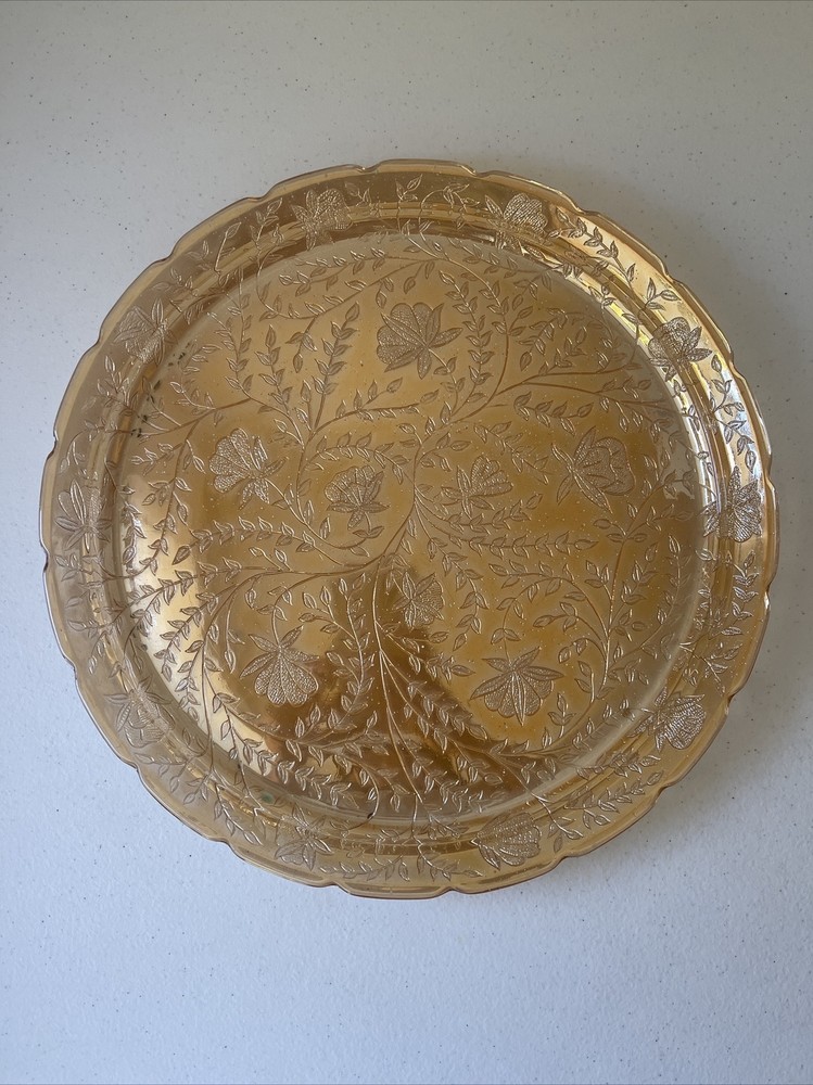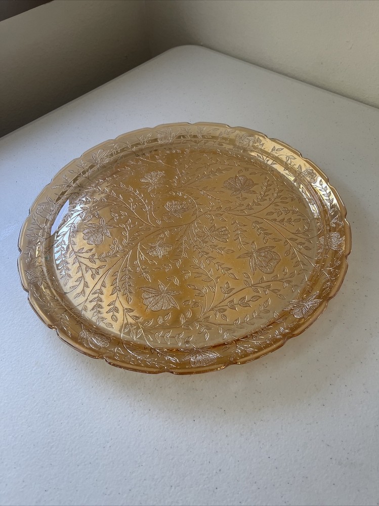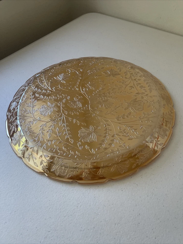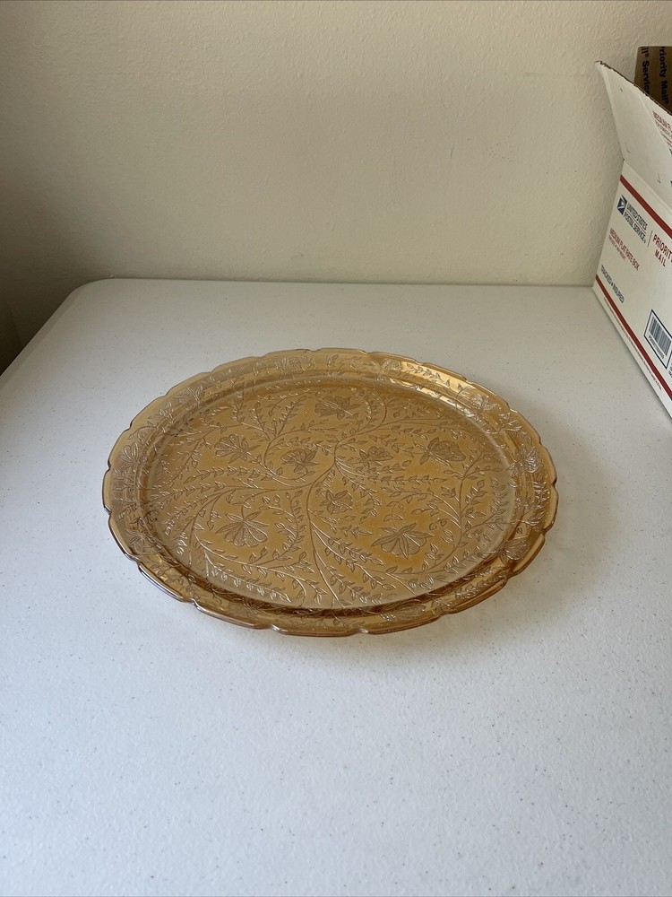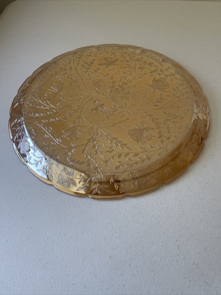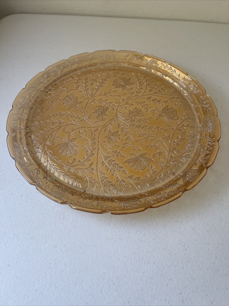 This unique plate by Jeannette Glass is a stunning addition to any collection. With a gorgeous orange floral pattern on a 13.5" glass surface, it's perfect for serving cakes or other desserts. Made in the mid-20th century, this vintage piece is both beautiful and functional. The Floragold Louisa Marigold plate is in great shape and ready for use. It's a wonderful find for any collector or lover of vintage decor. Add this stylish plate to your collection today!