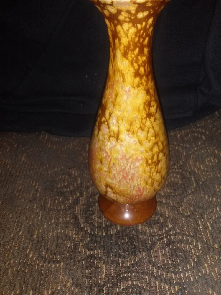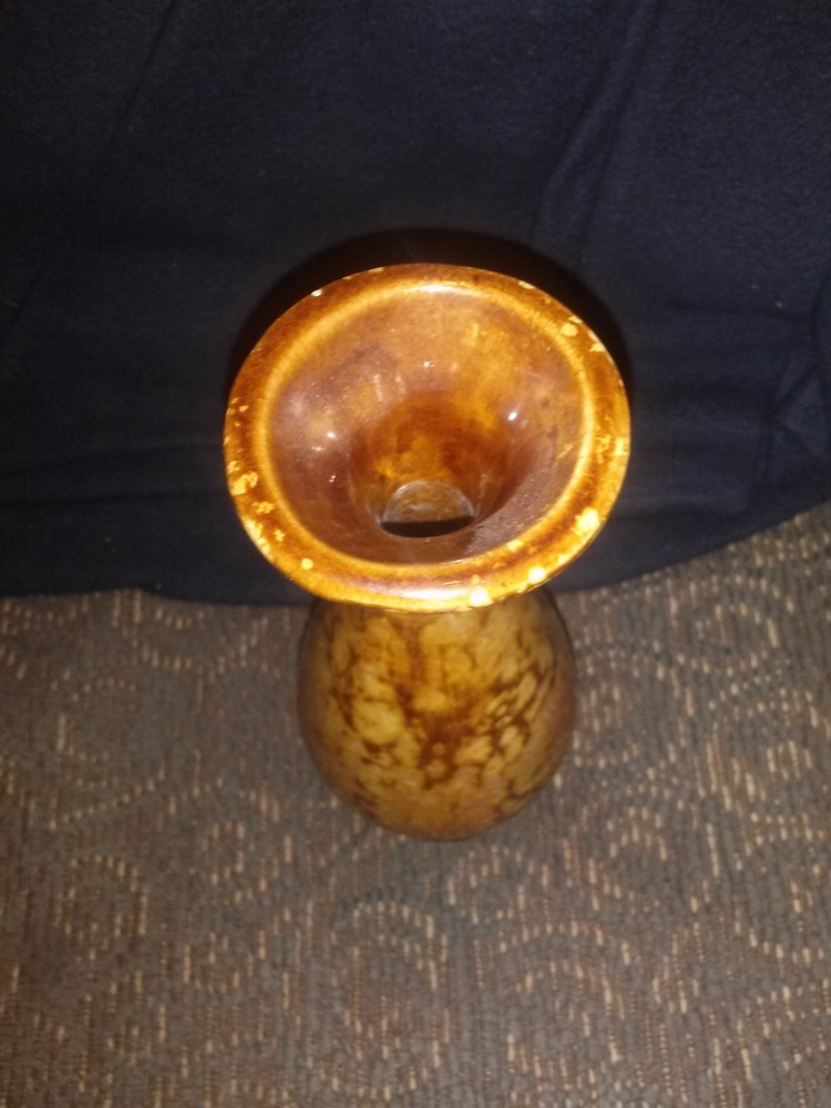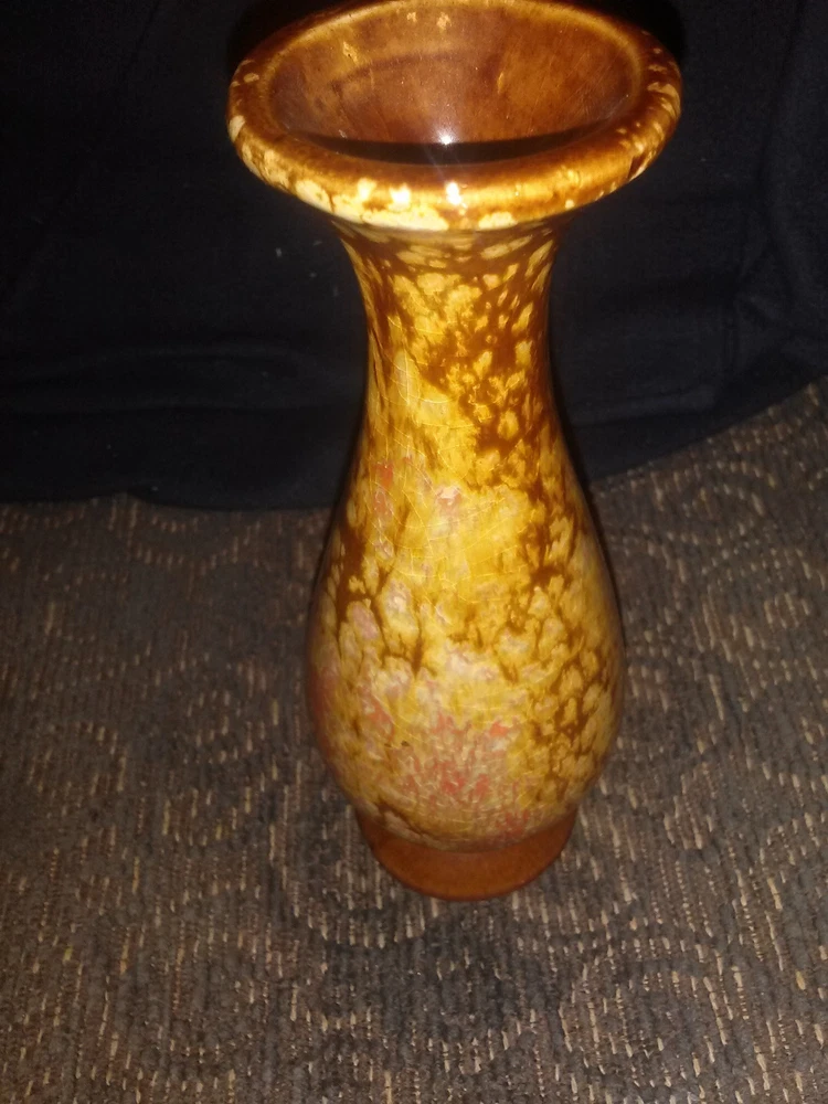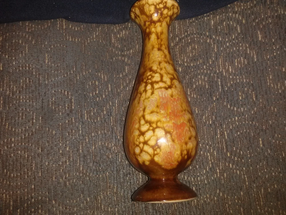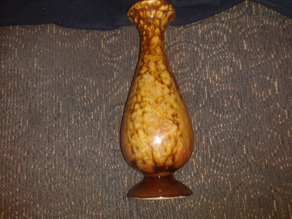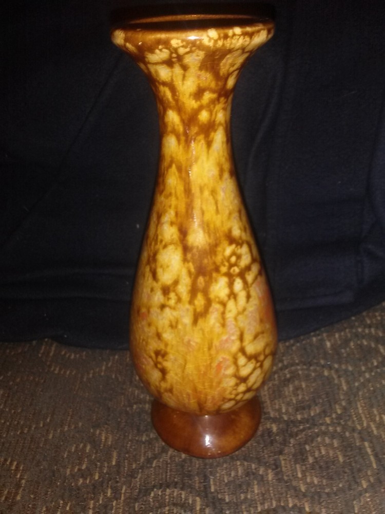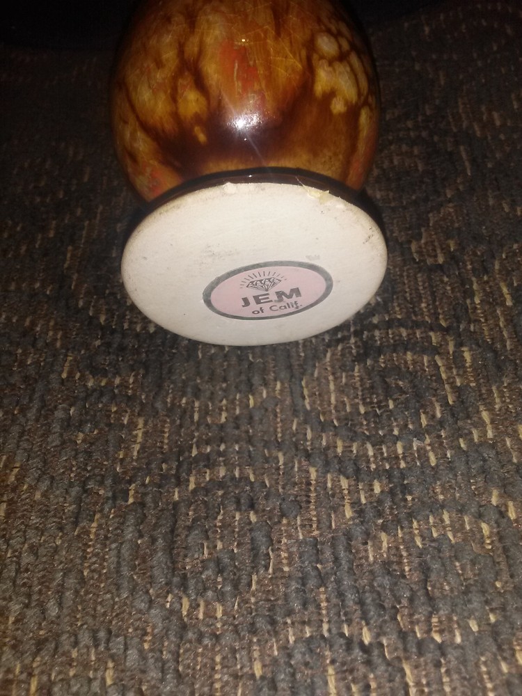Jem of California Drip Glaze Bud Vase , 1960s pottery vase with lovely rust, orange, gold drip glaze, marked with gold foil tag on bottom "Jem of Calif.". Measures 6 1/4"high x 2"wide base. Very good pre-owned vintage condition, no cracks or crazing.