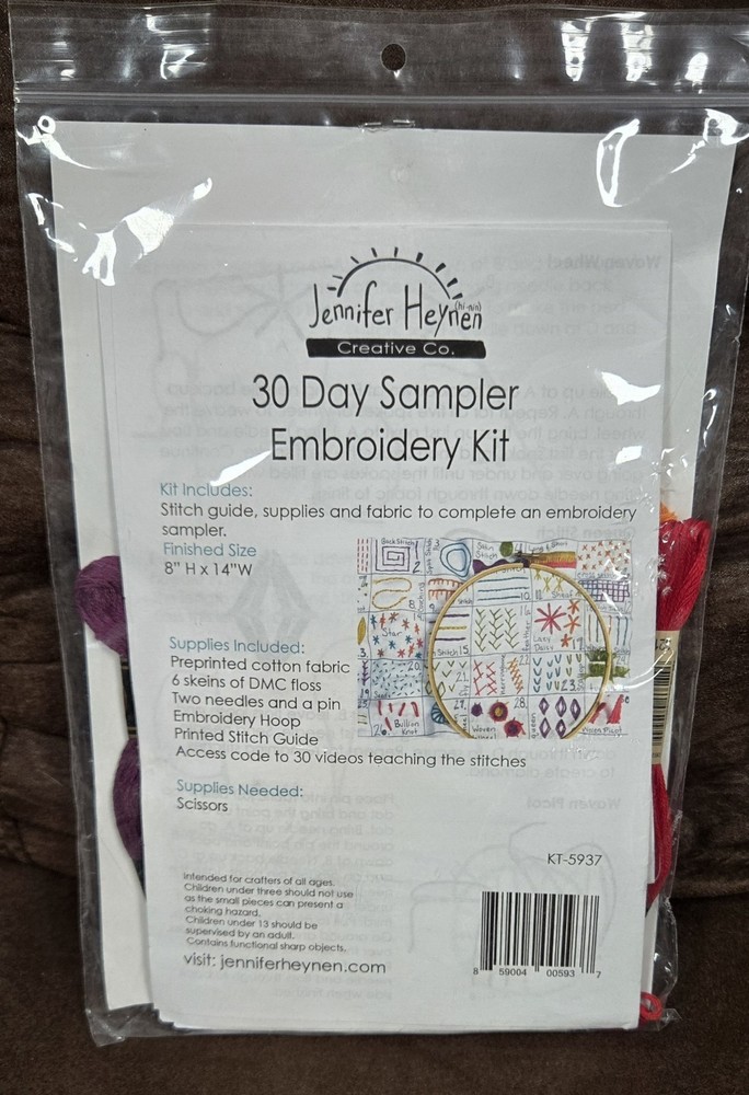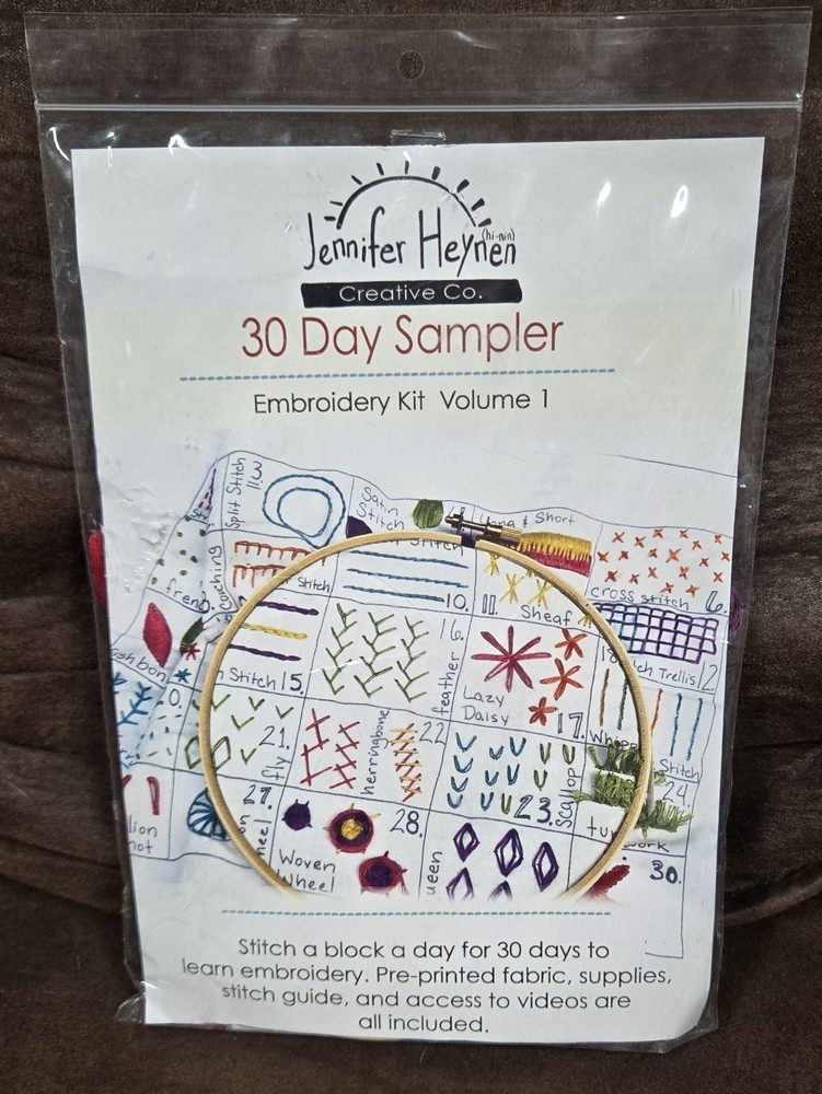 Jennifer Heynen 30 Day Sampler Embroidery Kit Volume 1 KT-5937 Stitch a block a day for 30 days to learn embroidery. Kit includes pre printed fabric, supplies, stitch guide & access to videos are all included. Finished size 8" H x 14" W You will need scissors not supplied in kit. I'm happy to answer any questions