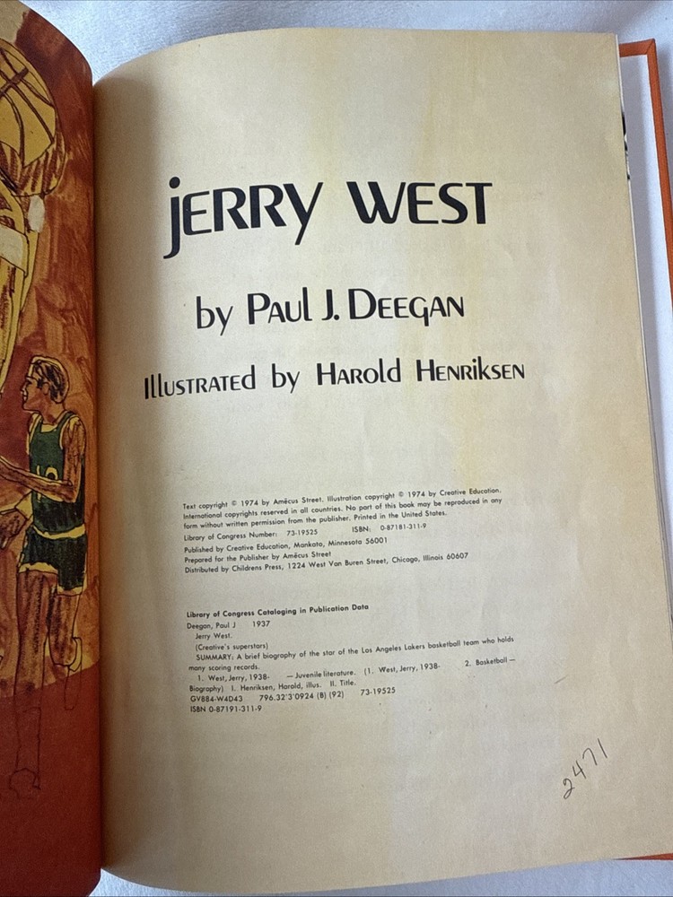 Dive into the world of basketball with "Jerry West: Superstars" by Paul J. Deegan, a compelling addition to any sports enthusiast's collection. Published in 1974 by Creative Company, T.H.E., this hardcover offers a nostalgic journey through the life and career of the legendary Lakers player. Aimed at young adults and ages 9-12, it's a treasure for both juvenile nonfiction lovers and fans of the sport. With illustrations by Harold Henriksen, the book brings to life the expressions and energies of basketball, capturing the essence of the game and its athletes. Though ex libris and boasting a vintage charm, this collector's edition remains a vibrant tribute to Jerry West's impact on basketball and a captivating read for anyone interested in sports and recreation.