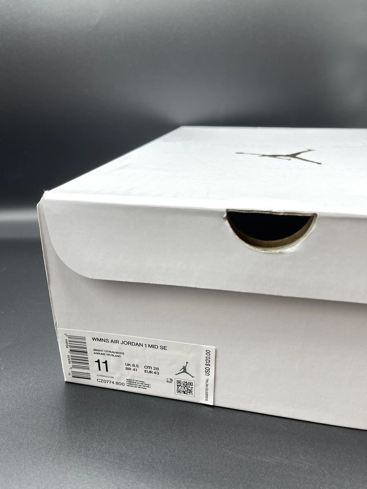 Jordan 1 Mid SE Bright Citrus ORANGEY FRESHNESS. Shine in this season's Air Jordan 1 Mid SE "Bright Citrus/White" Women's Shoe, a smooth take on one of the most coveted sneakers in history. It's got premium leather throughout, with bright, citrusy underlays paired with clean white overlays. Size: 11 (Womens), 9.5 (Mens) Color: BRIGHT CITRUS/WHITE Style: CZ0774-800 DEADSTOCK! In stock and ready to ship. 100% authentic or your money back guaranteed. Your purchase includes FREE SHIPPING . It ships in two boxes, the shipping box and original shoe box. Please don't hesitate to reach out with any questions or offers.