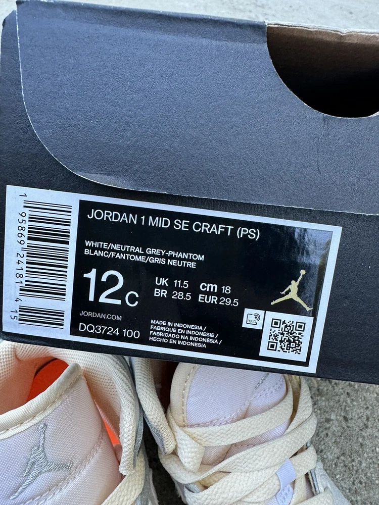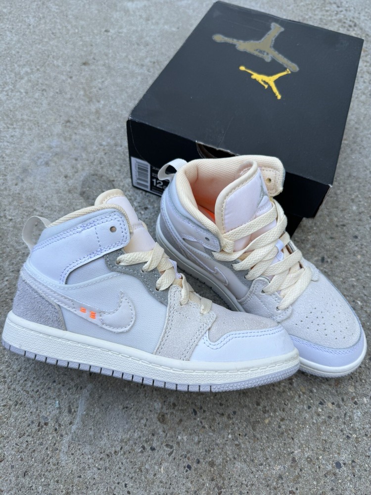 Jordan 1 Mid SE Craft Inside Out White Grey (PS) Kids Size 12 White / Gray / Peach NEW in box...