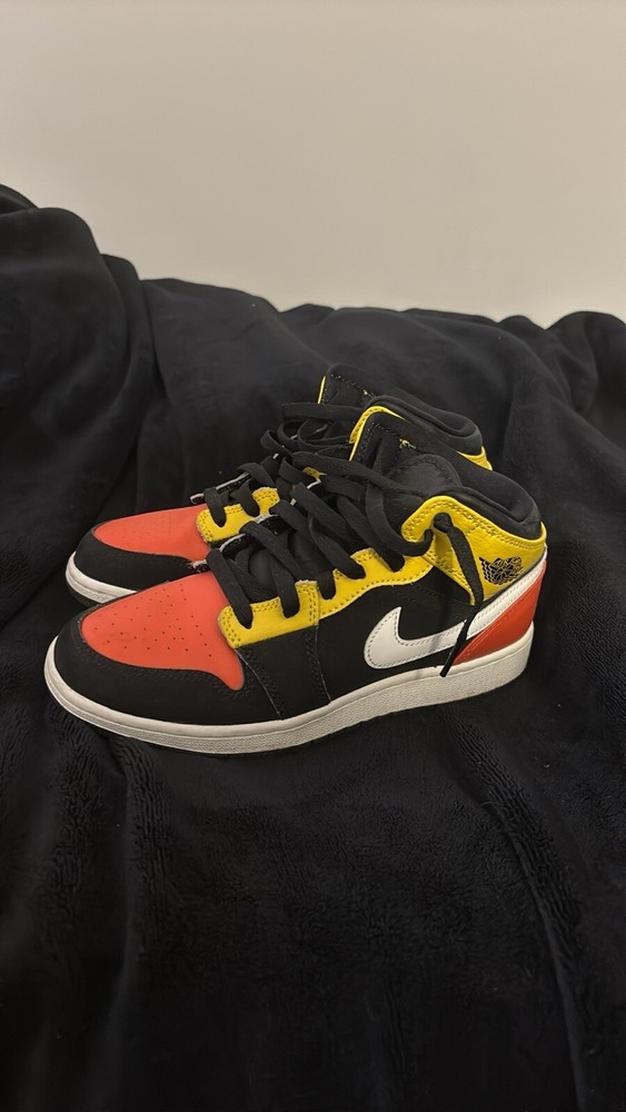 Jordan 1 Mids Boys Sneakers Size 6 Yellow Orange Black White, 4.5