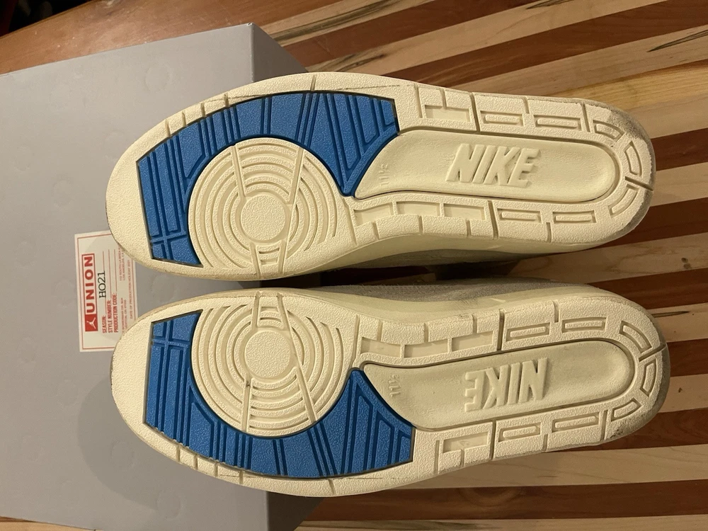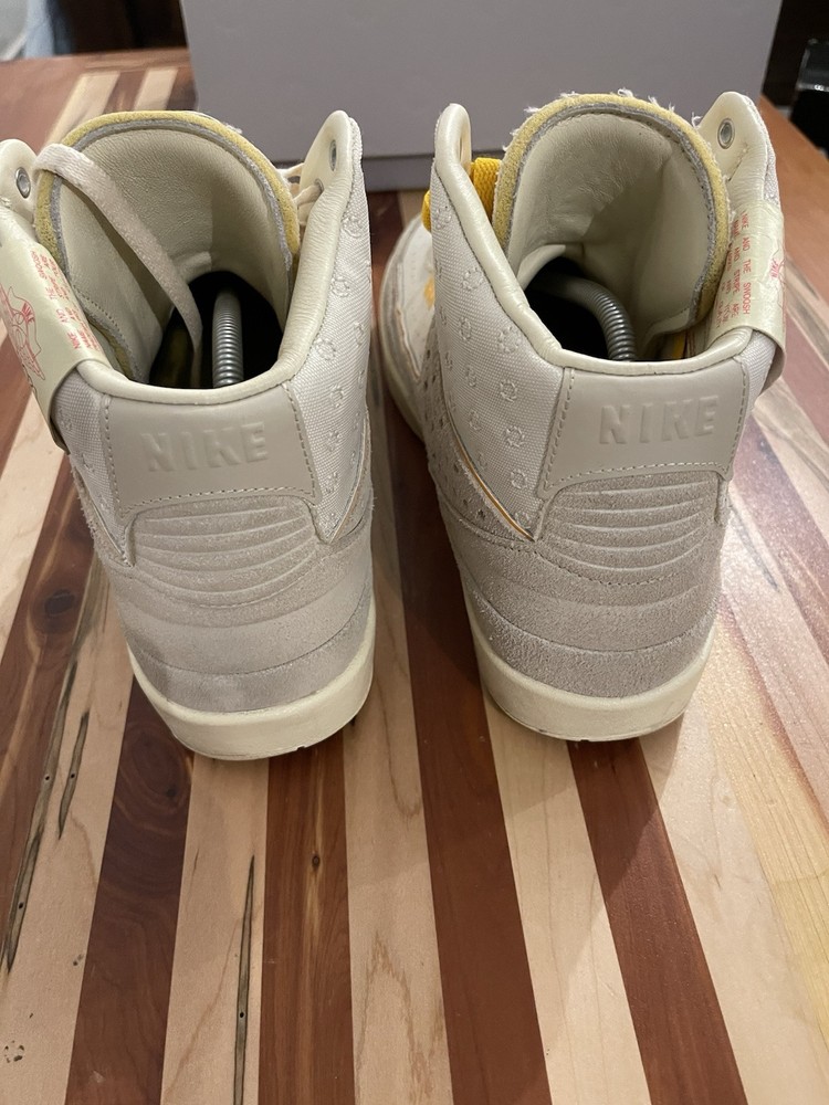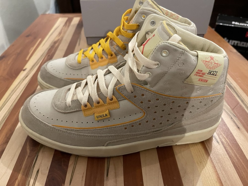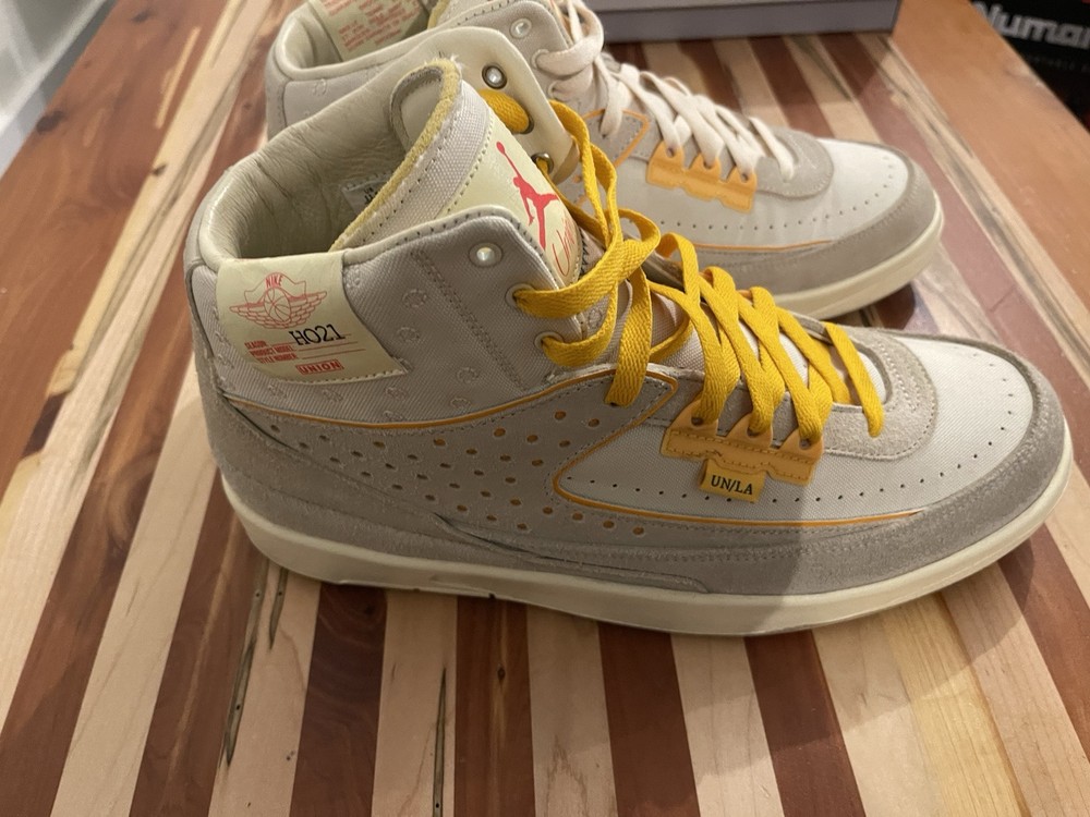 This is a pre-owned pair of Jordan 2 Union Retro sneakers in a multicolor design featuring shades of Beach, Orange Peel, Rattan, and Siren red these shoes are in great shape only worn two or three times always kept clean and worn with crease guards