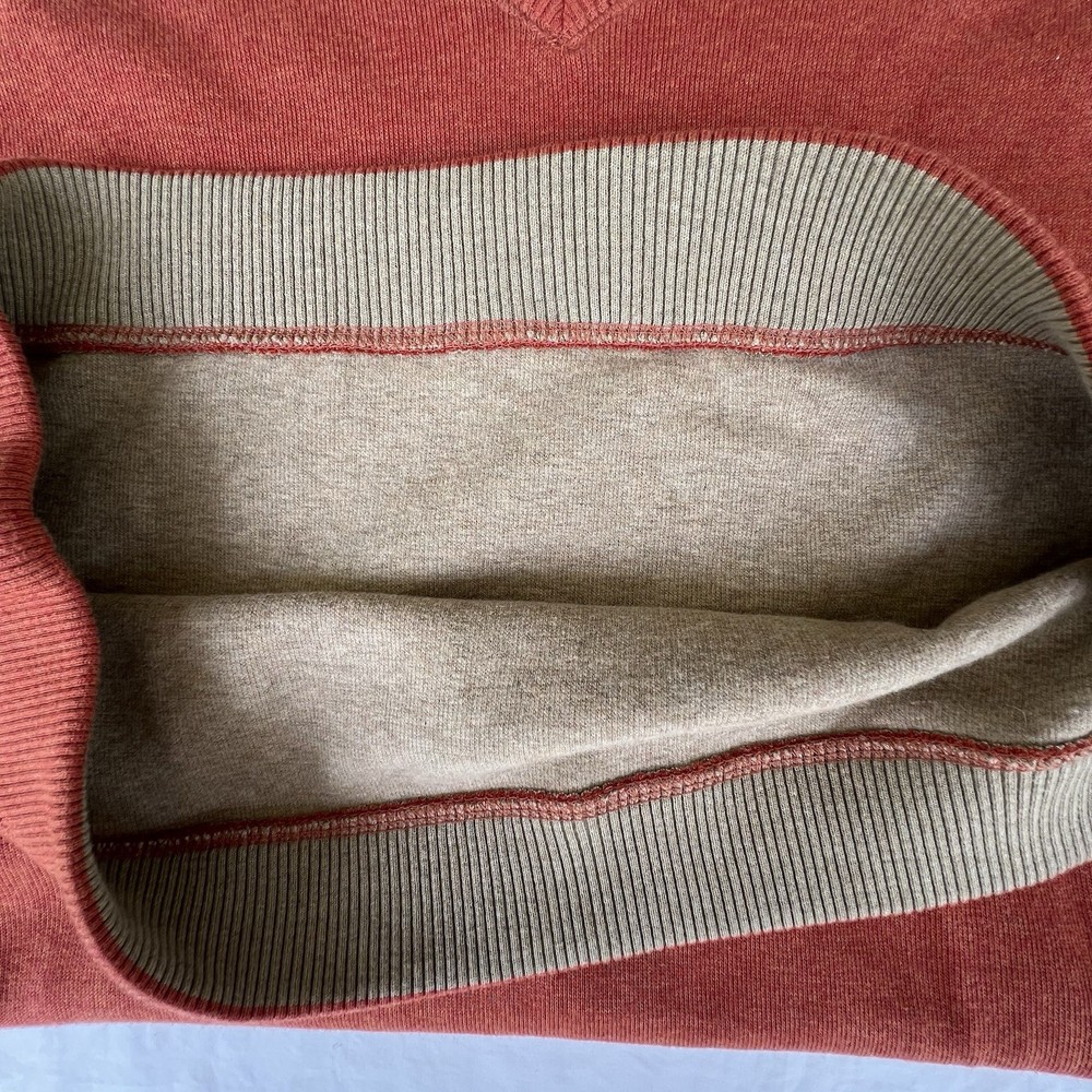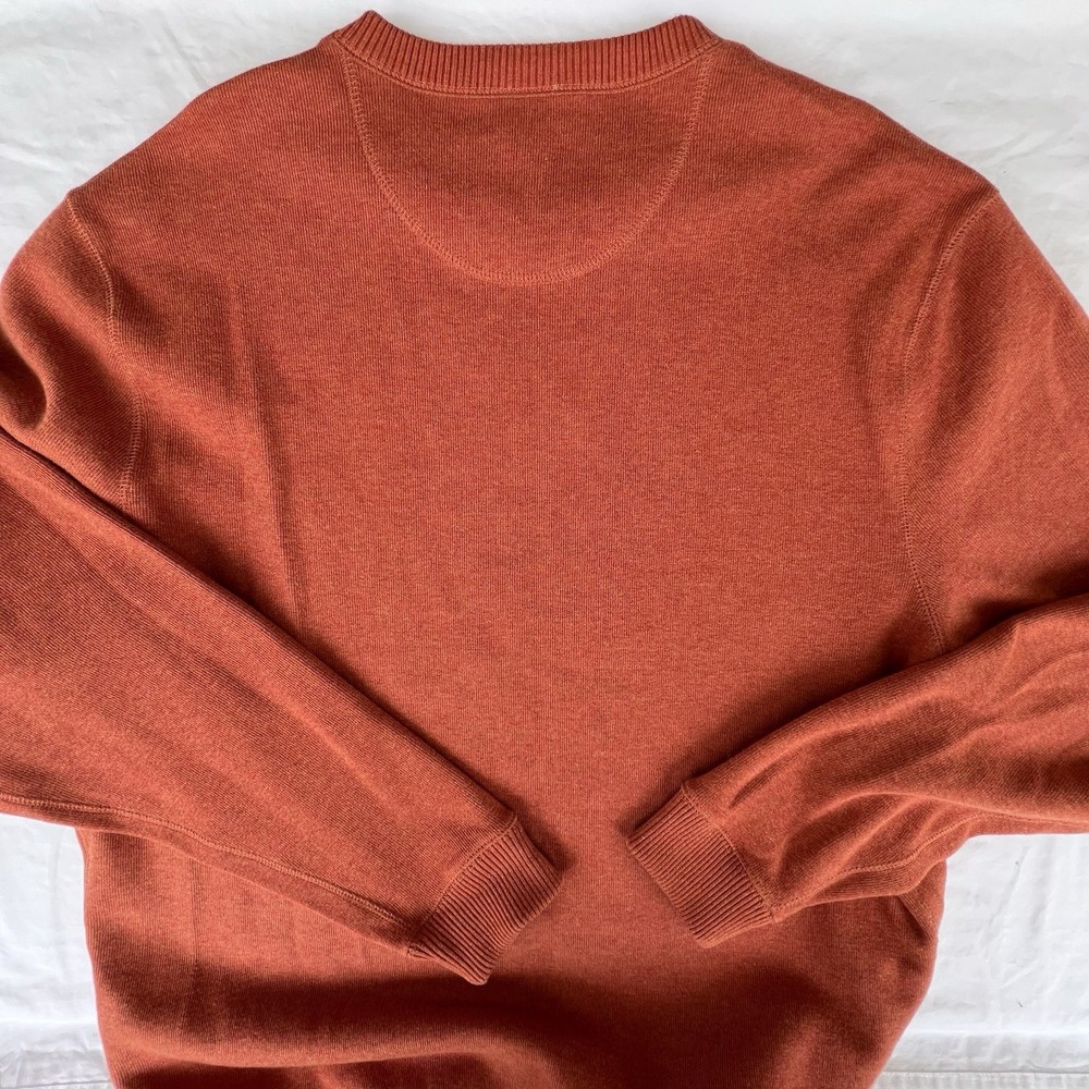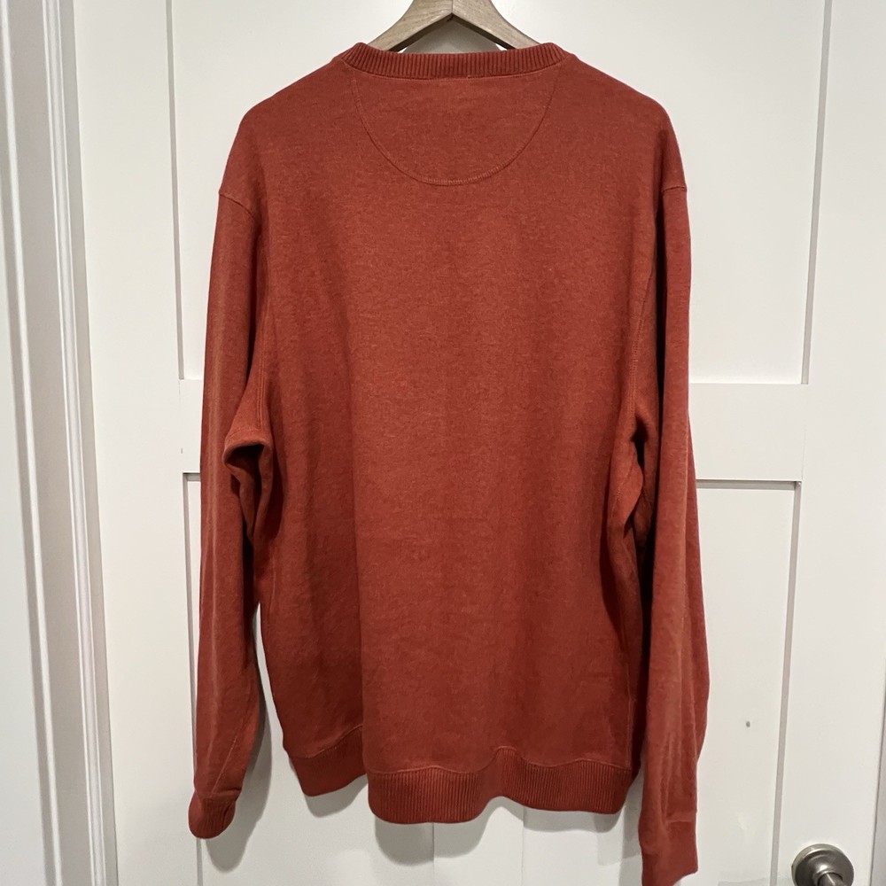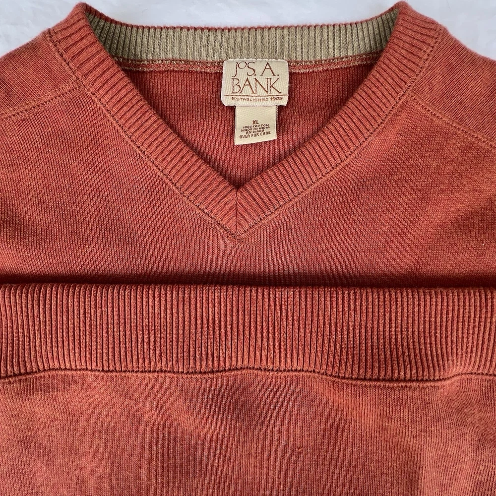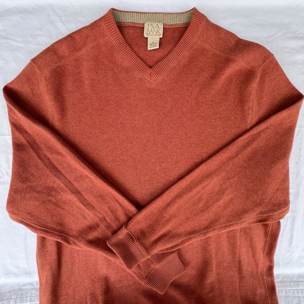 The Jos. A. Bank Men's Long Sleeve XL Orange Pullover Lined Mid-Weight Sweater is a classic and preppy piece made of cotton with a tight-knit fabric. This sweater features a V-neckline and long sleeves, suitable for casual, business, or travel occasions. The sweater is lined for added warmth and comfort, making it ideal for winter, fall, and spring seasons. With a regular fit and machine washable care, this sweater is a versatile and stylish addition to any man's wardrobe. Length 30” Sleeve 27” Pit to pit 26” 100% Cotton Nice pre-owned condition