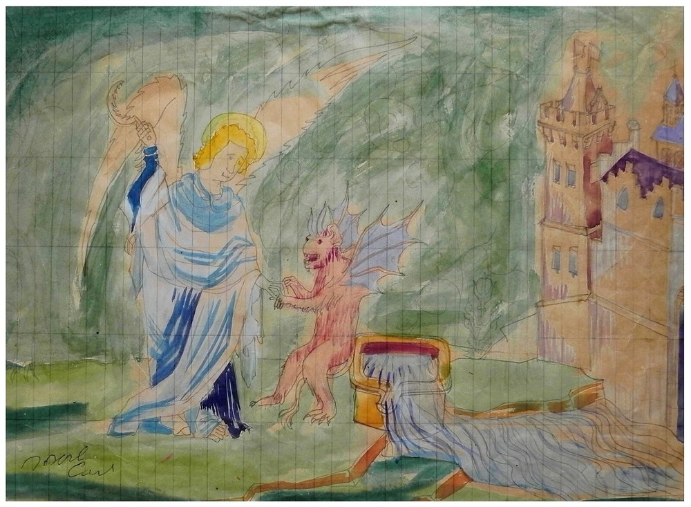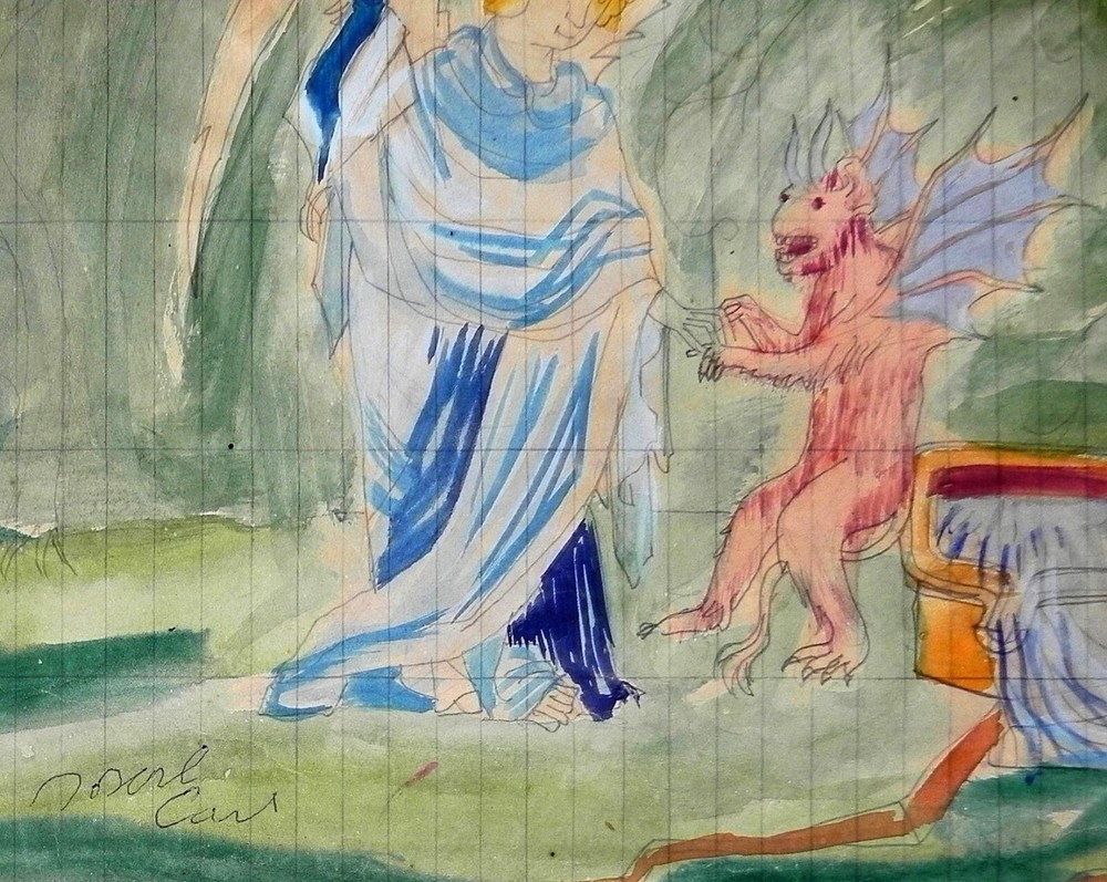 This stunning original watercolor by Joseph Carl captures the dramatic tension between an angel and demon with bold expressionist flair. The dynamic composition and vibrant colors bring the theatrical stage design to life, showcasing Carl's unique Austrian-Israeli artistic vision. A rare, hand-signed mid-century gem that would elevate any art collection.
