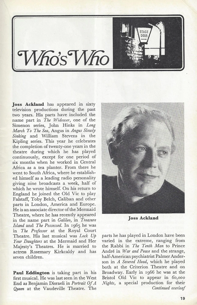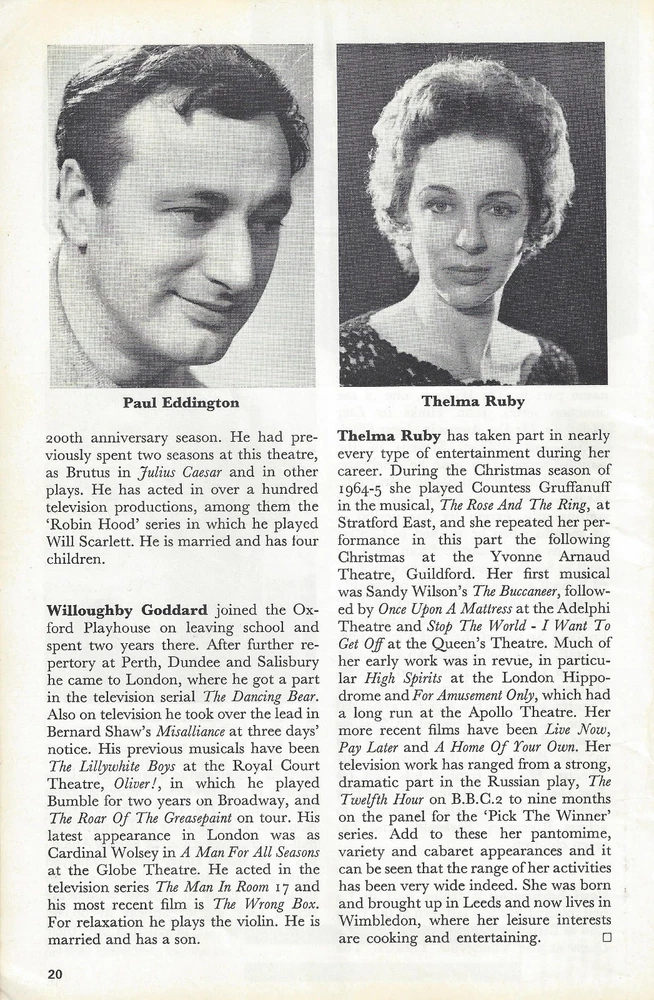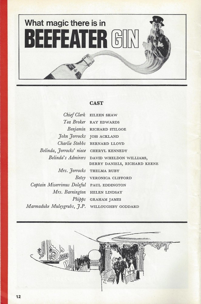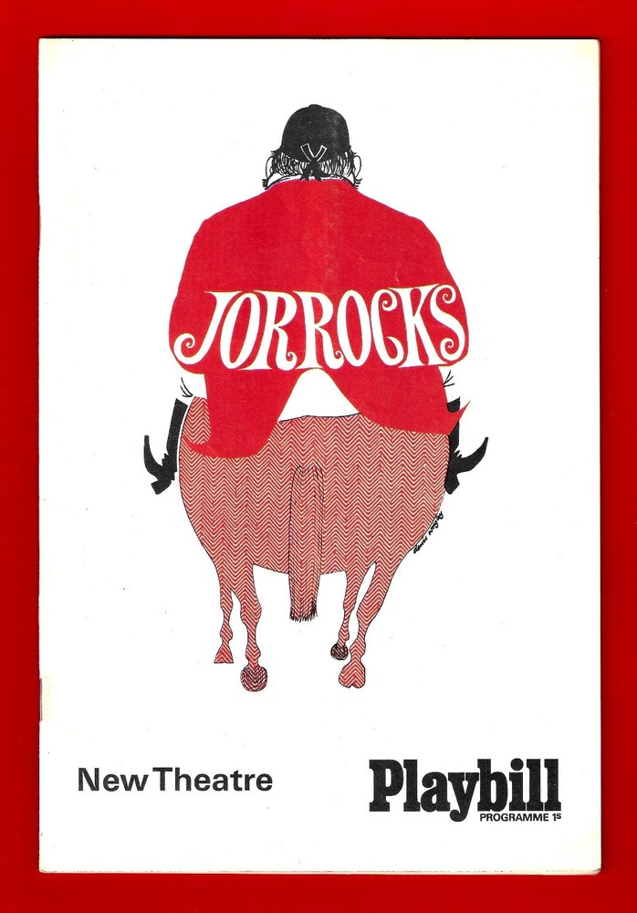 This is a rare February 1967 programme (playbill) from the closing weeks of the Original West End production of the DAVID HENEKER and BEVERLEY CROSS musical "JORROCKS" at the New Theatre in London. (The production opened September 22nd, 1966 at London's New Theatre and closed February 25th, 1967 after 181 performances. The show never arrived in New York.) ..... The musical starred JOSS ACKLAND, PAUL EDDINGTON, WILLOUGHBY GODDARD and THELMA RUBY and featured CHERYL KENNEDY, BERNARD LLOYD, PETER WHITBREAD, MICHAEL MALNICK, HELEN LINDSAY, EILEEN SHAW, RAY EDWARDS, RICHARD STILGOE, DAVID WHELDON WILLIAMS, DERRY DANIELS, RICHARD KEENE, VERONICA CLIFFORD, GRAHAM JAMES, TED RICHARDS, GWYN JONES, ROY DURBIN, GEORGE GILES, LEWIS HENRY, TONY KEMP, BARRY LINES , WALLACE STEVENSON, LINDA BYWATERS, JACKIE DALTON, VALERIE MINIFIE, SUE ROBINSON, MARJORIE WARD, RUTHANN WEBB, EVE TUNSTALL, GAY SOPER, ELIZABETH ENGLISH, JILL LONGSTAFFE, EILEEN SHAW and HARRY GOODIER ..... CREDITS: Music and Lyrics by DAVID HENEKER; Book by BEVERLEY CROSS based on the novel by R. S. SURTEES; Sets and Costumes designed by DISLEY JONES; Choreographed by IRVING DAVIES; Directed by VAL MAY; Produced by DONALD ALBERY ..... DETAILS: The 36 page playbill measures 6" X 9" inches and includes full production credits, cast list, synopsis of scenes, list of musical numbers and individual photos or bios of the three leading actors ..... CONDITION: With the exception of light creasing, this playbill is in excellent condition and will make a wonderful addition to the collection of any musical theatre aficionado or historian. This item will be carefully packaged in a protective, carded sleeve and backed by stiff cardboard.
