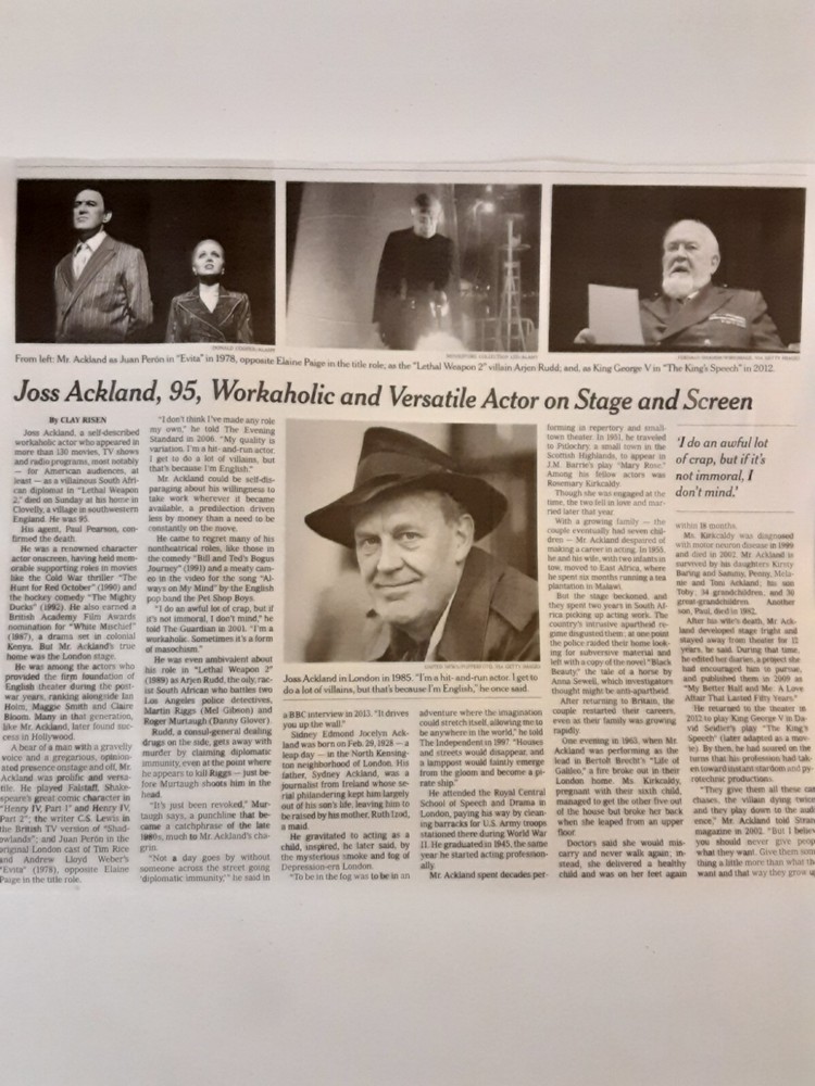Actor Joss Ackland's New York Times obituary. This is a clipping from the newspaper and is not a copy. It will be shipped without any folding to the body of the text in a 10x13 large envelope. Free first class USPS s&h.