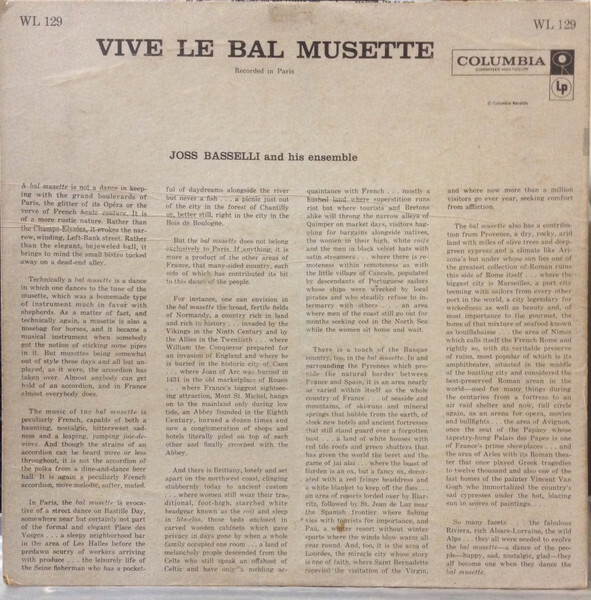 Joss Baselli Et Son Ensemble, Vive Le Bal Musette, LP, Album, Mono Comment(s) and Condition Notes specific to this listing: ***Record shows no obvious signs of wear. Small sticker on cover. *** Media Condition: Near Mint (NM or M-) Based on visual inspection. Album Cover / 7" Picture Sleeve (GENERIC = NONE) / CD Insert Condition: Very Good Plus (VG+) STOCK PHOTOS HAVE BEEN USED WITH LISTING: Photos shown have been pulled from an online database. A picture / company sleeve / CD insert in the photo does not guarantee it is included. If a picture sleeve / insert is included, its Condition will be filled in above this line. SPECIFICATIONS ARE AUTO-FILLED: If there is something specific you require, please ask us to confirm. Thank you for having a look at our collection! Be sure to follow us so you're notified when we post new items. IMPORTANT NOTE: A picture sleeve in the stock photo of a vinyl record does not guarantee a picture sleeve is included with this item. If the vinyl record sleeve condition specifies "Generic" THERE IS NO PICTURE SLEEVE (item will come in a company sleeve or plain sleeve.) Track List : A1. La Bardinette 2:15 A2. Zon . . . Zon . . . Zon . . . 2:40 A3. Apollo Valse 2:45 A4. Oh! La La 2:40 A5. Julie La Rousse 2:27 A6. Moi, J'aime Le Music-Hall 2:25 B1. La Foule 2:55 B2. Ca, C'est Chouette 2:50 B3. Ou Sont Les Pepees? 2:30 B4. Ah! La La La La! 2:43 B5. Ou Sont-Ils Donc? 2:58 B6. Reviens, Reviens-Moi 2:35 Catalog Number: WL 129 Notes on shipping: All items are packed carefully and shipped quickly. Domestic postage is included with the price. International customers buying multiple items: Please group items into a single order and hold payment until package weight/dimensions can be adjusted. Notes on Media Grading (visual inspection only): Mint: Only used for sealed items. Near Mint: As close to Mint condition as any used item can be. The media shows no obvious signs of wear. Part of an exceptional collection, curated with care, carefully handled, and properly stored. Very Good Plus: A minimal amount of storage or play wear, if present, will be superficial, difficult to see, and will not detract from sound quality. Very Good: Pronounced storage or play wear and, maybe, a few superficial scratches are present. There may be some noise during playback but no skips. Good Plus or Good: Significant noise can be expected on playback due to visible scratches and/or groove wear. LP Record Cover Grading: Mint: Only used for sealed items. Near Mint: Sharp spine with crisp edges. May have age-related (but minor) wear & tear. A very nice sleeve suitable for most collectors. Very Good Plus: Sleeve may have a small sticker or bit of writing but looks great. Minimal ring wear. Very Good: Acceptable cover but may have drill hole or cut corner. May have split sides, large sticker, or prominent ring wear. Good Plus: Obvious wear and tear. Minor to major flaws including sticker rash, doodles or other distracting writing, major ring wear, soft spine, or sp
