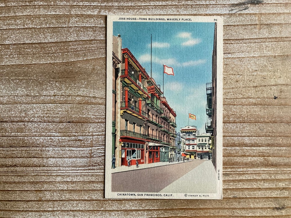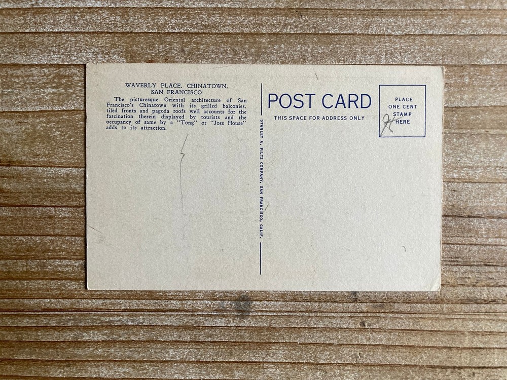 Joss House, Tong Buildings, Waverly Place, Chinatown, San Francisco, Calif. Front of Card Shows: Pretty colorful view of vintage Chinatown. Back of Card Reads: Waverly Place, Chinatown San Francisco The picturesque Oriental architecture of San Francisco’s Chinatown with its grilled balconies, tiled fronts and pagoda roofs well accounts for the fascination therein displayed by tourists and the occupancy of same by a Tong or Joss House adds to its attraction. Dimensions: 5.5 in. x 3.5 in. Condition: In good unused condition with wear to the edges.